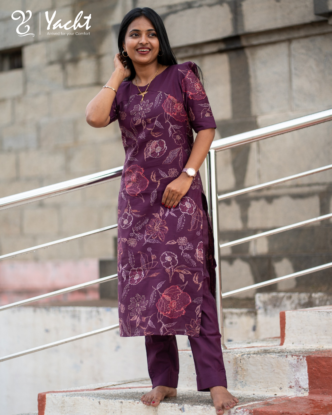 Royal Plum Floral Straight Kurti Set