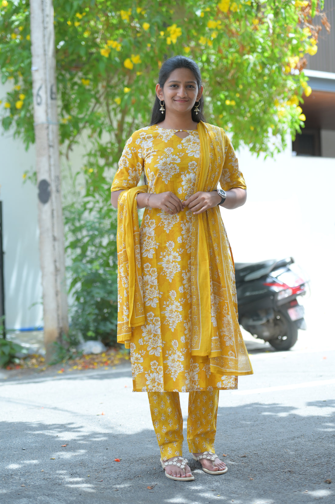 Floral Printed Kurti Set 1937 This is a mustard yellow straight-cut kurti paired with matching pants...
