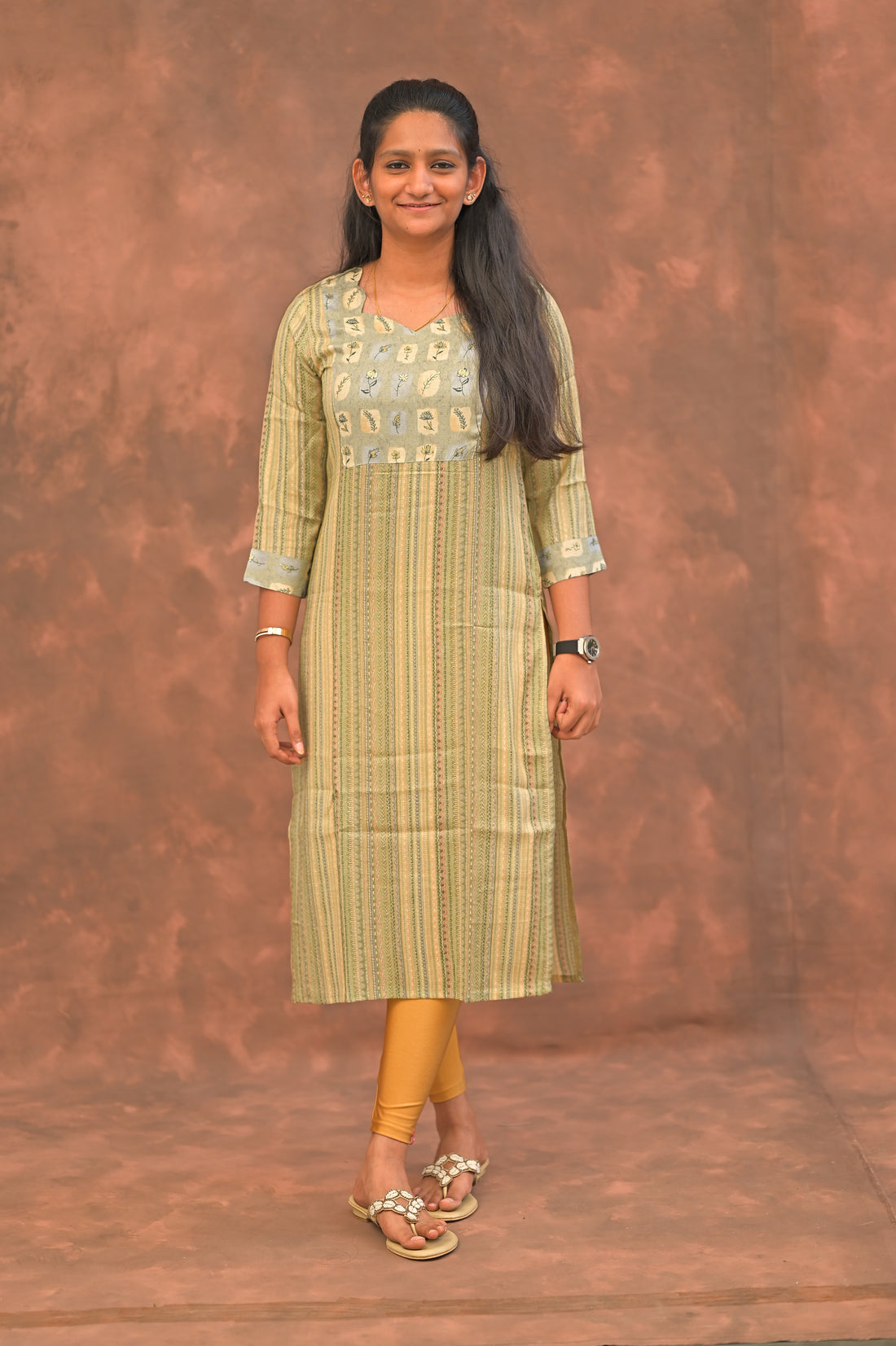 Ivory Striped Elegance Kurti 1927 This chic beige kurti with vertical white stripes brings a clean...