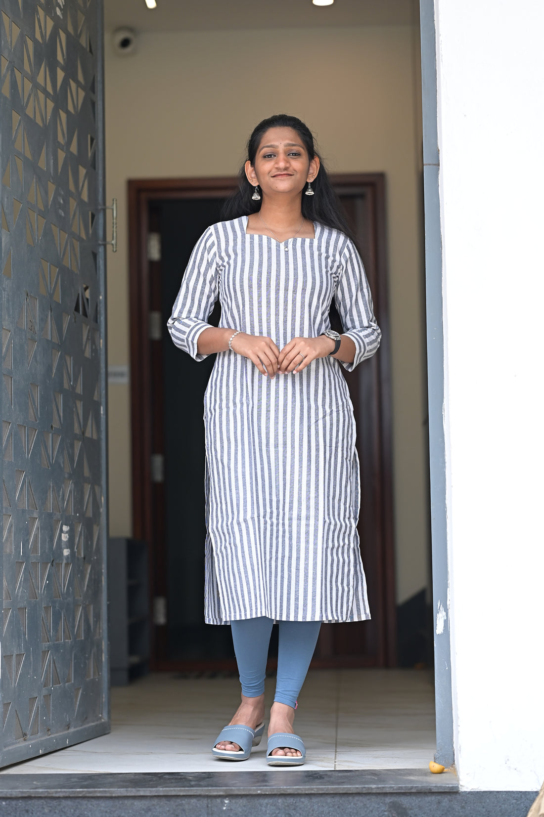 Ivory Stripe Smart Kurti 1928 A timeless grey and white vertical striped kurti that adds...