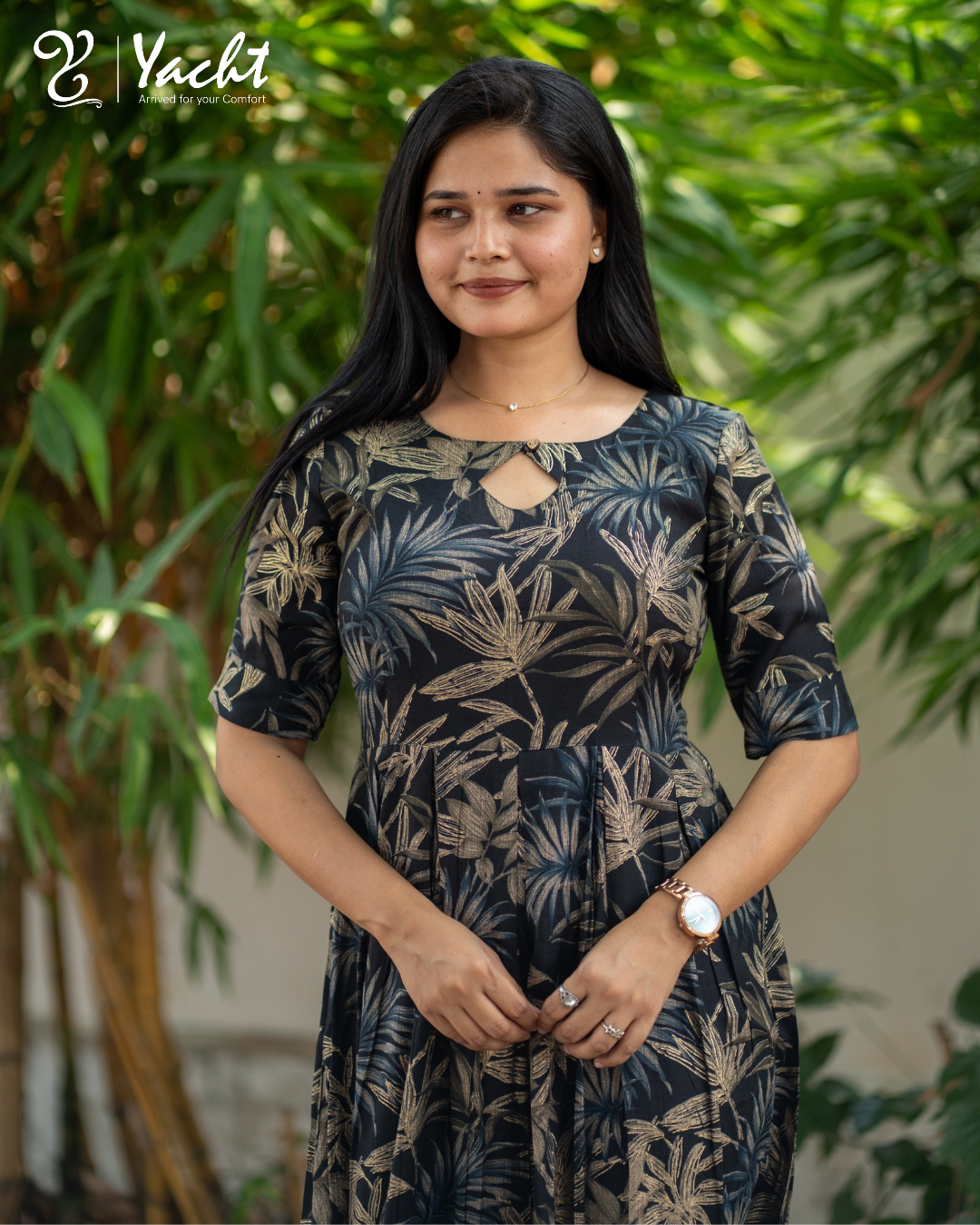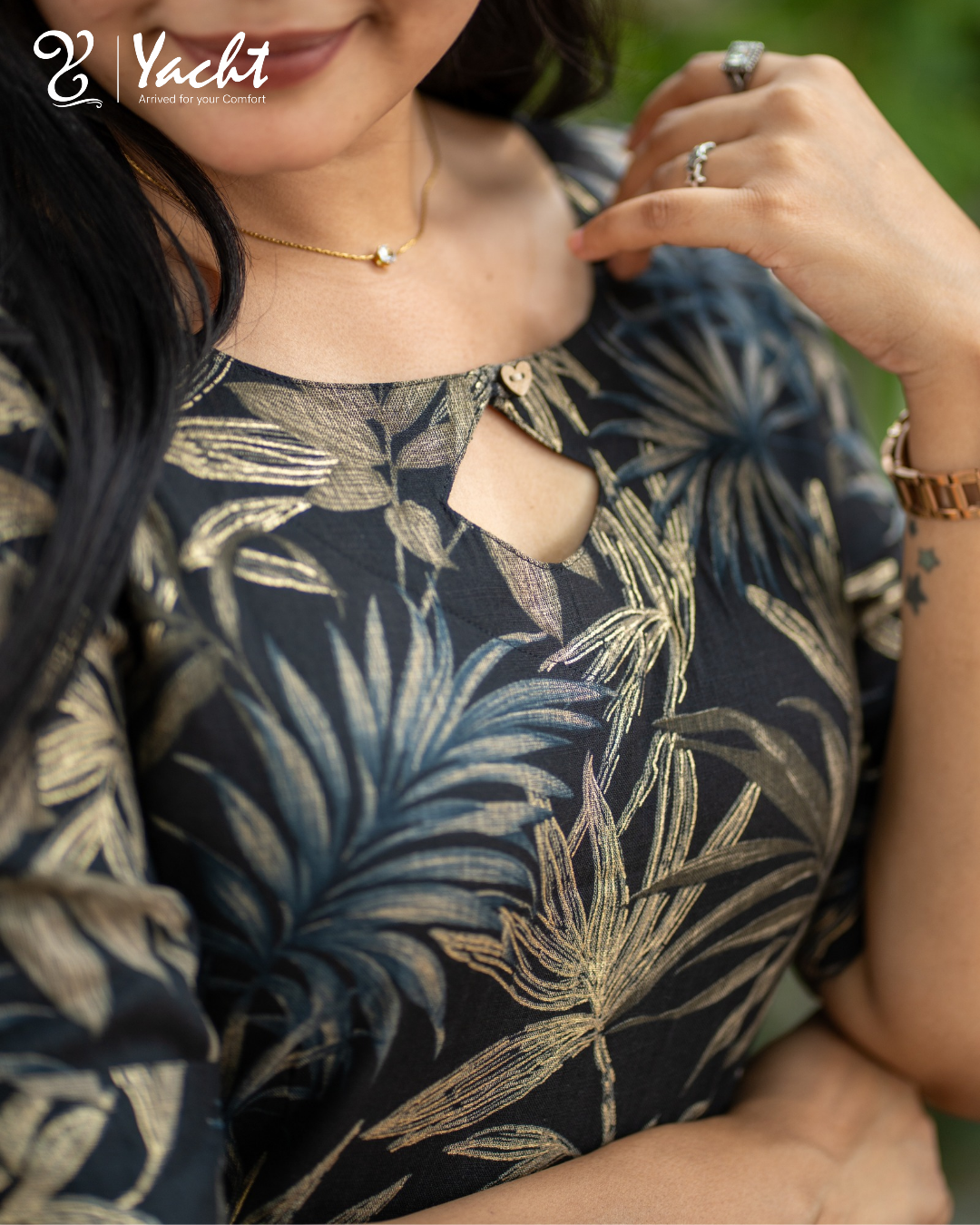 Elegant maxi silhouette with all-over tropical leaf print and a stylish keyhole neckline