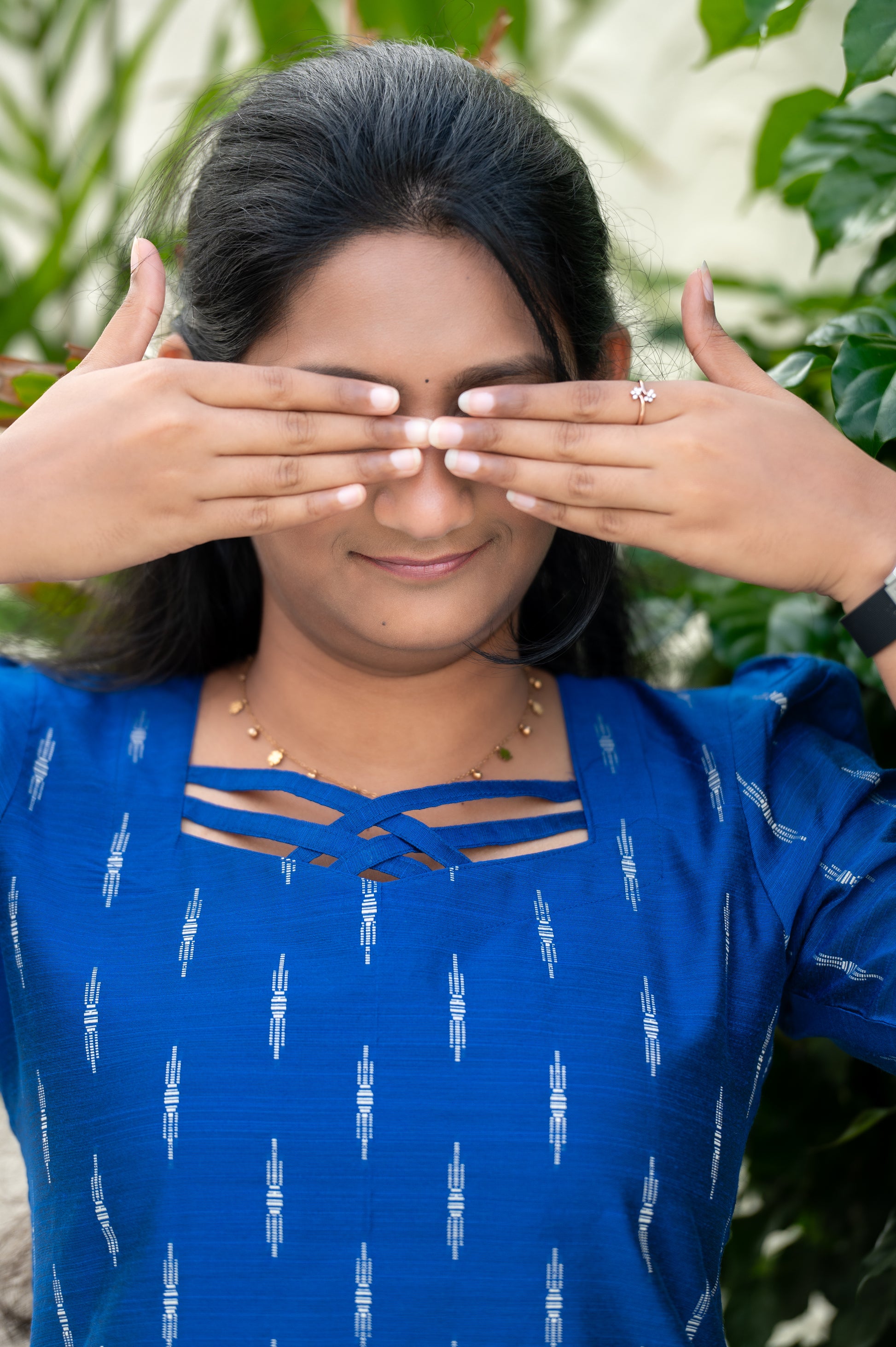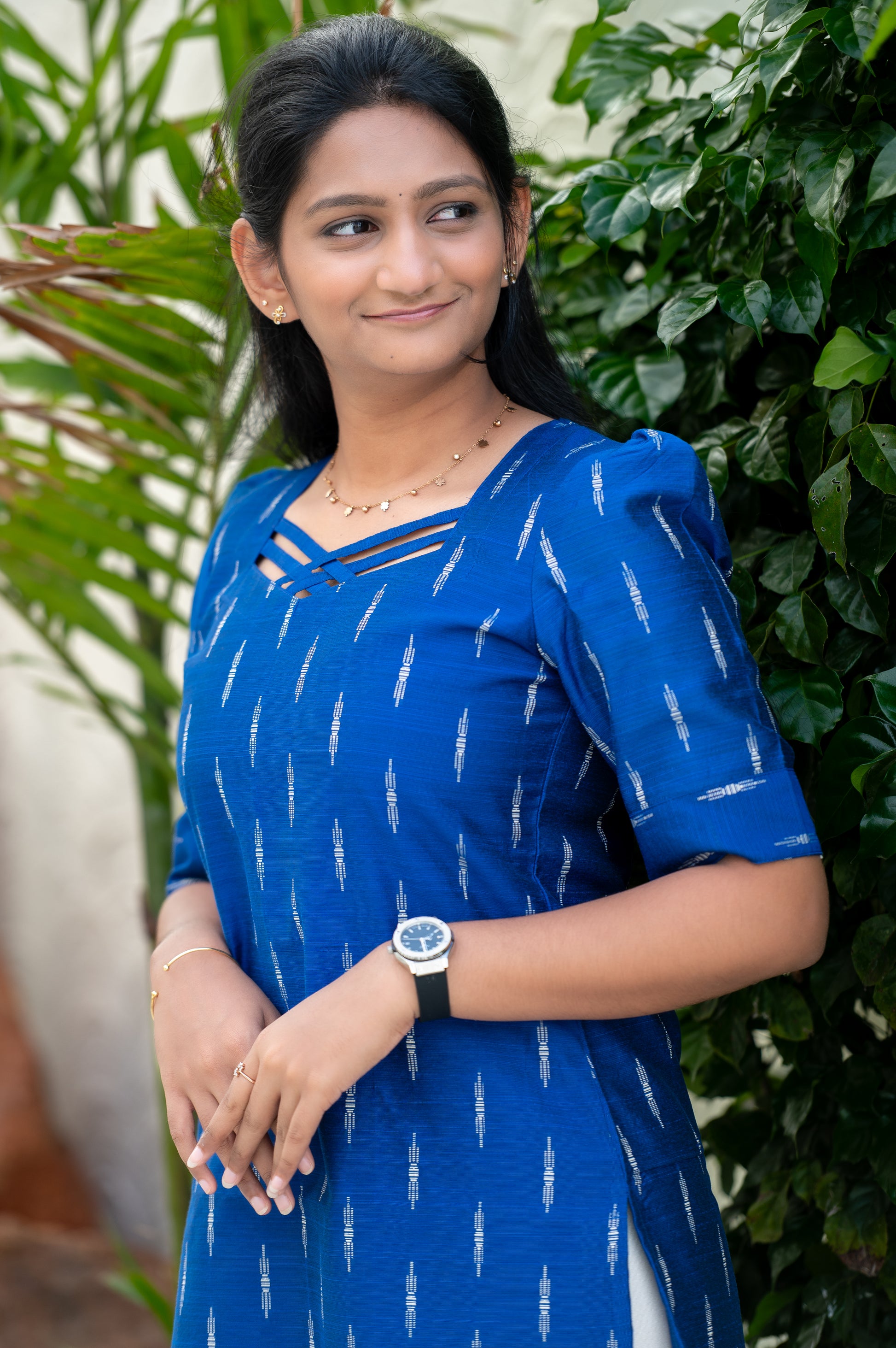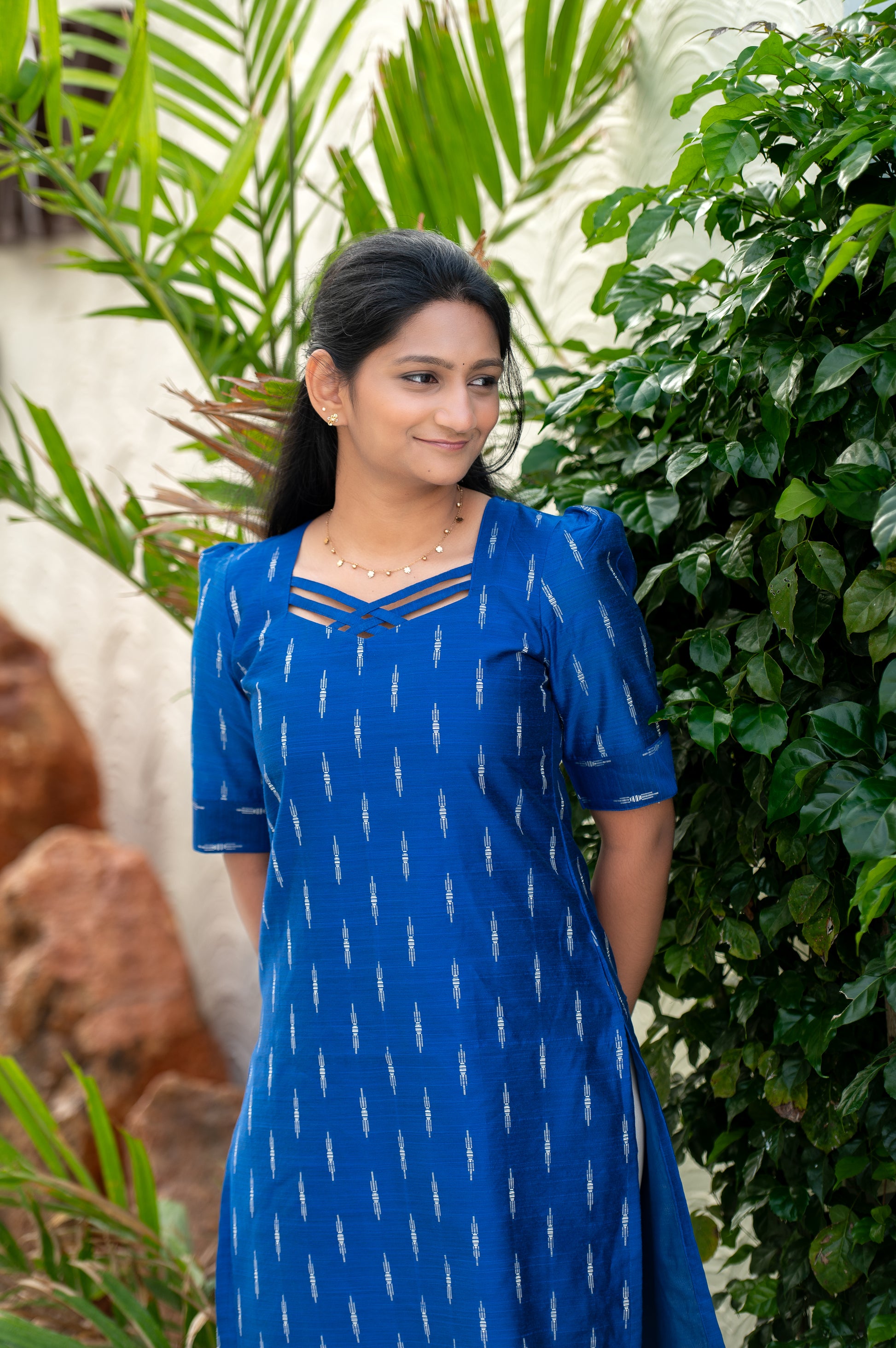 Elevate your ethnic wardrobe with this Royal Blue Ikat Kurti featuring a modern square neckline with keyhole and strap accents. The timeless ikat pattern in white adds a traditional flair, while the tailored fit and stylish neckline bring a contemporary twist — perfect for workwear, brunch, or festive casuals.