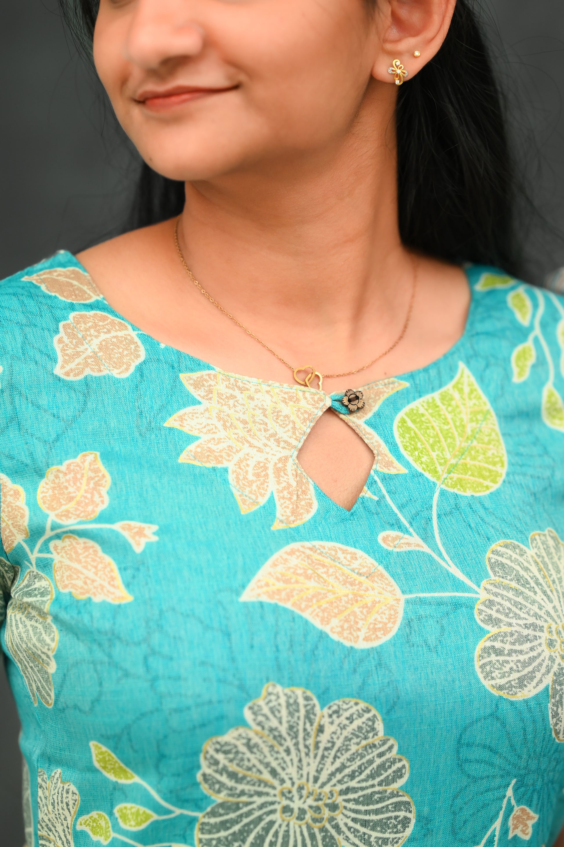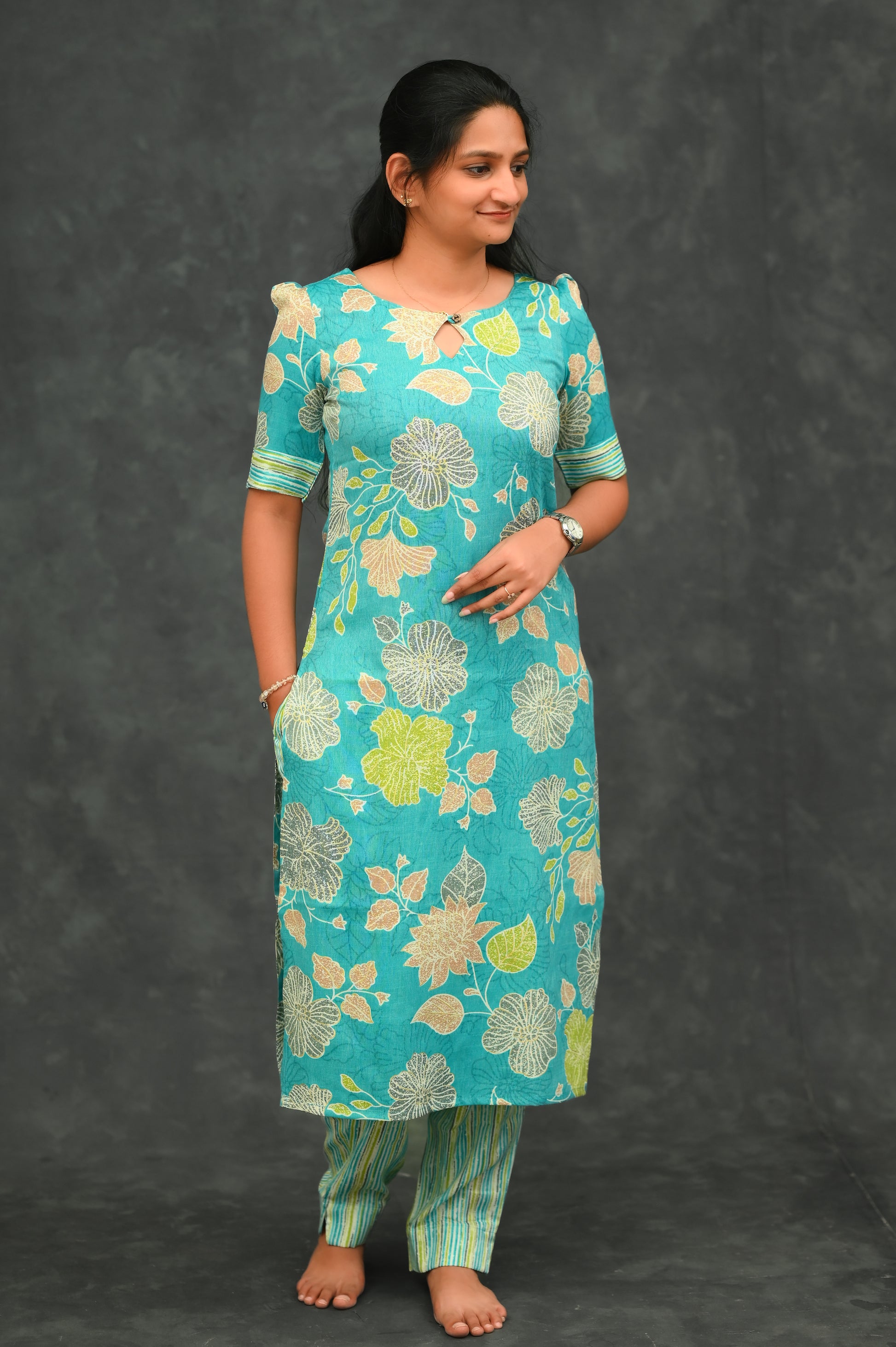 Straight-fit kurti set with a modest round neckline featuring a small keyhole detail. Short sleeves with striped border accents. All-over floral print gives a fresh, elegant ethnic look. Paired with contrast striped pants.