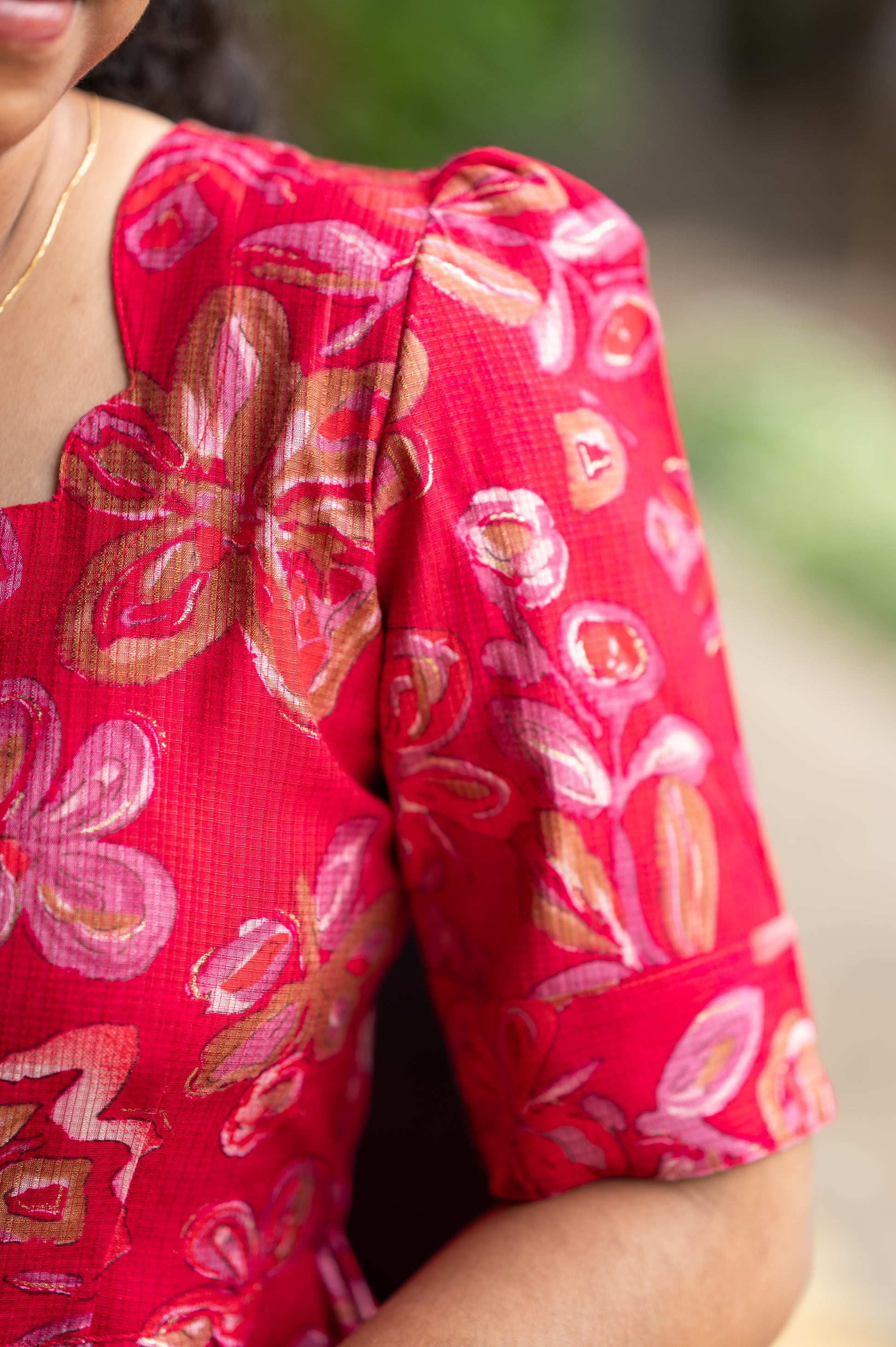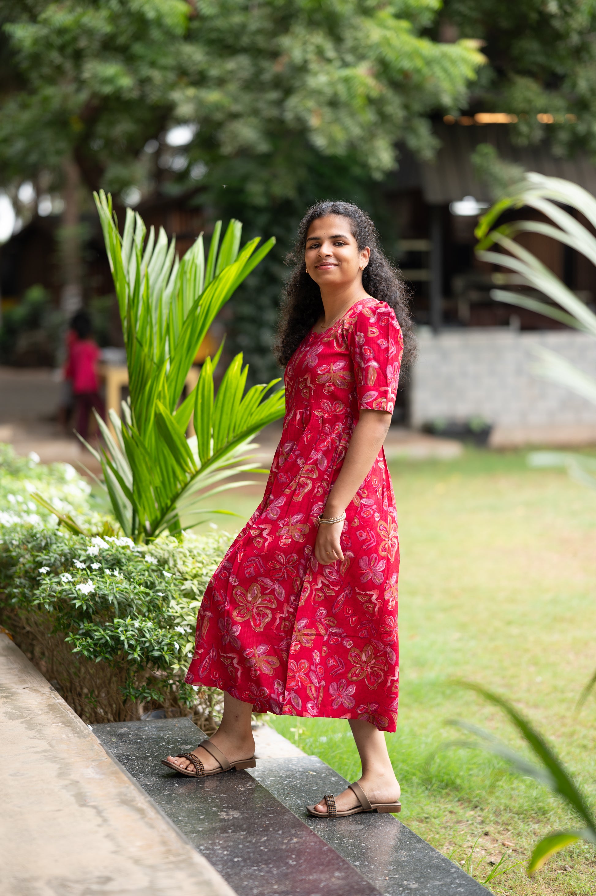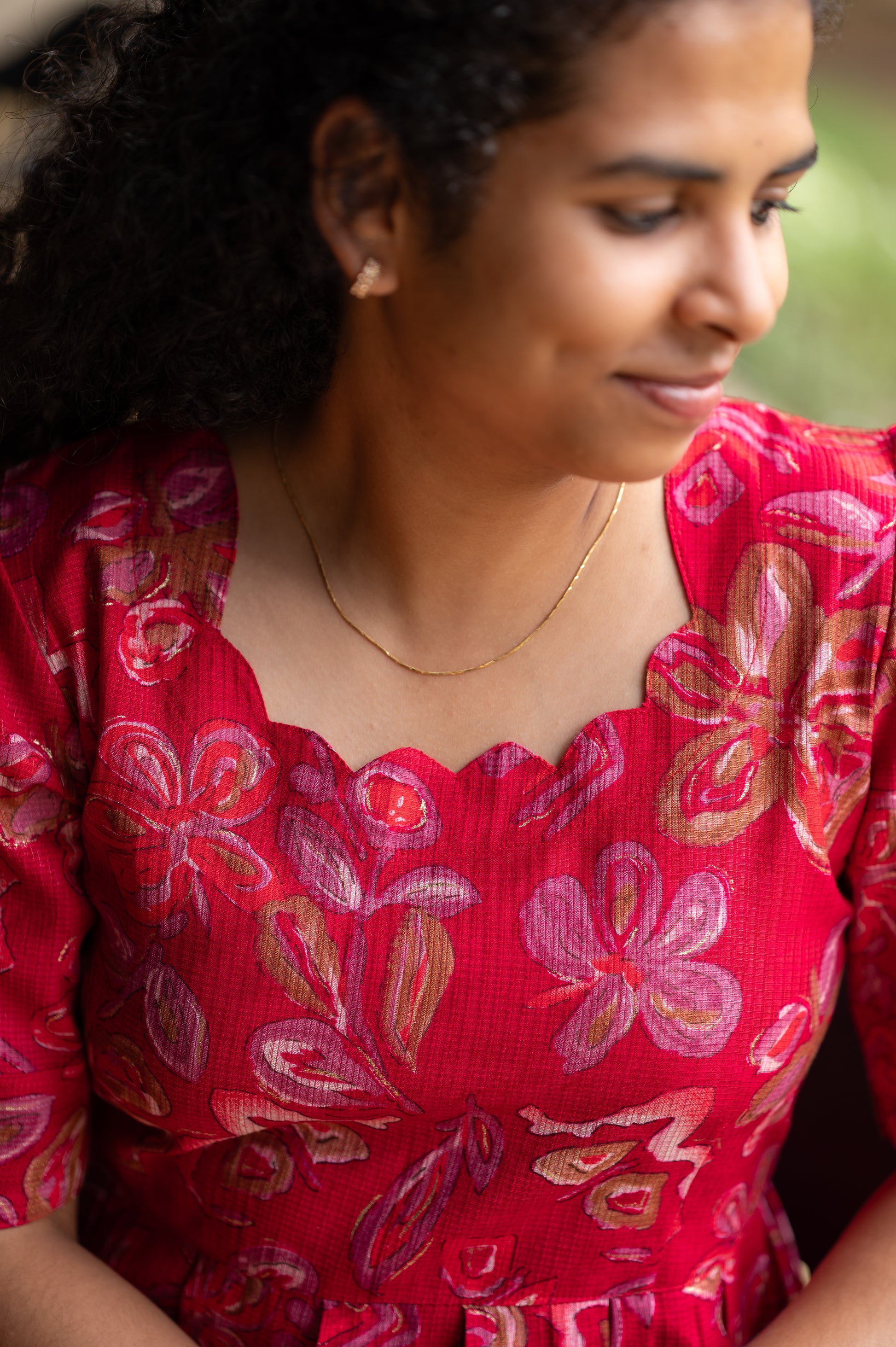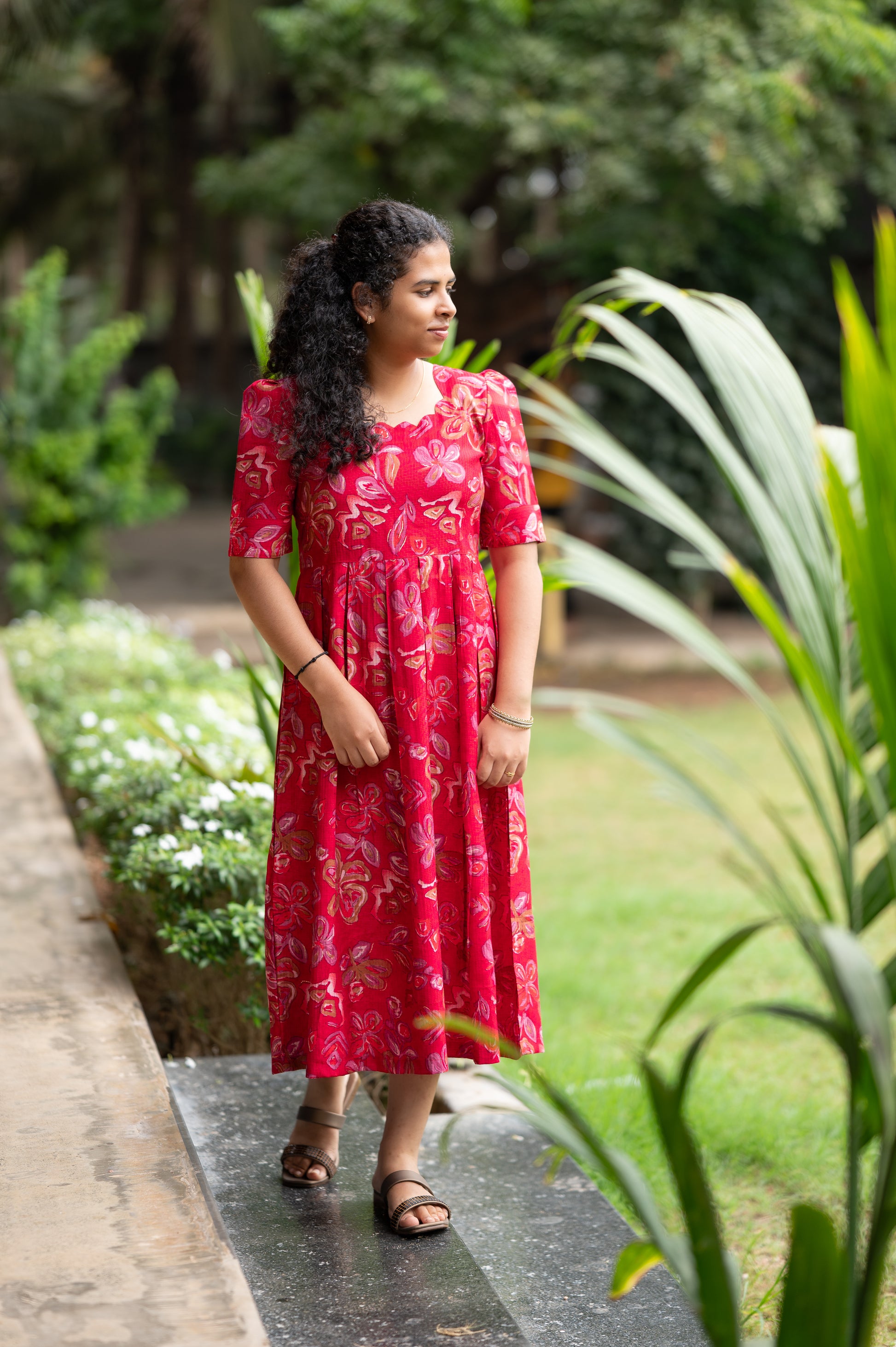 This elegant fit-and-flare dress features a vibrant floral block print on a rich ruby-red base. The scalloped neckline and half sleeves add a charming feminine touch, while the flared silhouette ensures graceful movement and comfort.