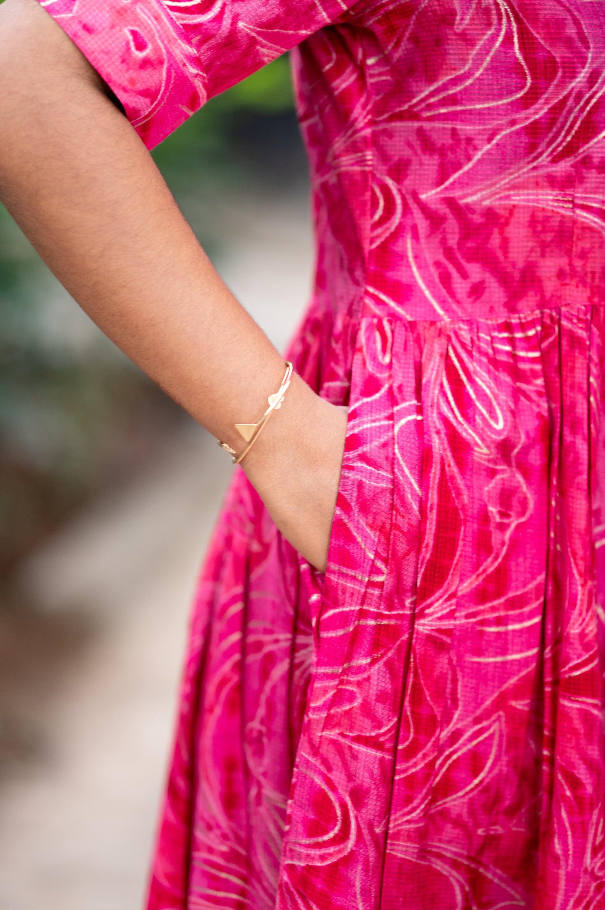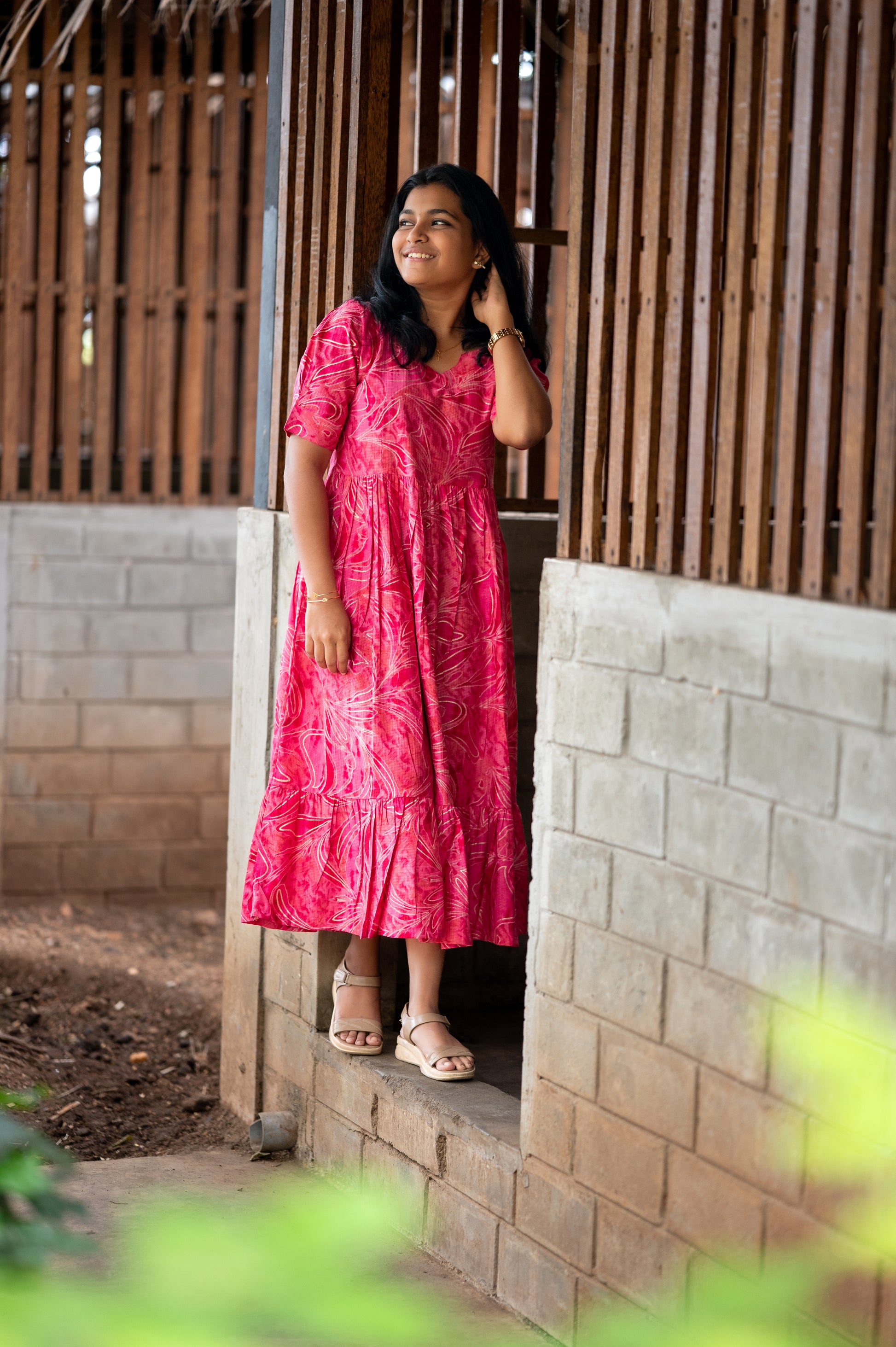 This maxi features a graceful maxi flared silhouette with a gathered tier at the hem, offering volume and effortless flow. The sweetheart neckline and half sleeves add a feminine touch while enhancing the overall charm. The fabric is adorned with a vibrant abstract swirl print, adding energy and movement to the look. Stylish yet breathable — perfect for making a fashion statement with ease.