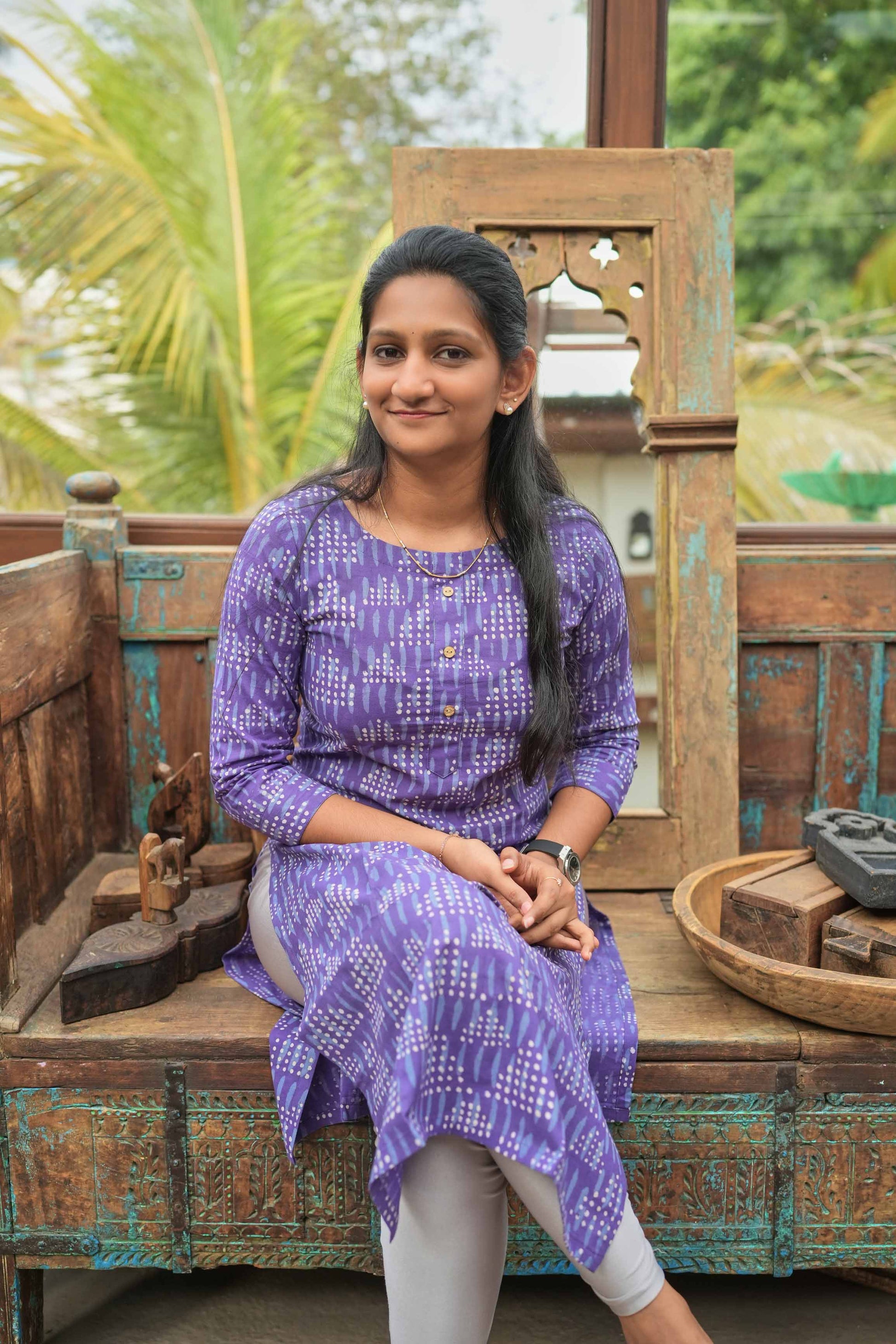 Straight-cut kurti with 3/4th sleeves, round neckline, and front wooden button placket. All-over white dotted batik-style abstract print on a lavender background gives it a graceful touch.