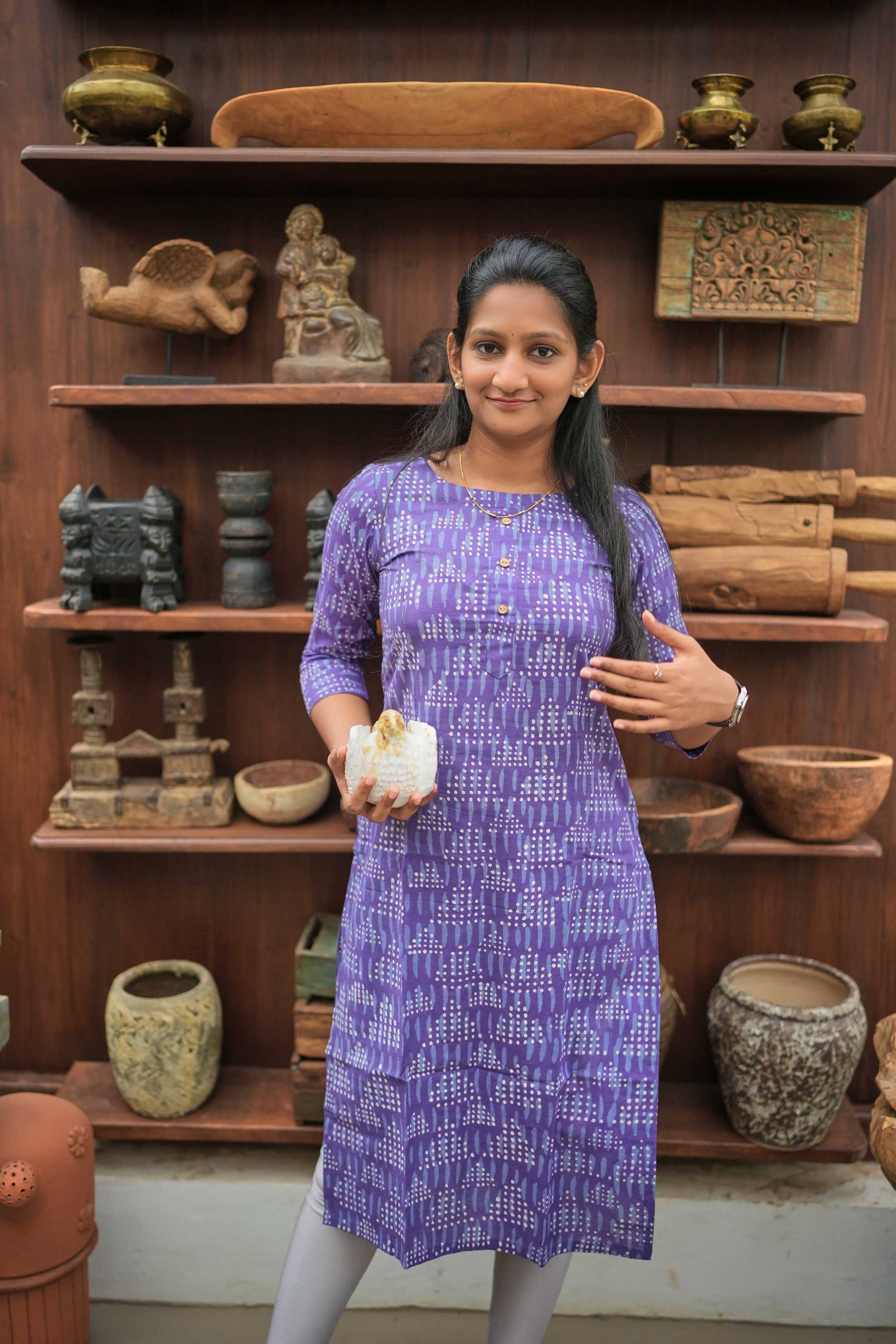 A charming straight-fit kurti in lavender base, highlighted with white dotted abstract prints and wooden button detailing, perfect for a casual yet stylish ethnic look.