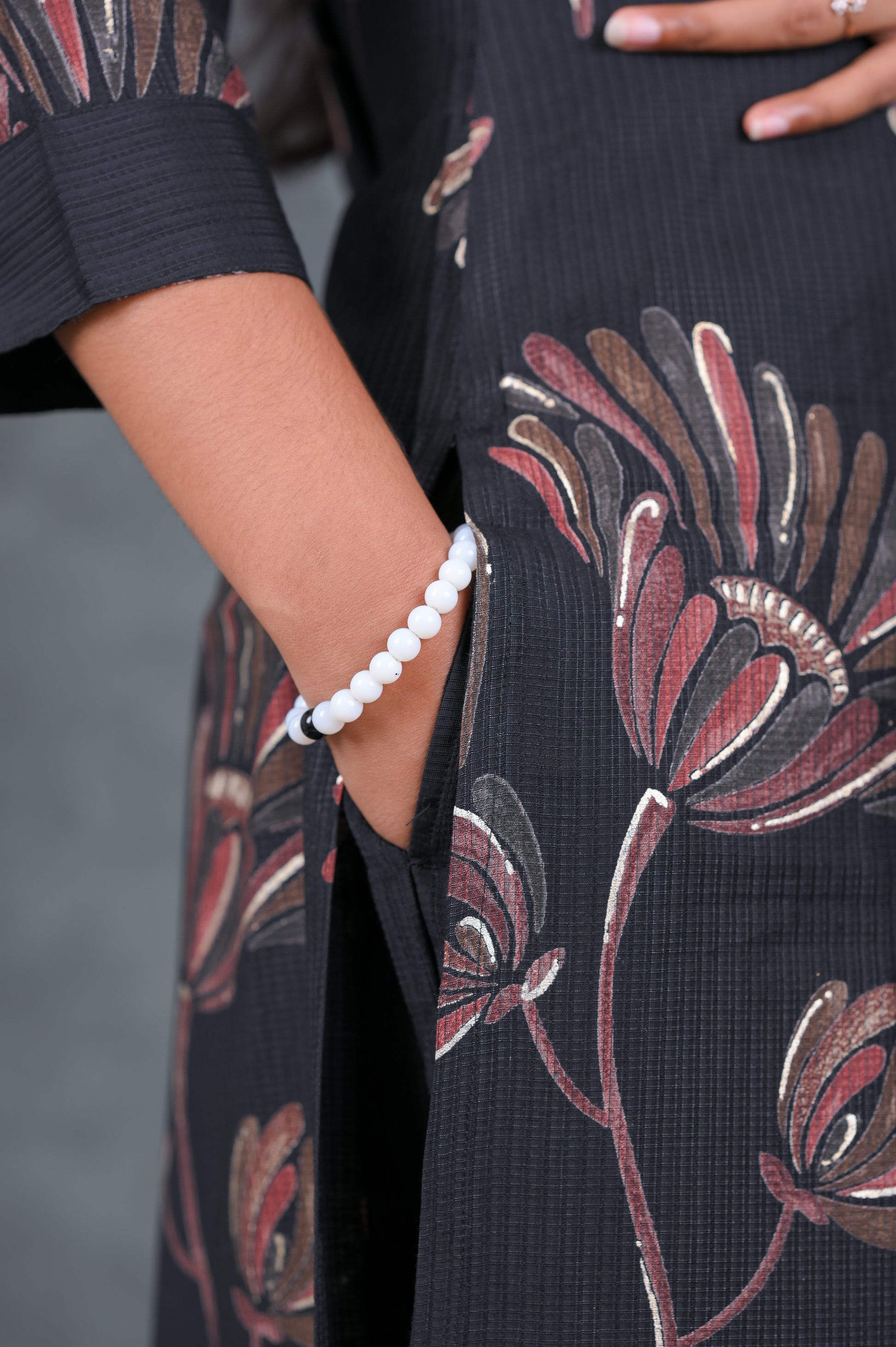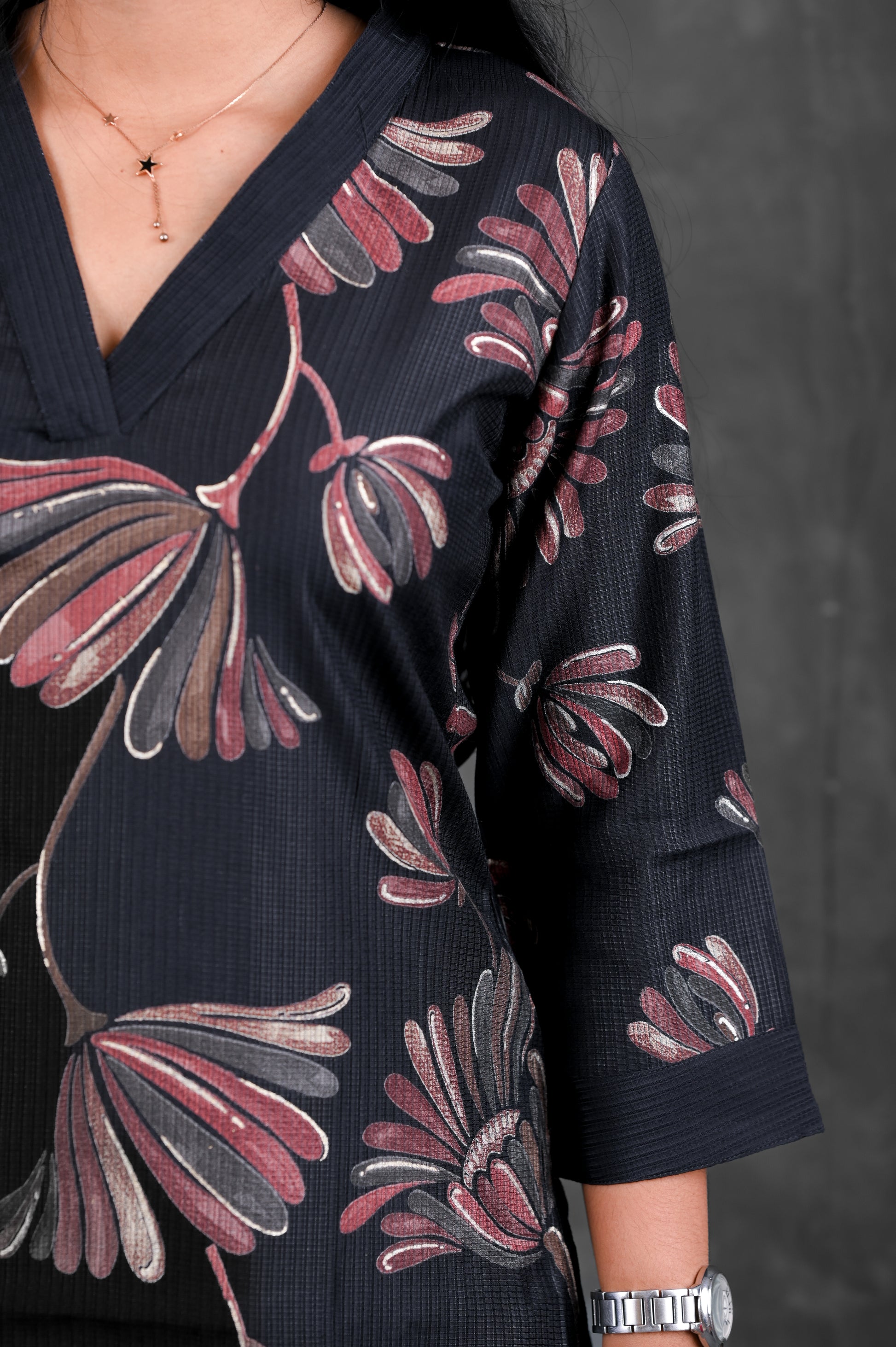 Deep black base with muted maroon and grey floral accents – rich, classy, and timeless