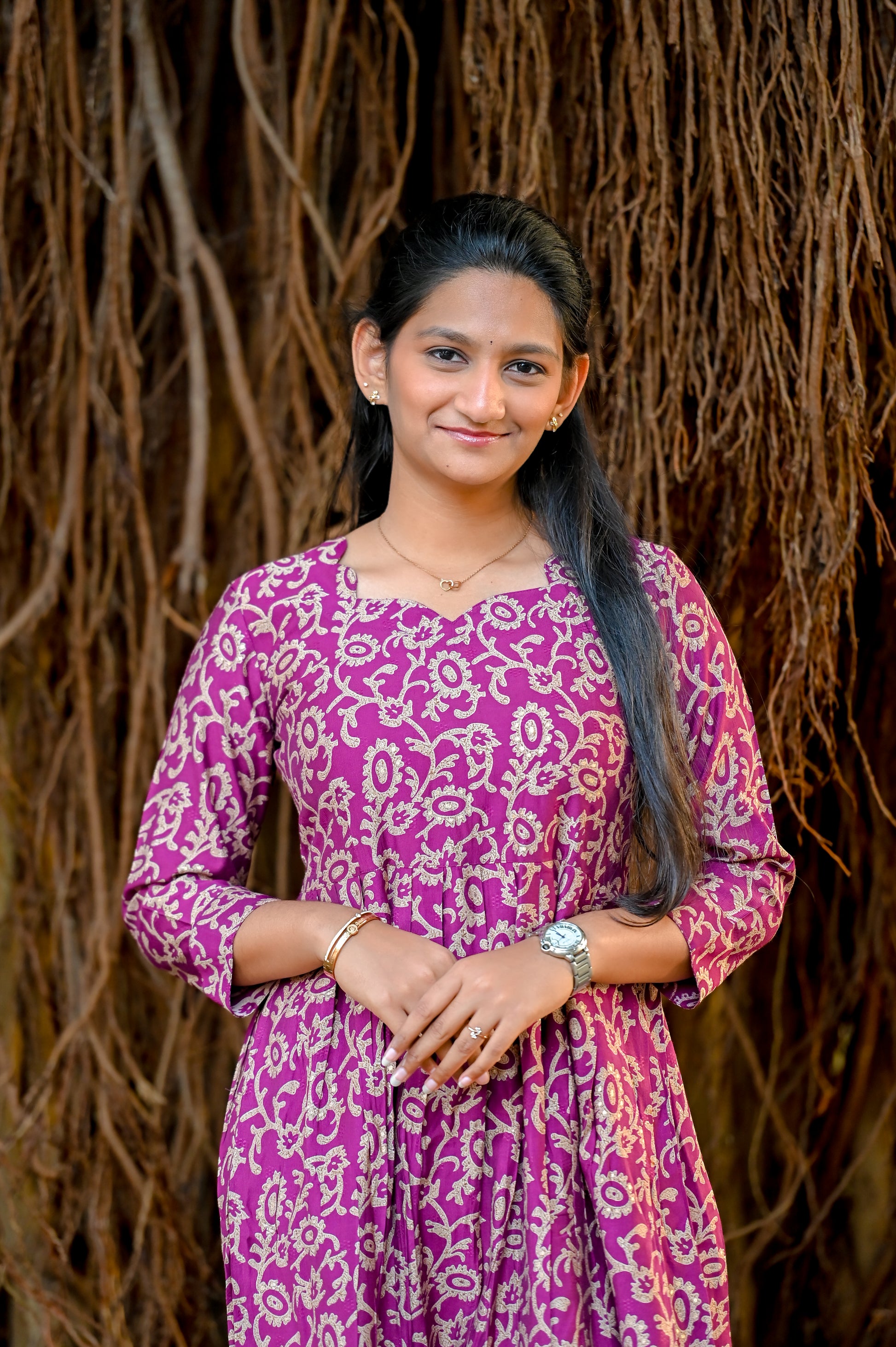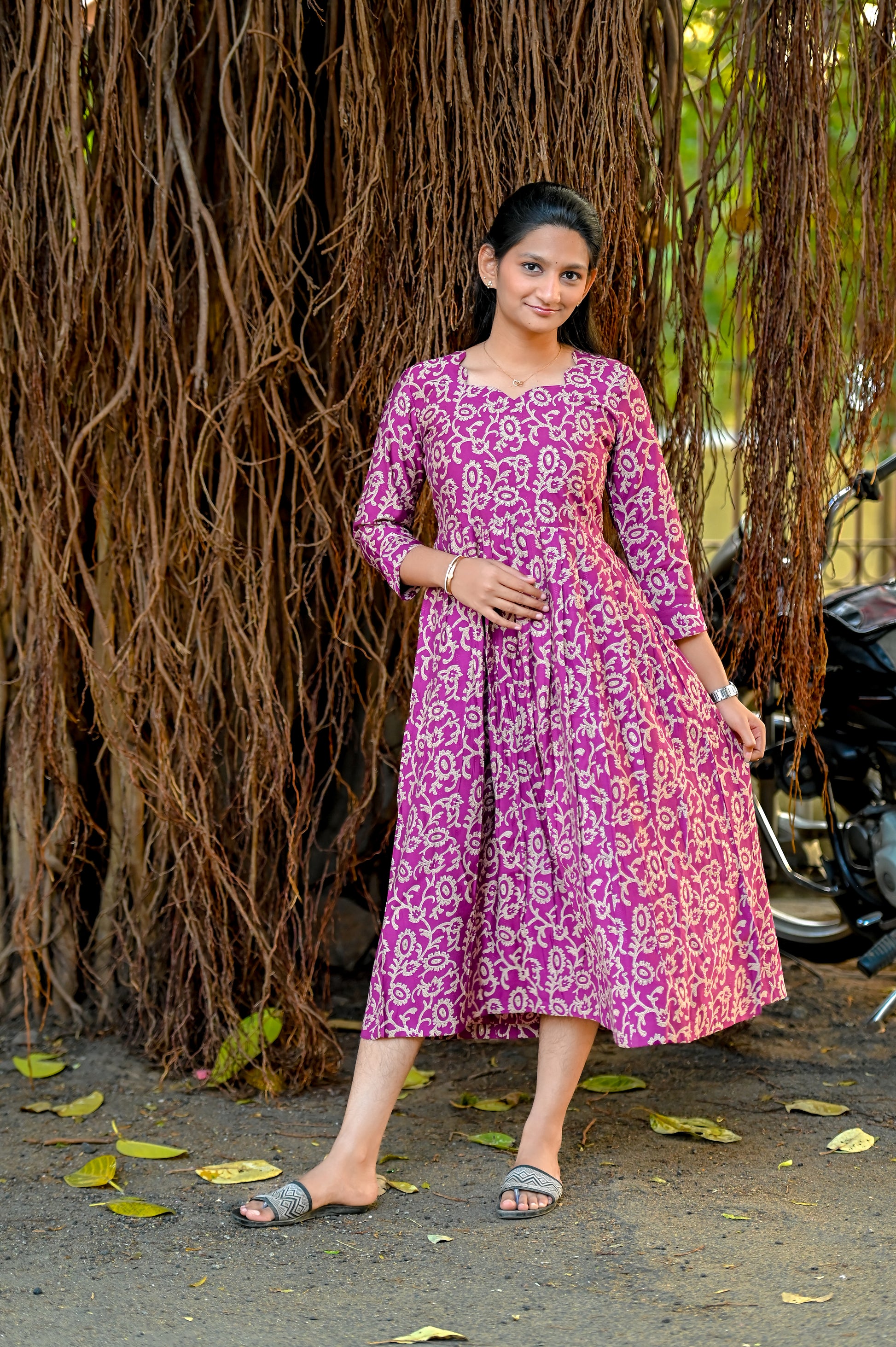A charming maxi with a graceful flare that enhances movement and comfort. It features a soft V-neckline and 3/4th sleeves, complemented by an all-over floral block-inspired print. The gently gathered waistline creates a flattering silhouette, making it perfect for casual outings, office wear, or relaxed festive days.