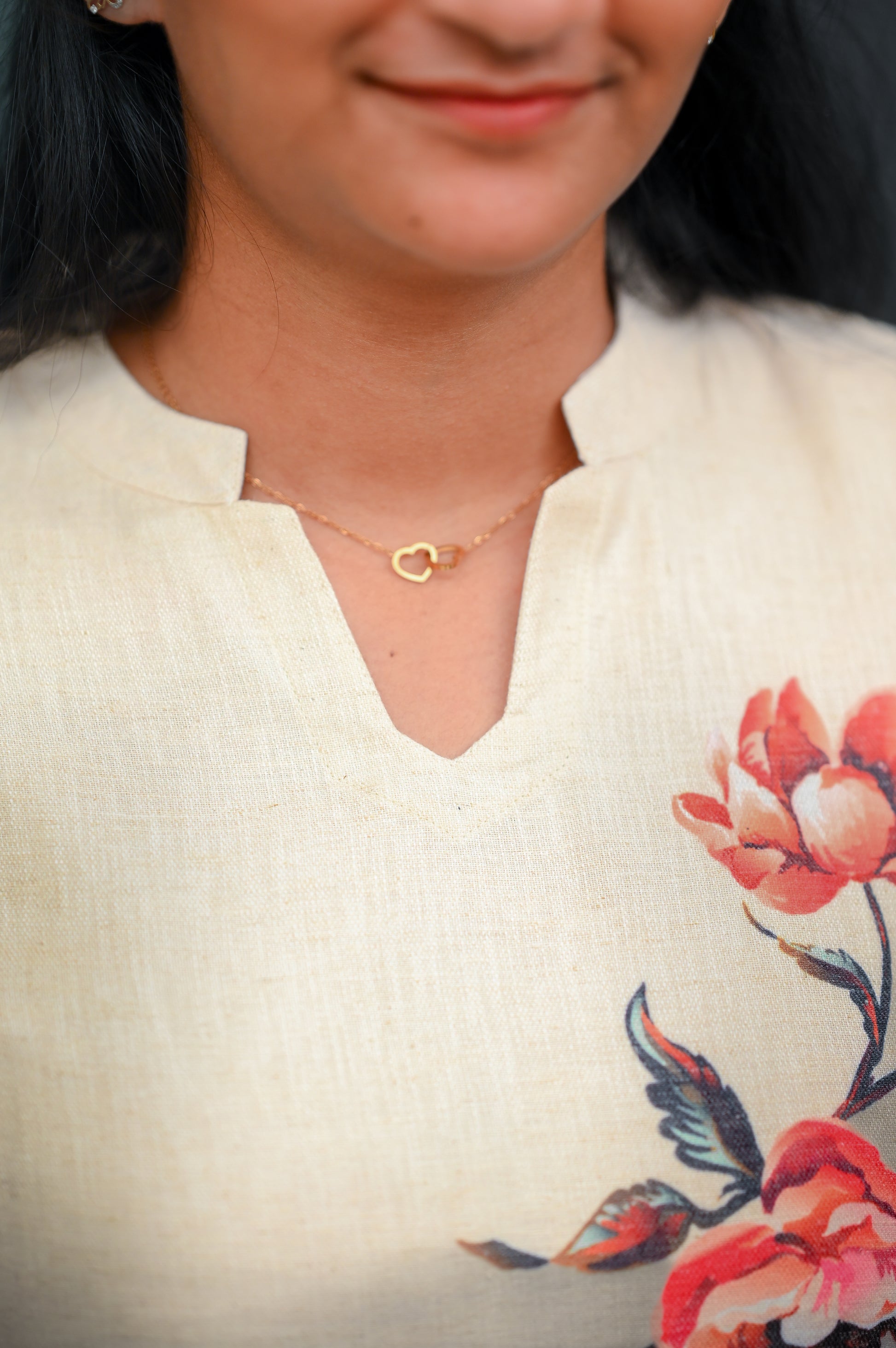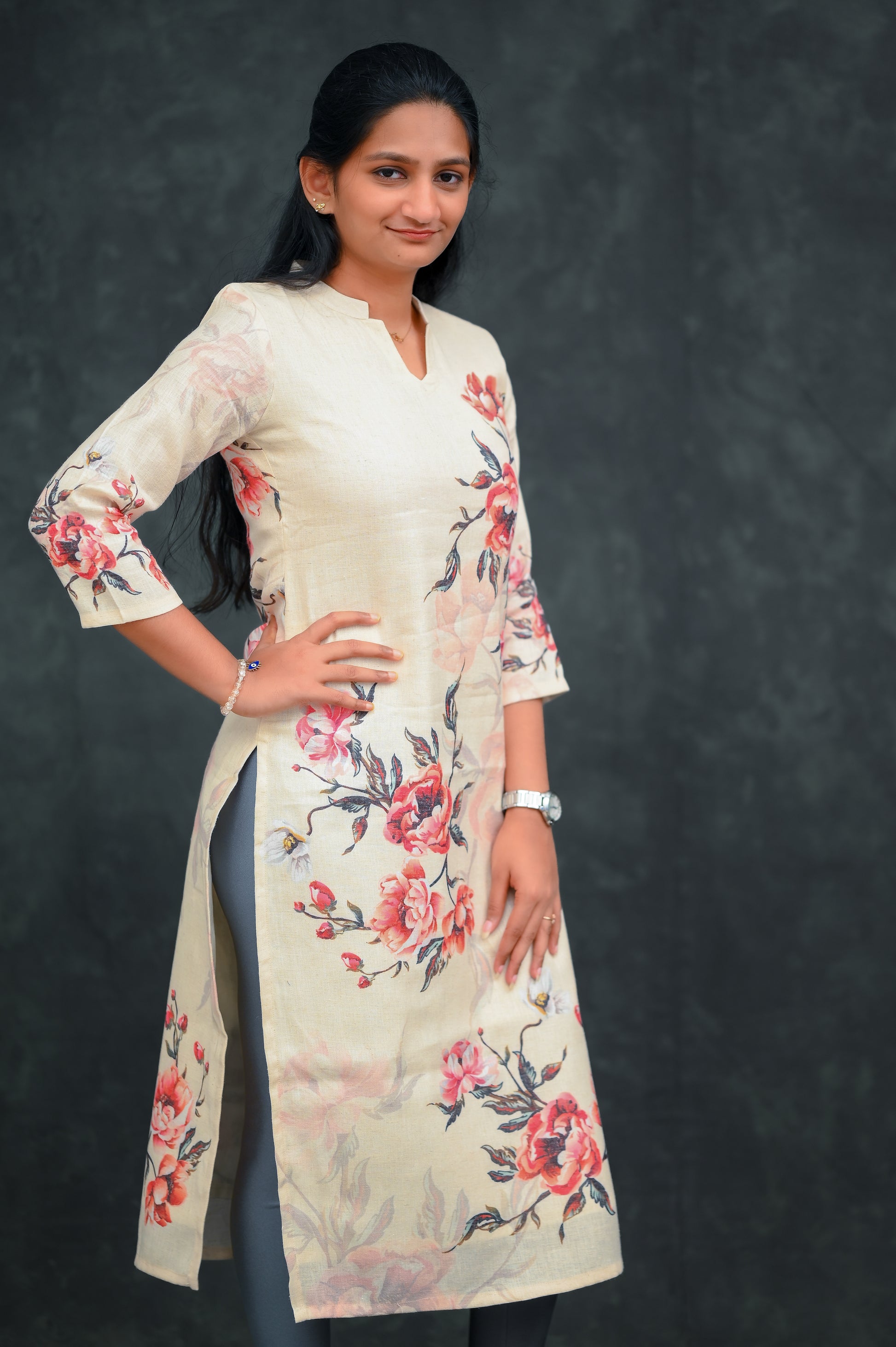 Straight-cut kurti with elegant placement floral print. Features a classy split neckline, 3/4th sleeves, and subtle side slits—minimal, chic, and super wearable