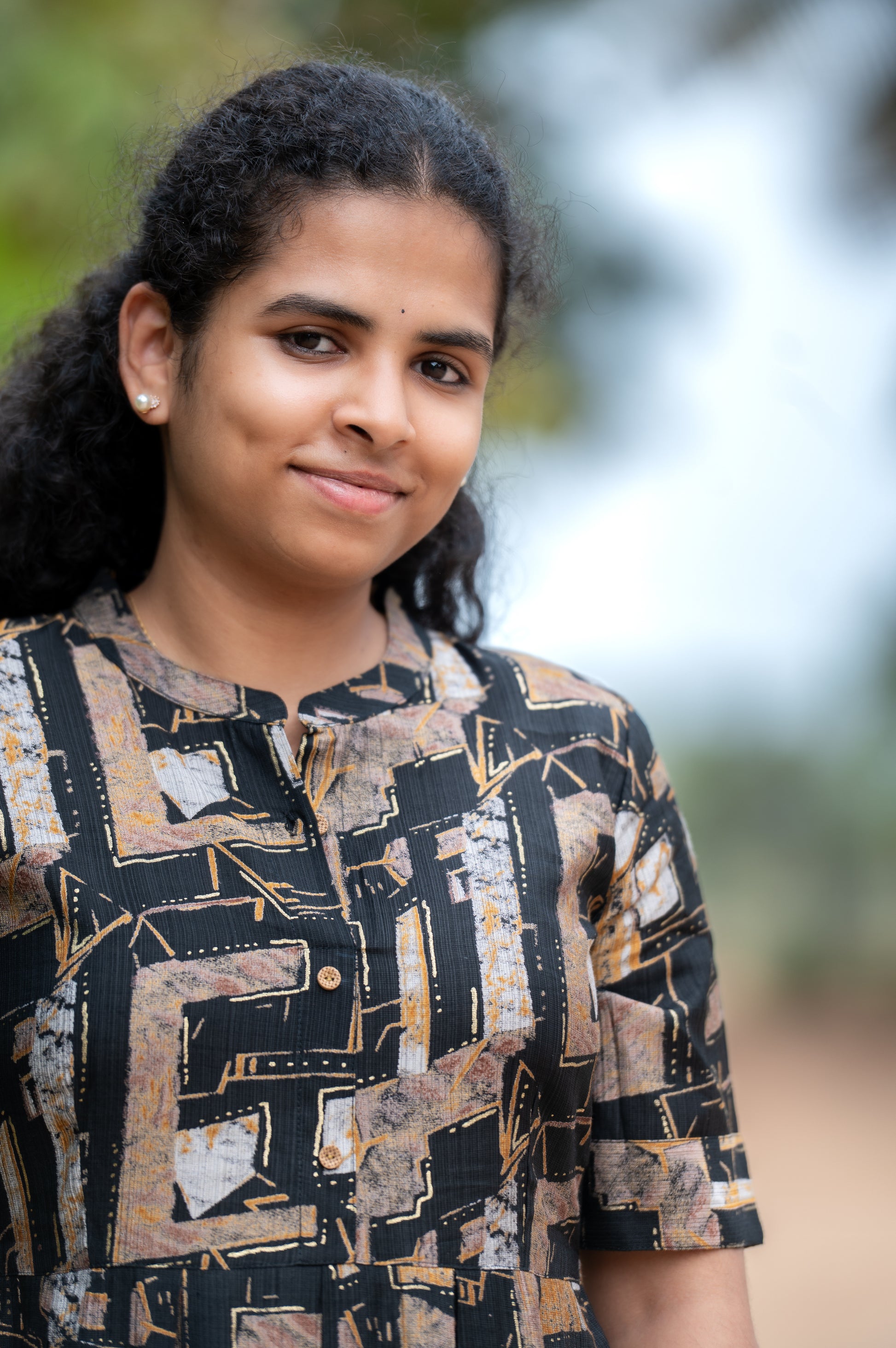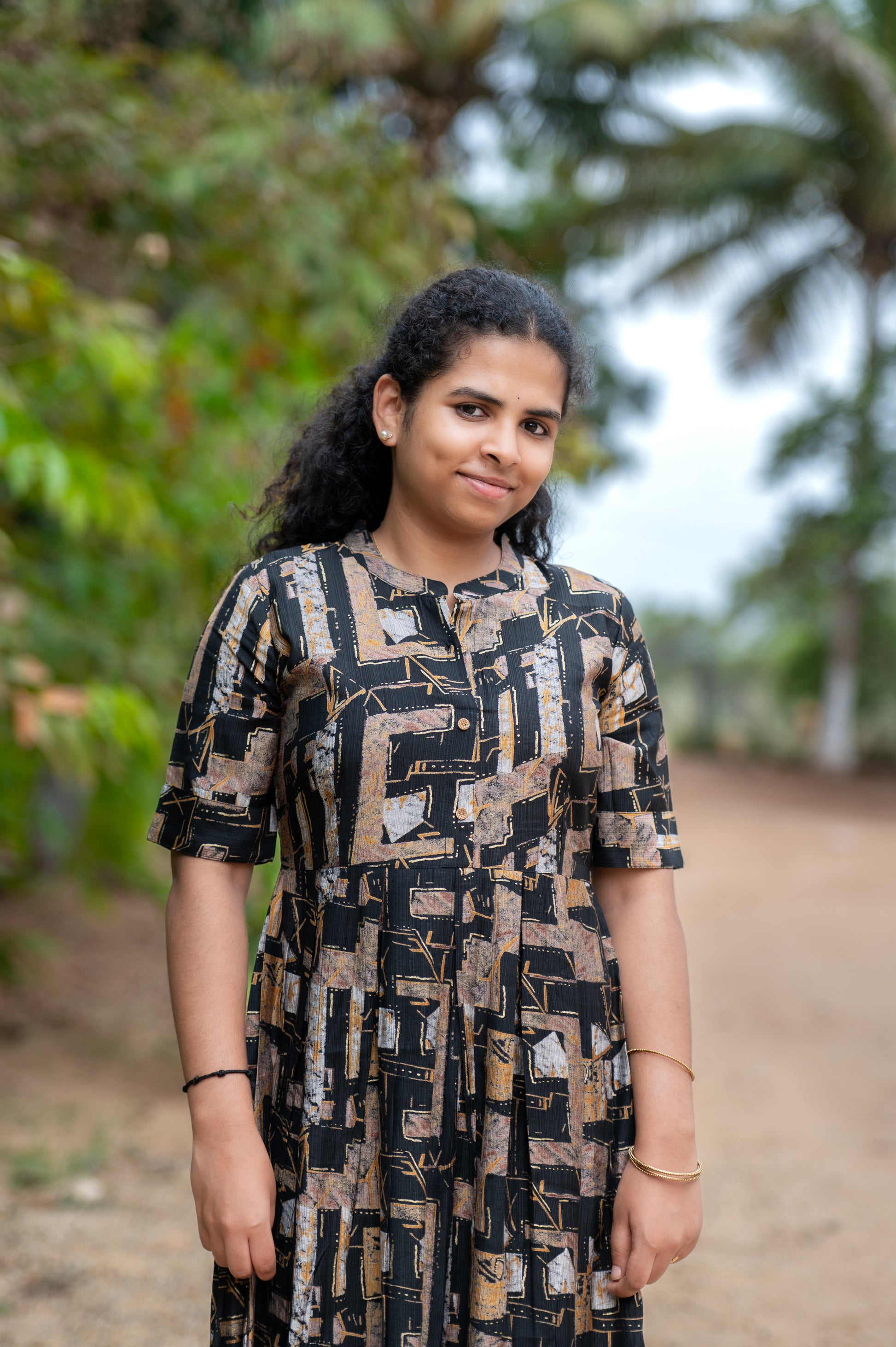 Elegant flared midi kurta with front button detailing and half sleeves. Features an abstract geometric pattern that blends modern charm with a subtle ethnic touch.