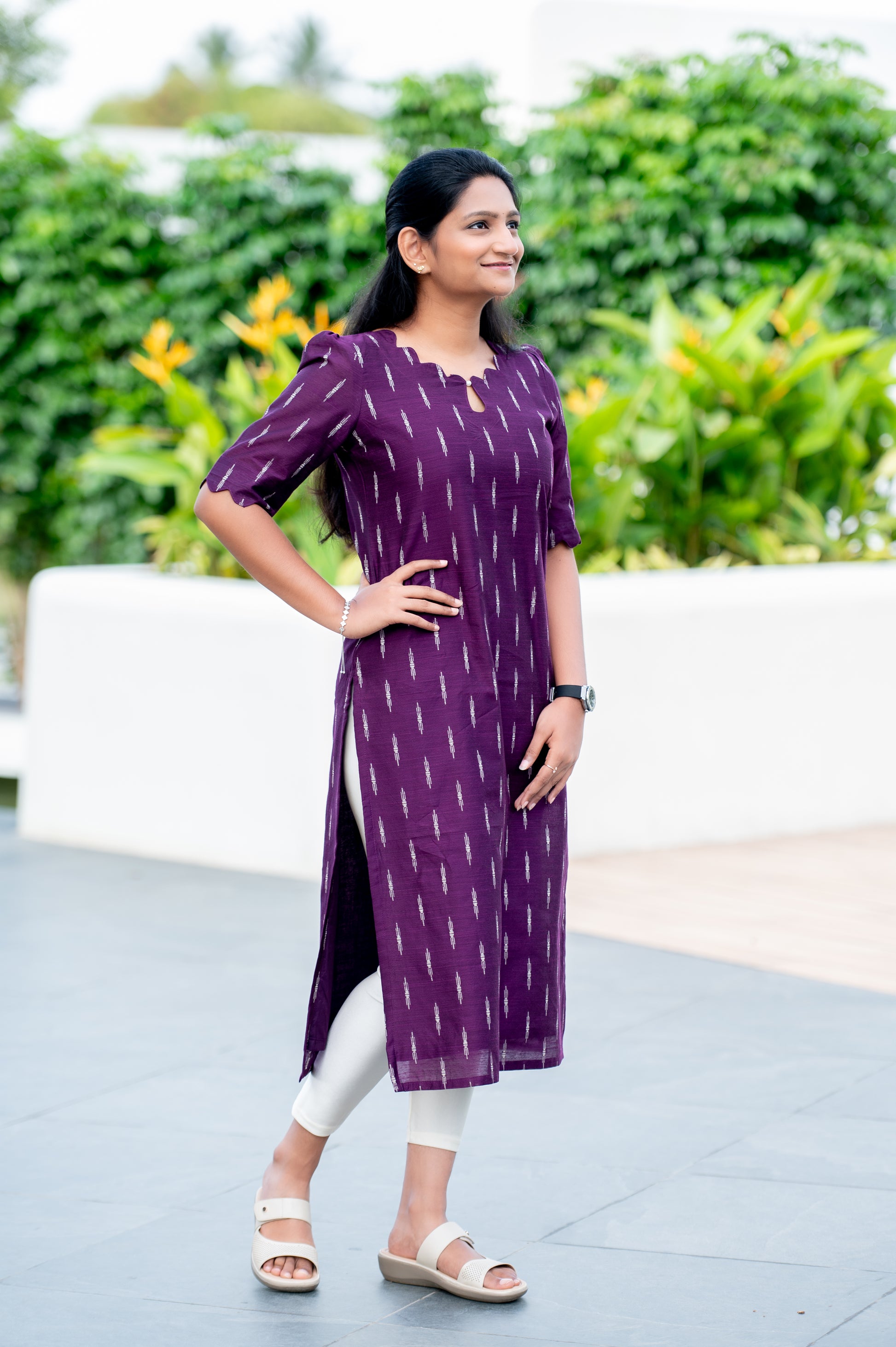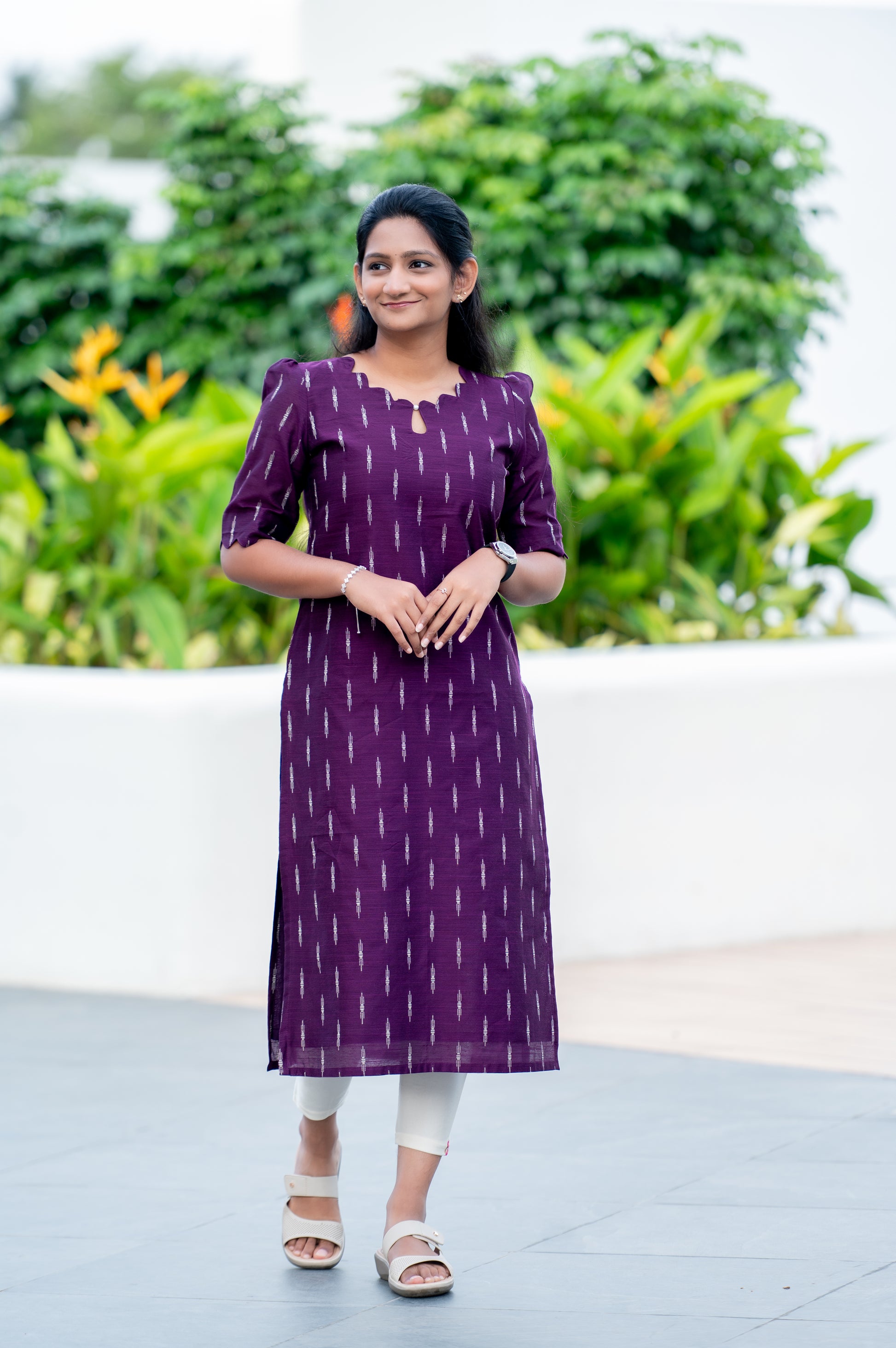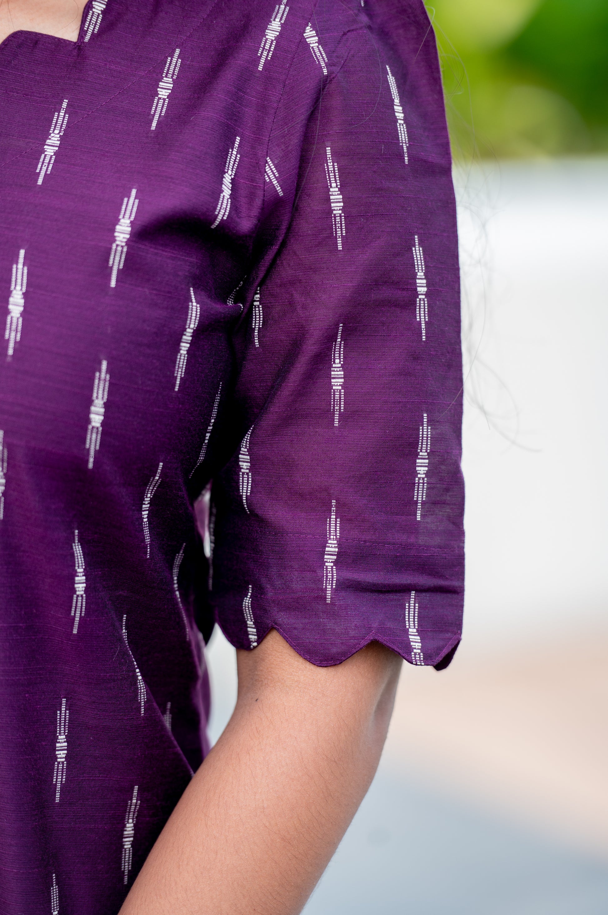 This stunning purple kurti features a charming ikat-style print and a unique scalloped neckline, offering an effortlessly chic yet traditional look. The breathable fabric and simple design make it perfect for casual gatherings or a day out with friends.