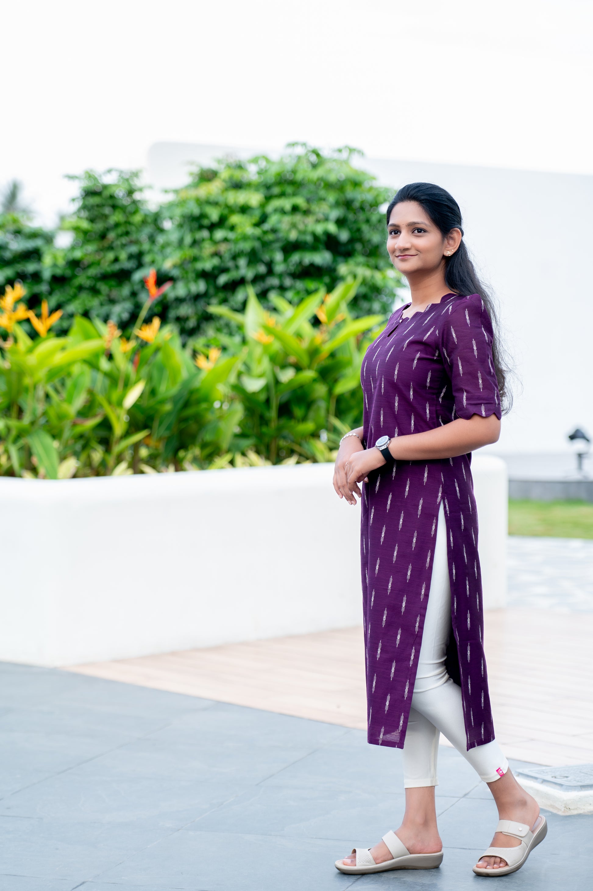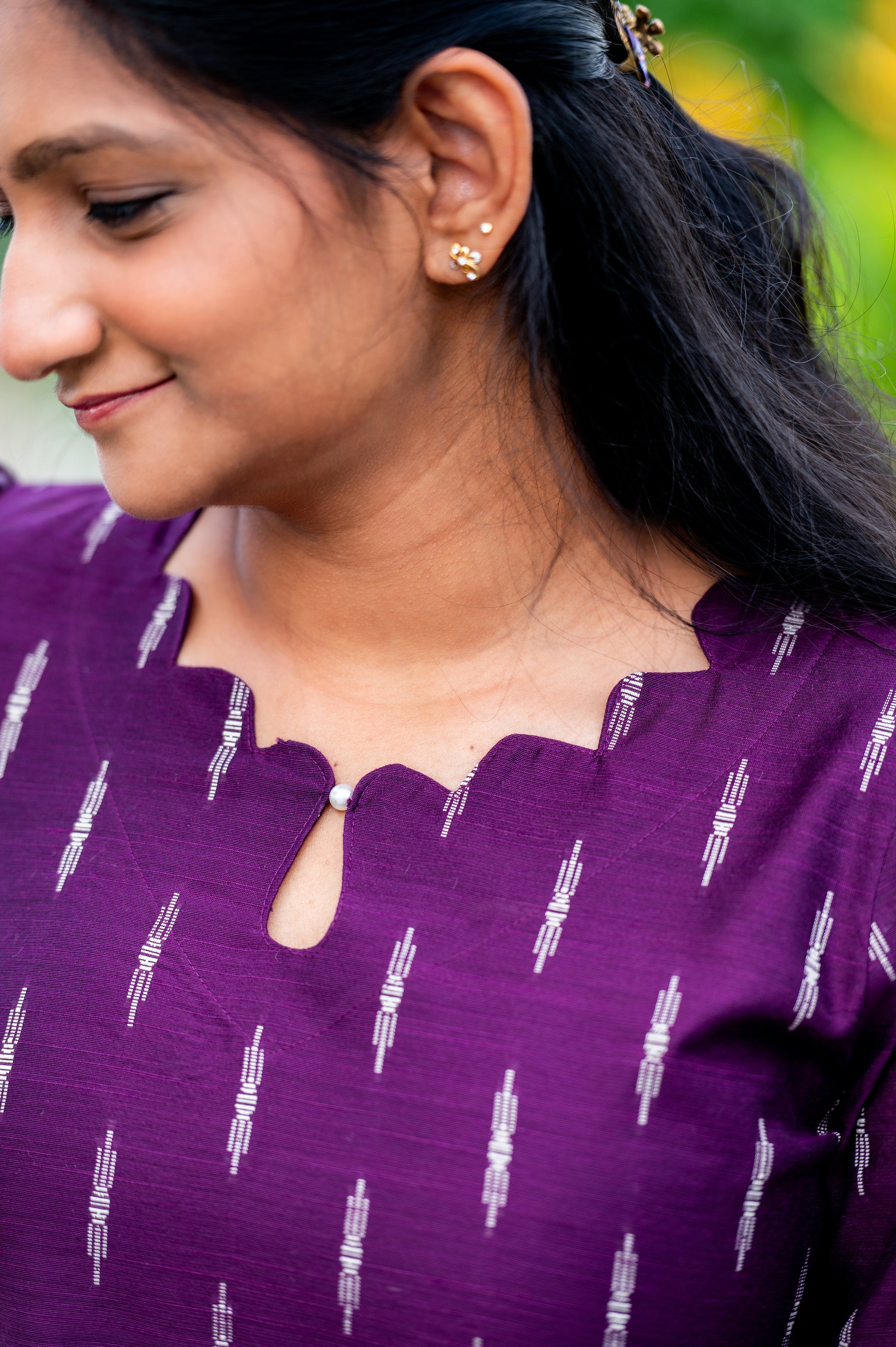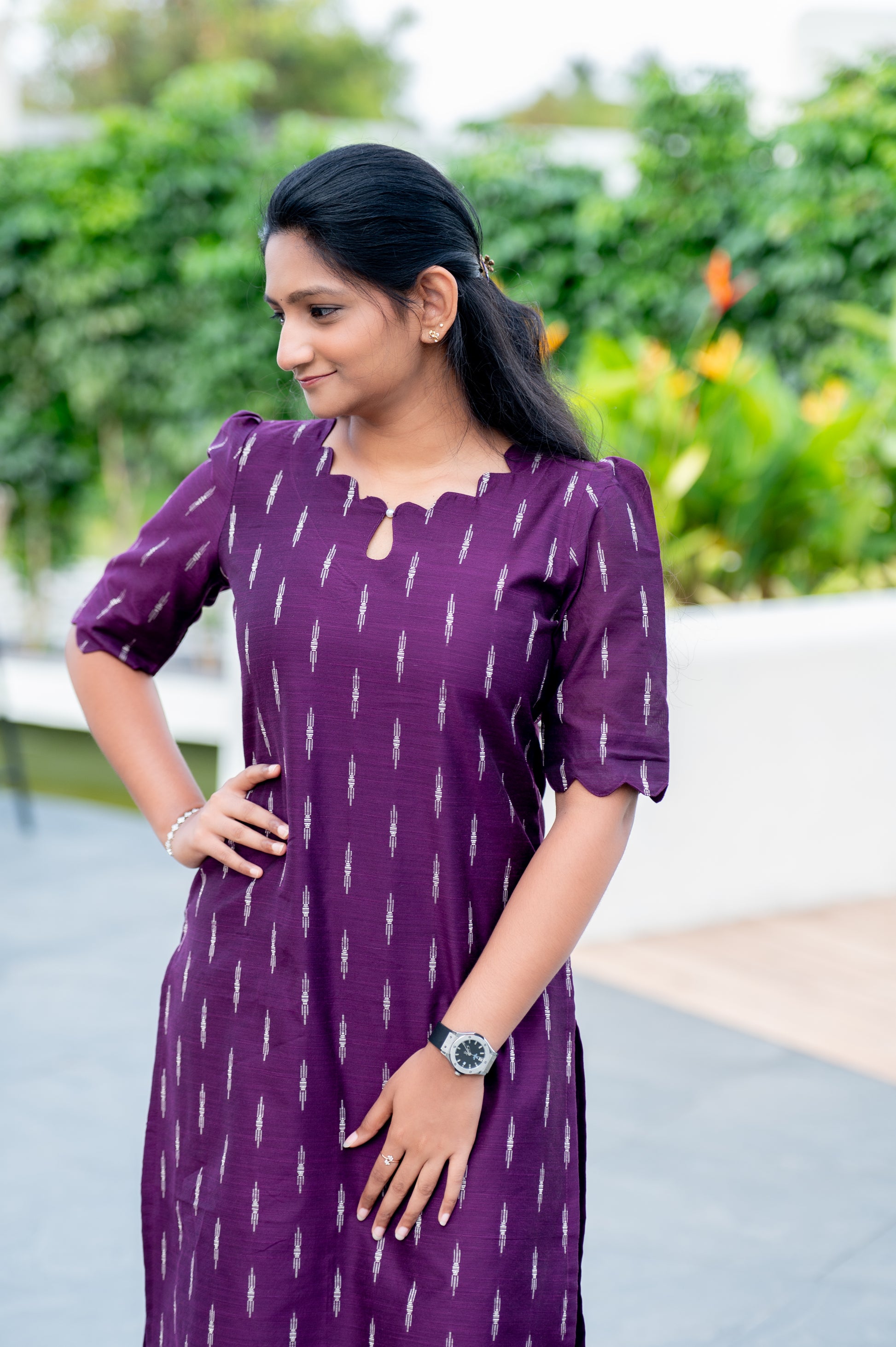 This stunning purple kurti features a charming ikat-style print and a unique scalloped neckline, offering an effortlessly chic yet traditional look. The breathable fabric and simple design make it perfect for casual gatherings or a day out with friends.