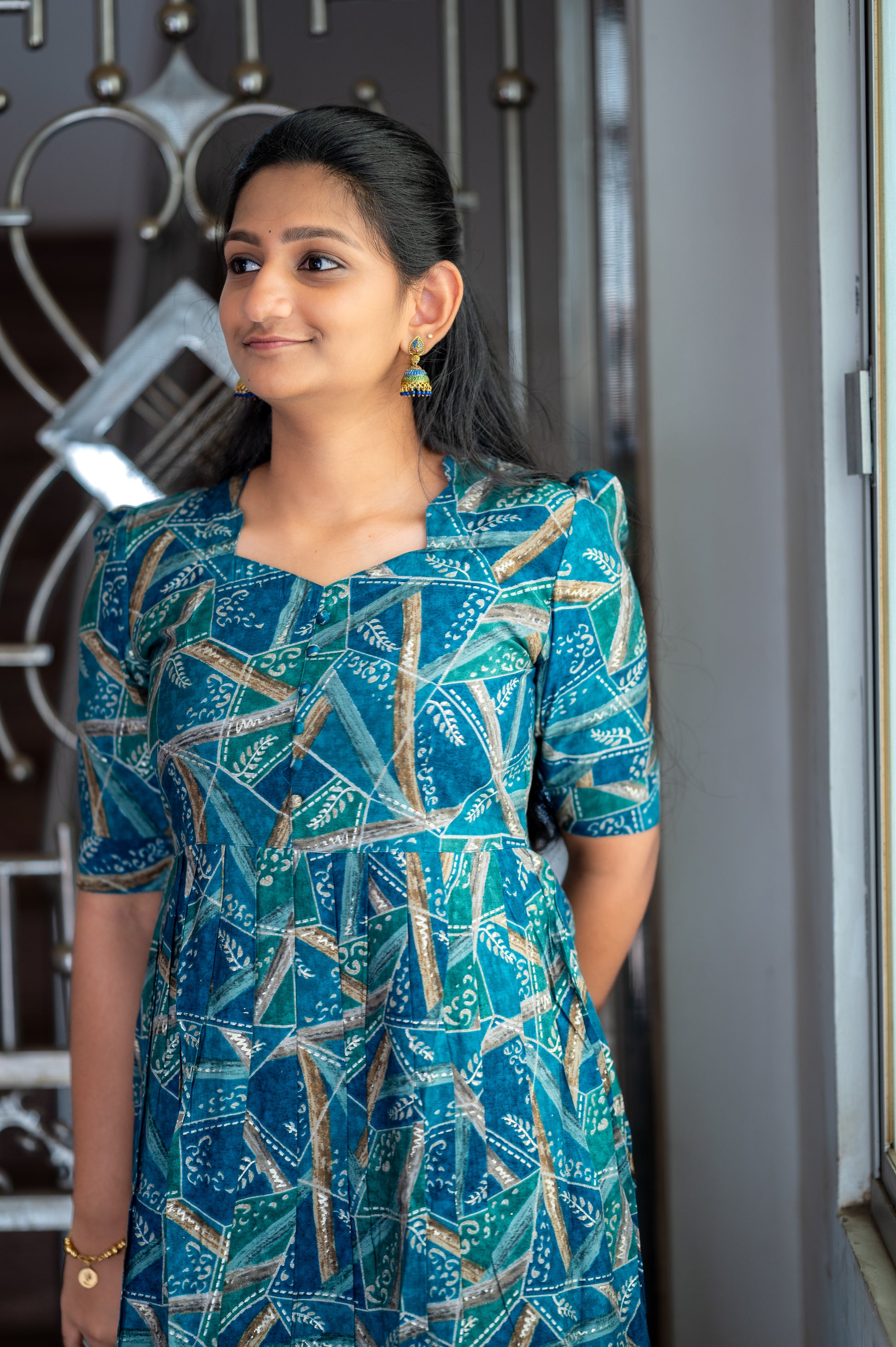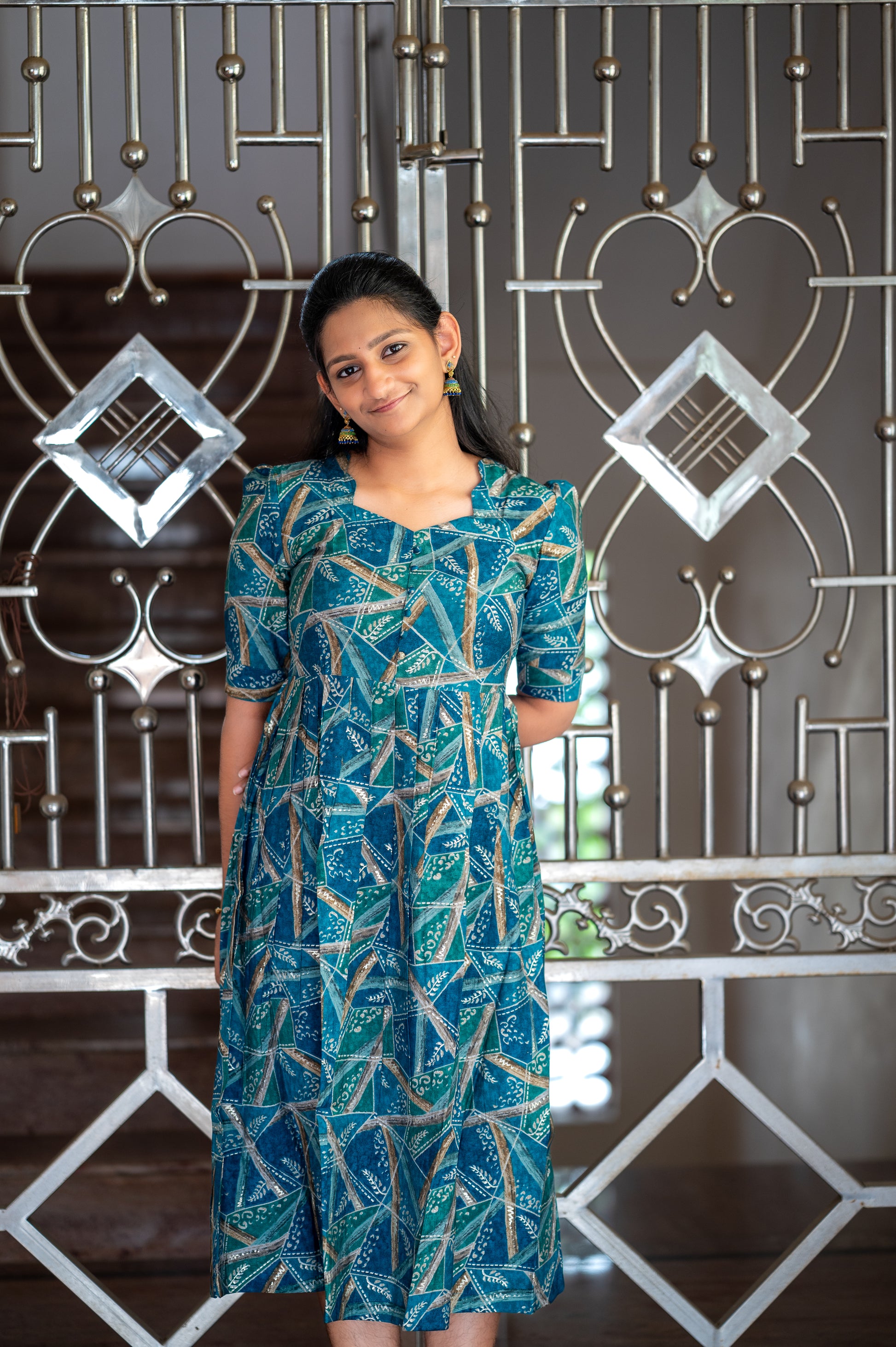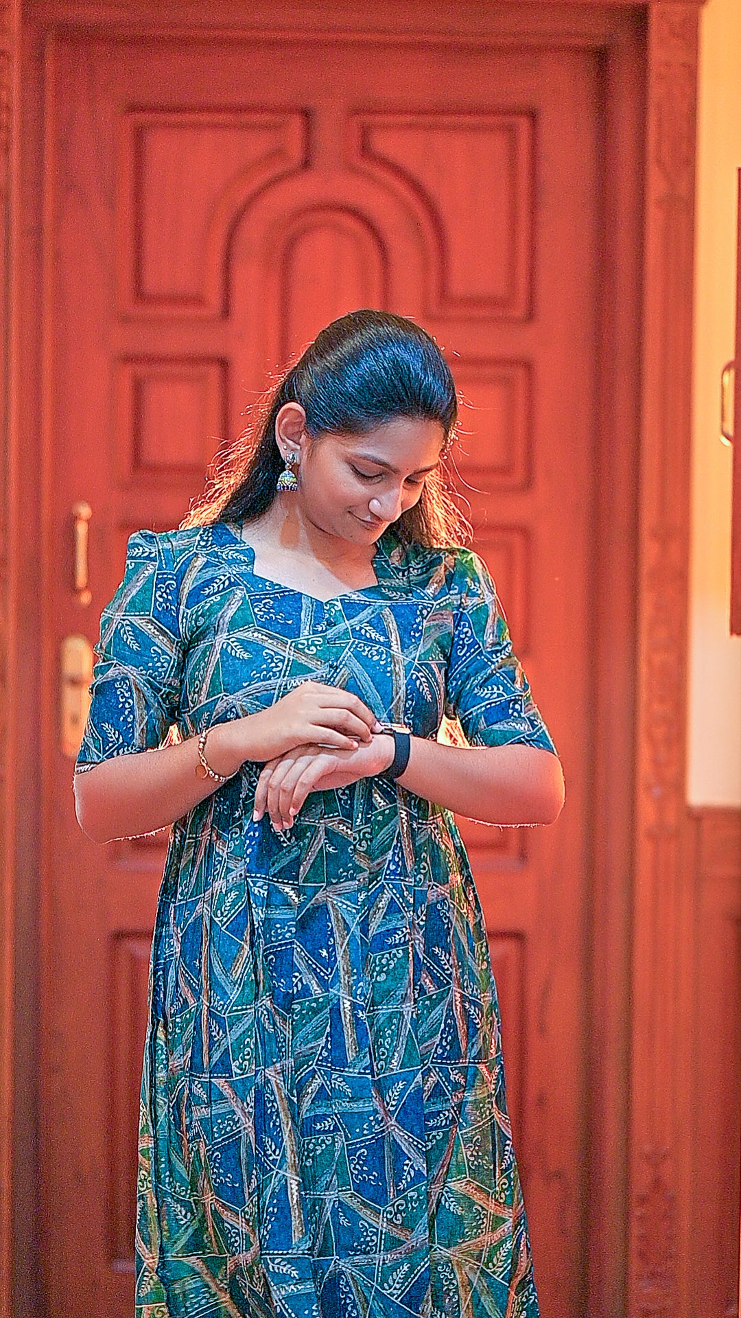Boldly artistic, the Indigo Mosaic kurti features an intricate interplay of geometric blocks in shades of teal, navy, and earthy browns. Ethnic leaf and vine motifs peek through the angular patterns, creating a visual rhythm that’s both modern and rooted in tradition. The structured neckline and front pleats add a touch of elegance to this striking design—ideal for the woman who loves a fusion of craft and confidence.
