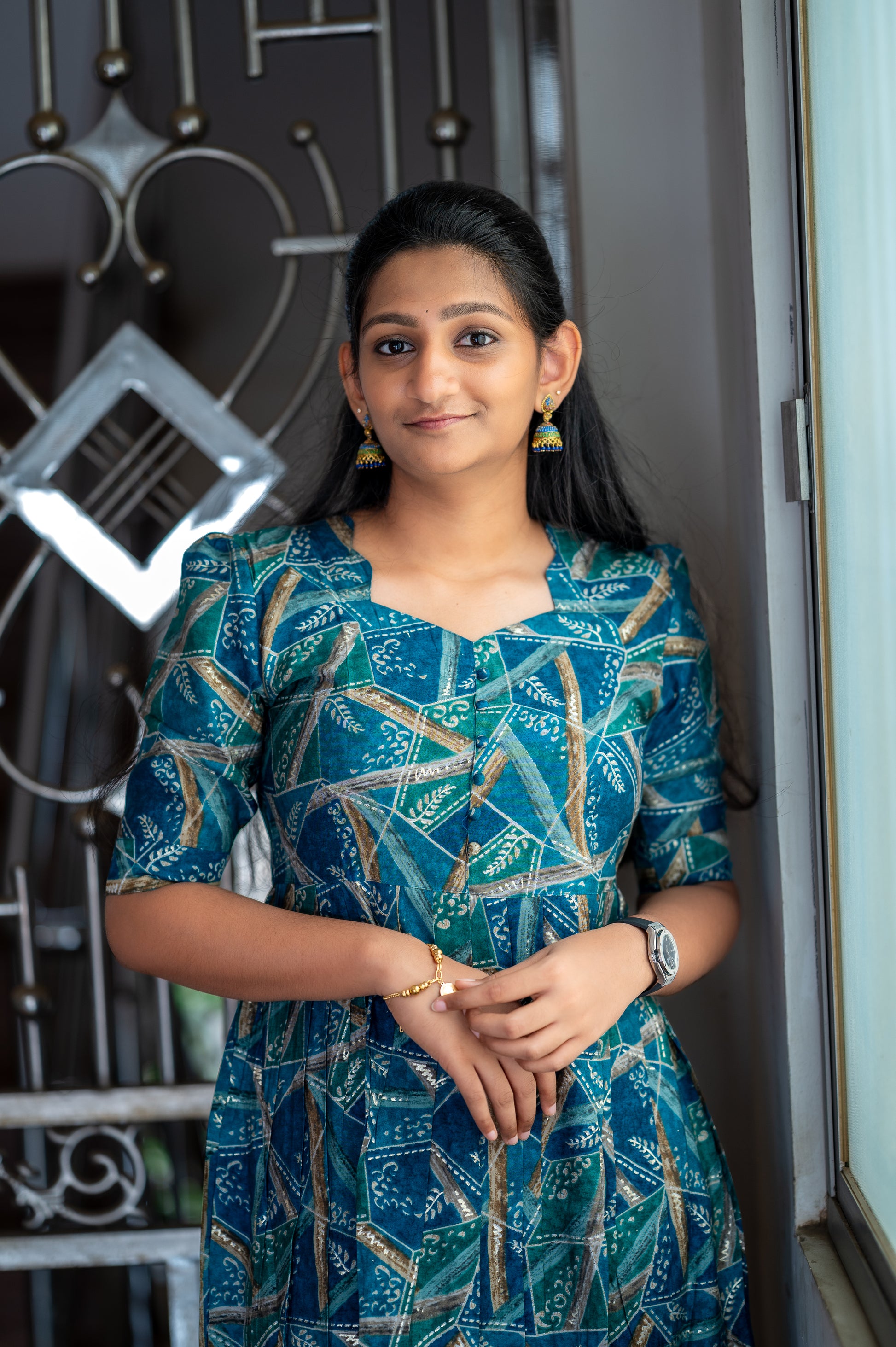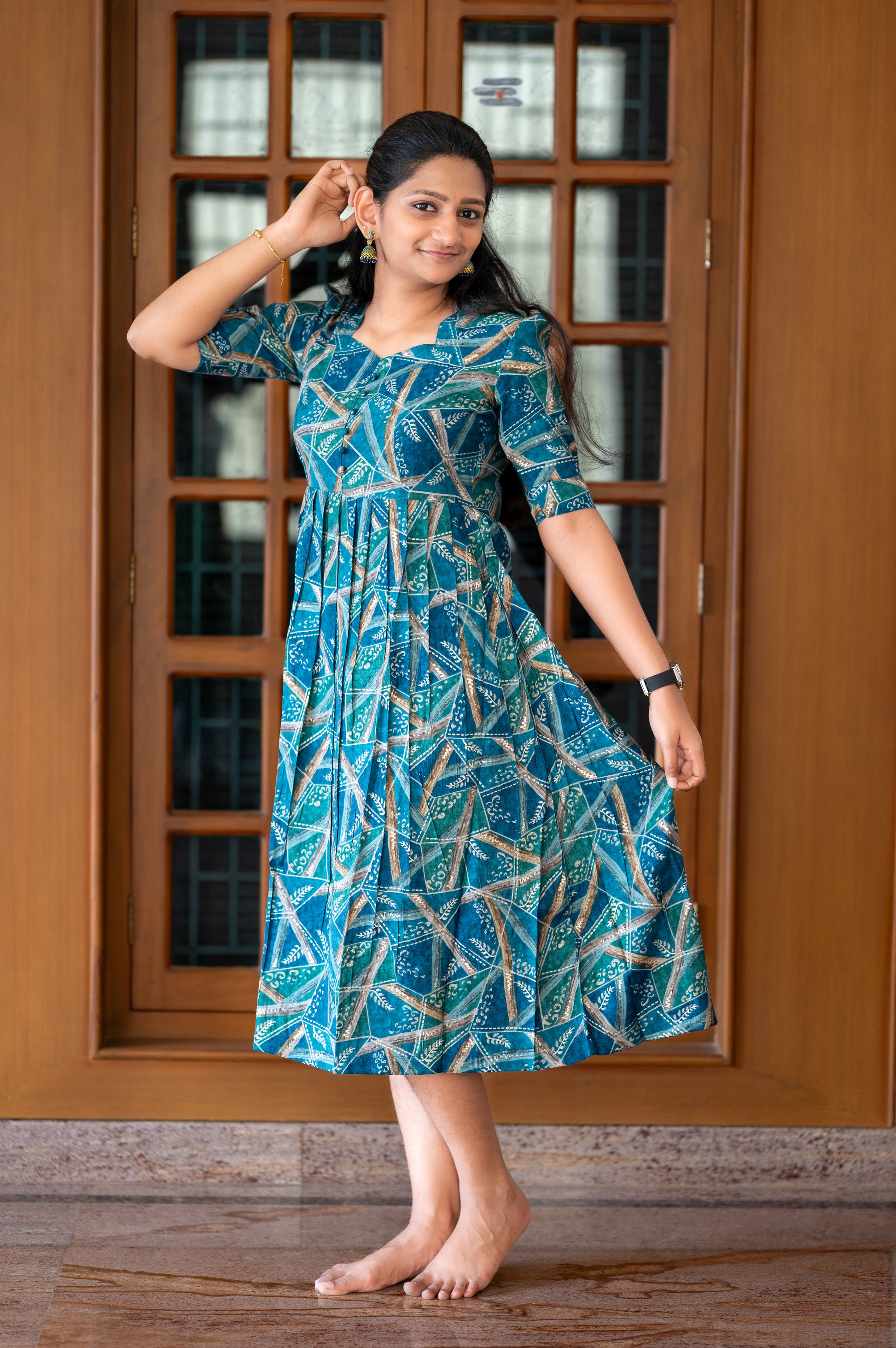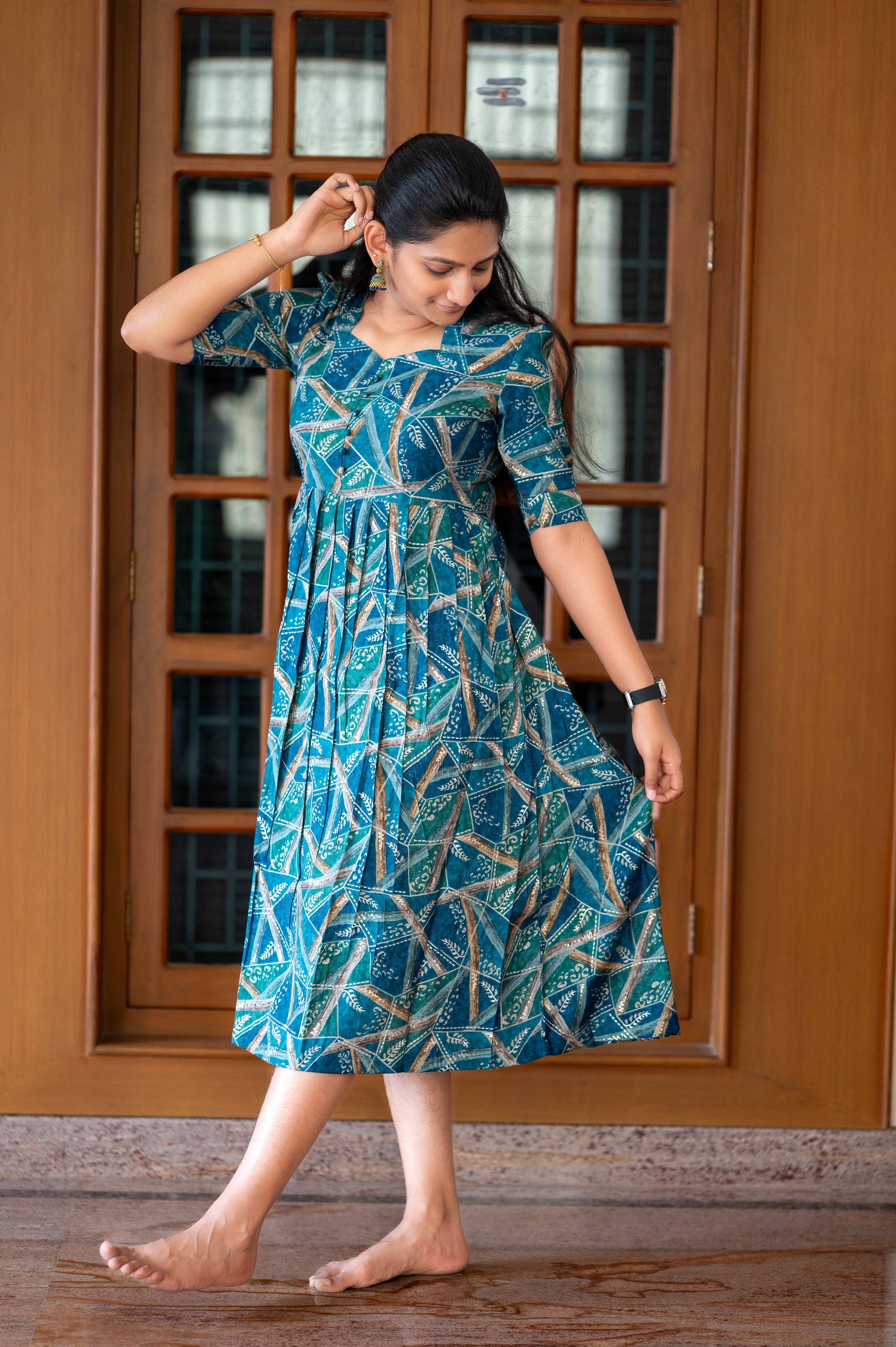 Boldly artistic, the Indigo Mosaic kurti features an intricate interplay of geometric blocks in shades of teal, navy, and earthy browns. Ethnic leaf and vine motifs peek through the angular patterns, creating a visual rhythm that’s both modern and rooted in tradition. The structured neckline and front pleats add a touch of elegance to this striking design—ideal for the woman who loves a fusion of craft and confidence.
