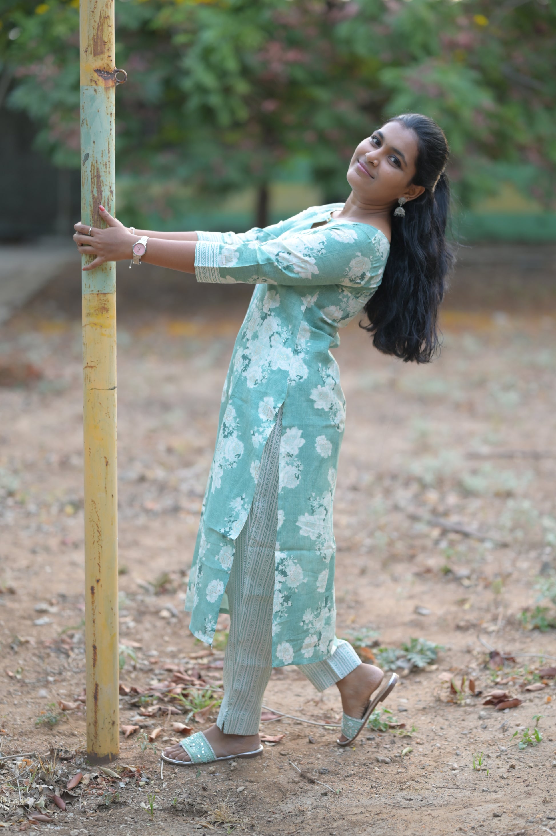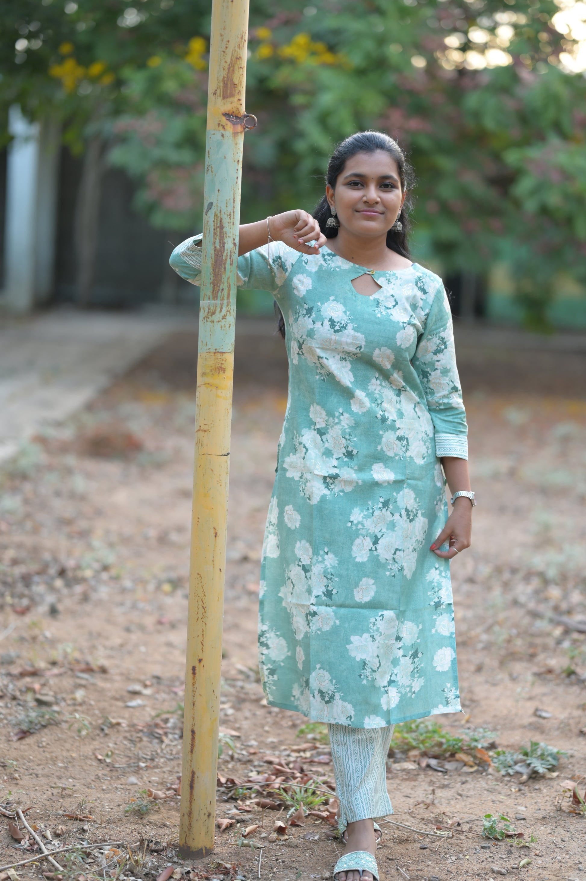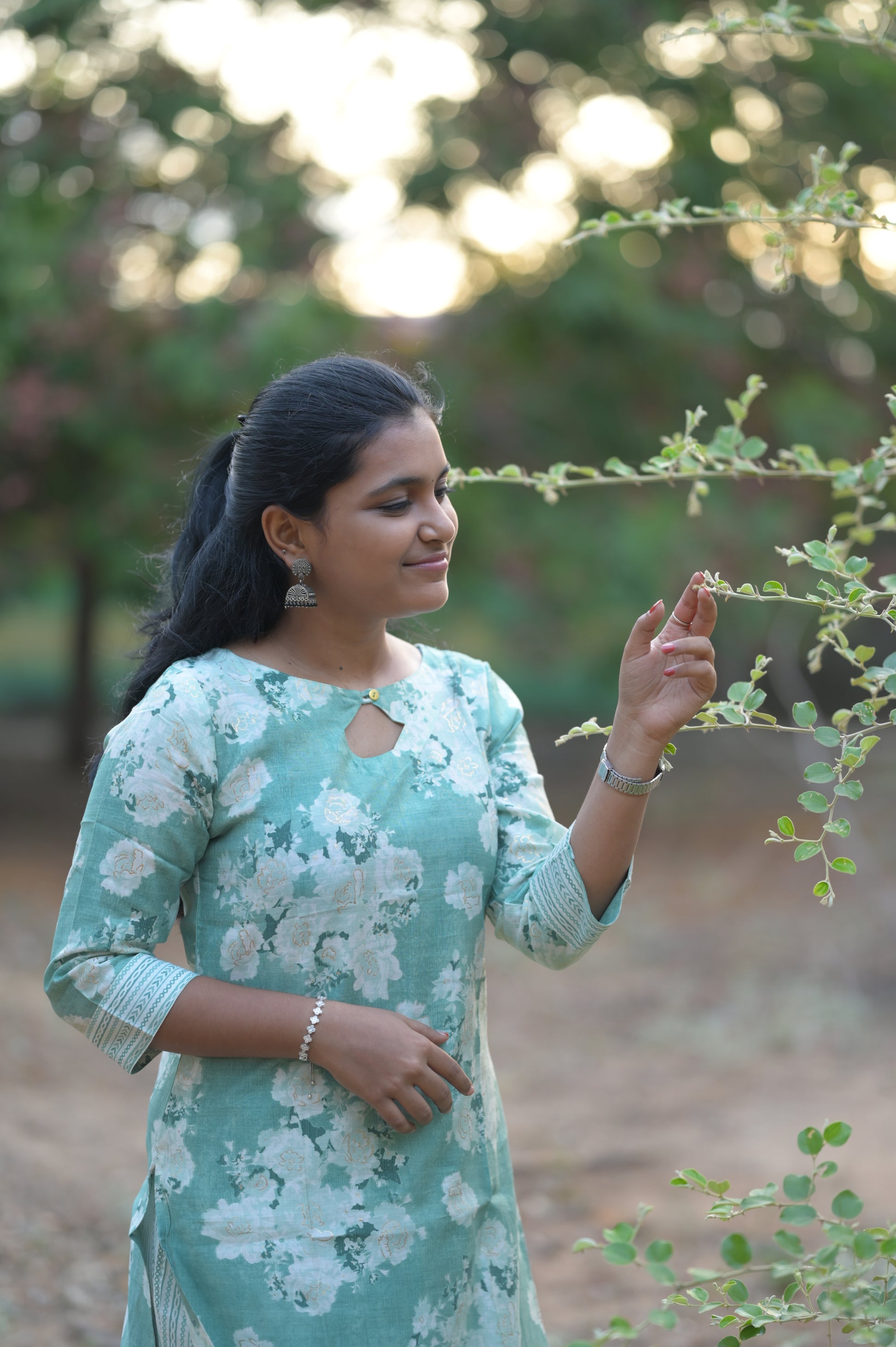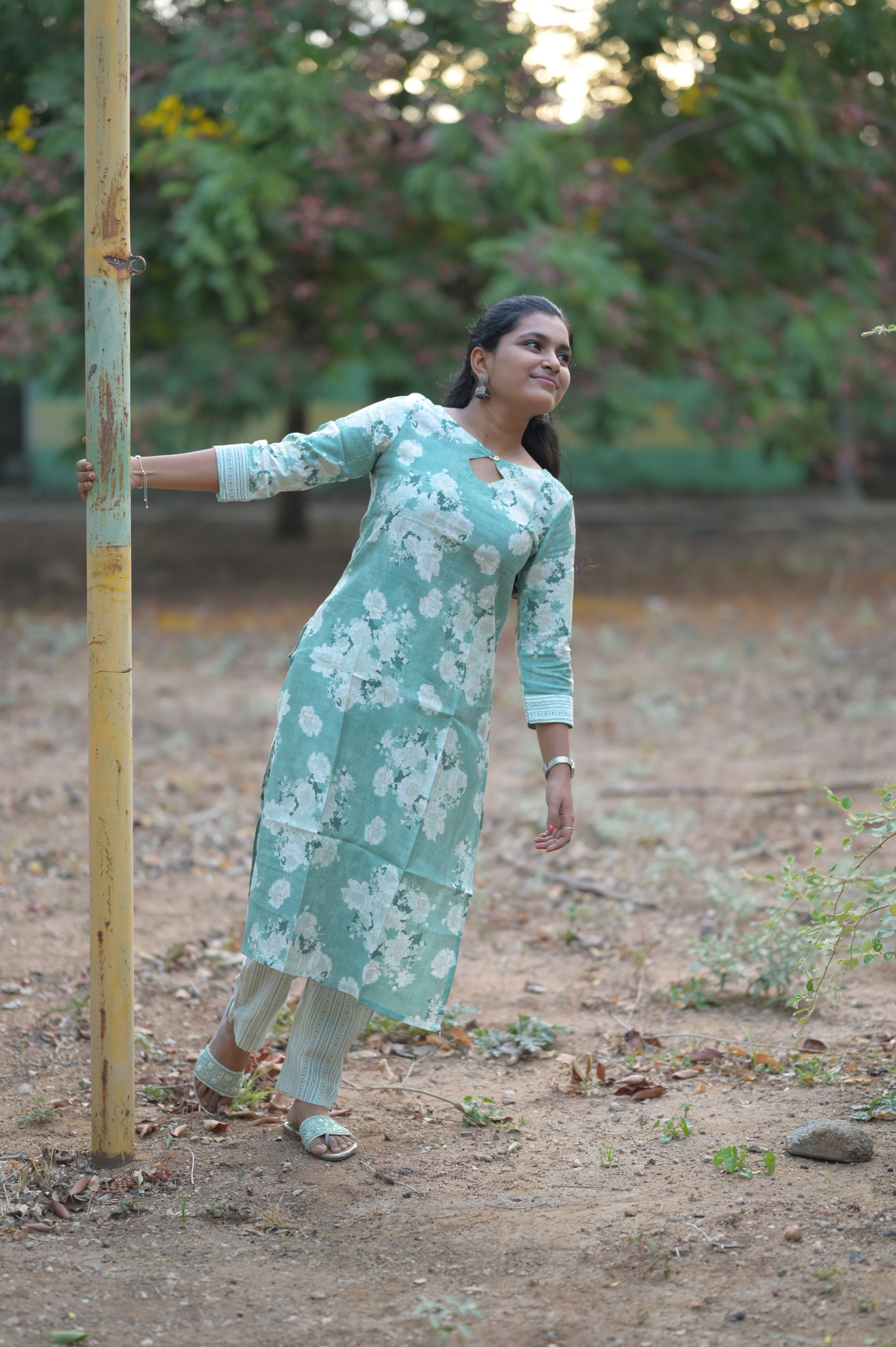 The Mint Blossom Kurti radiates soft elegance with its serene pastel green base and delicate white floral print. Designed in a straight-cut silhouette, this kurti is a perfect example of minimalist charm and everyday sophistication.