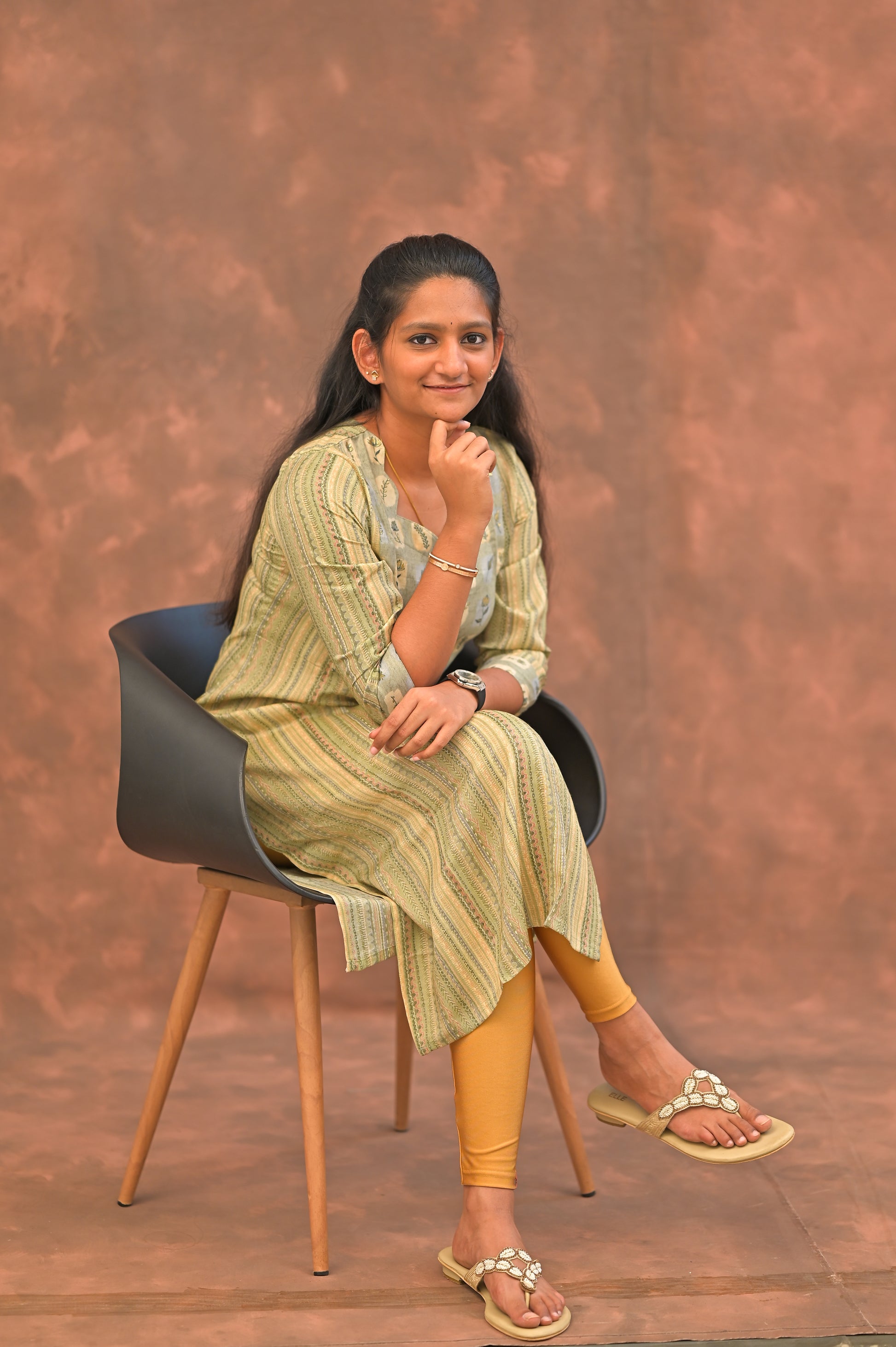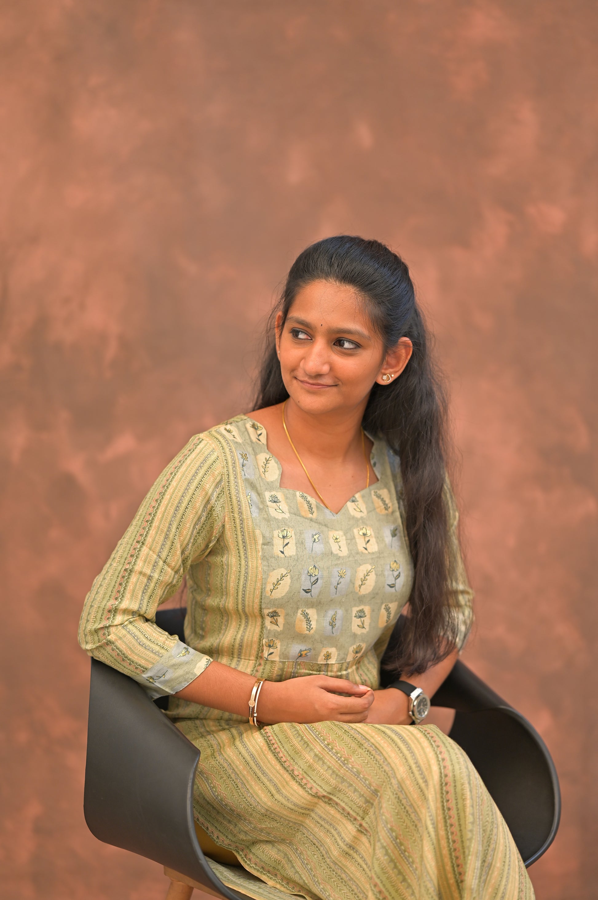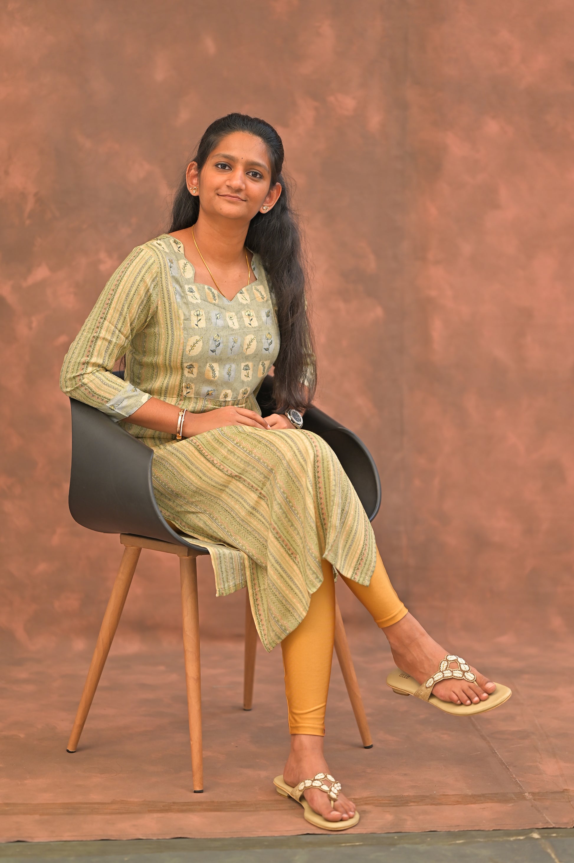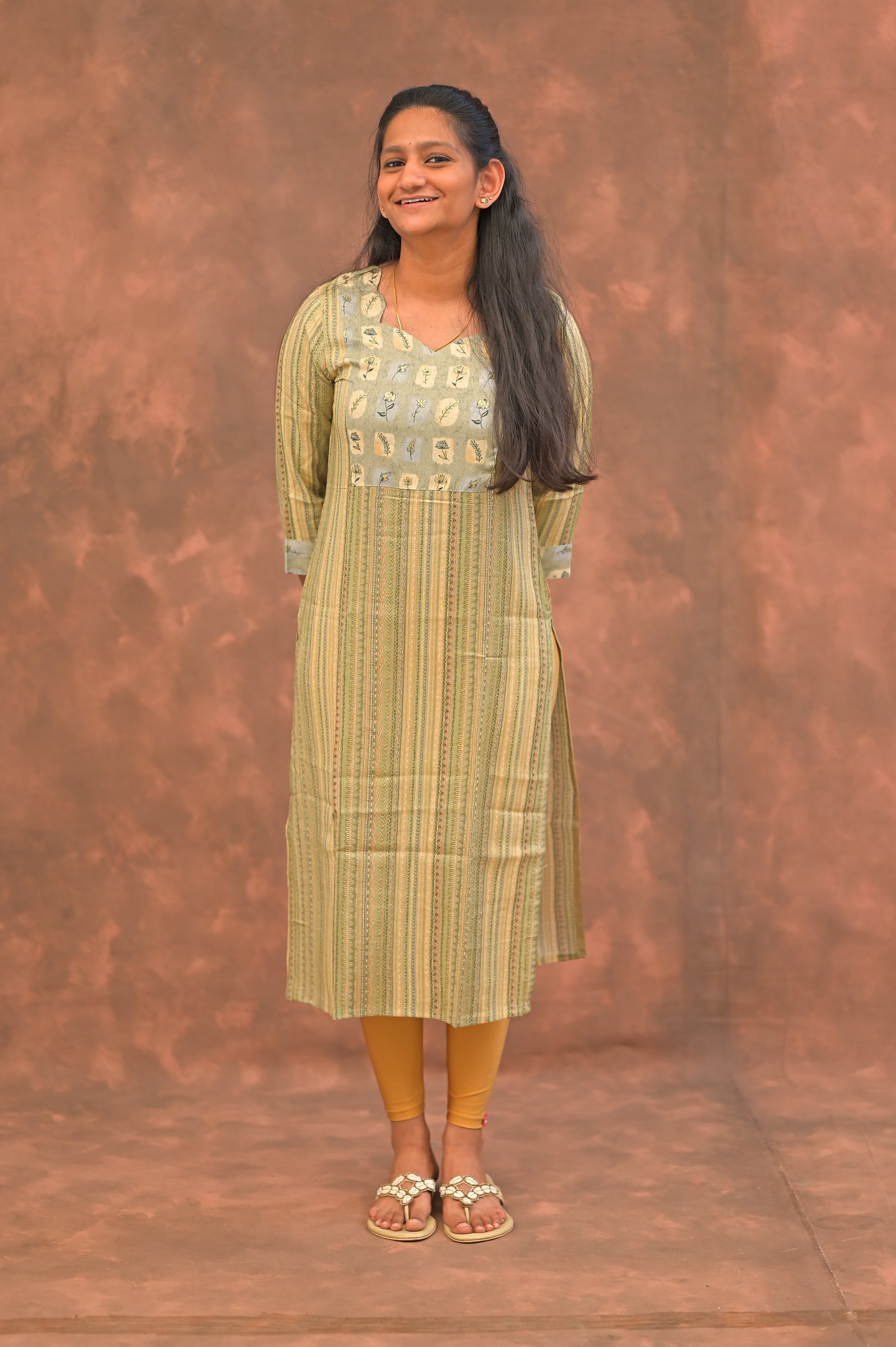 This kurti exudes subtle elegance with its earthy palette of soft pinks and warm beige tones. The design features a vertical striped pattern that elongates the silhouette, complemented by a square-block printed yoke with abstract motifs in muted pastels.