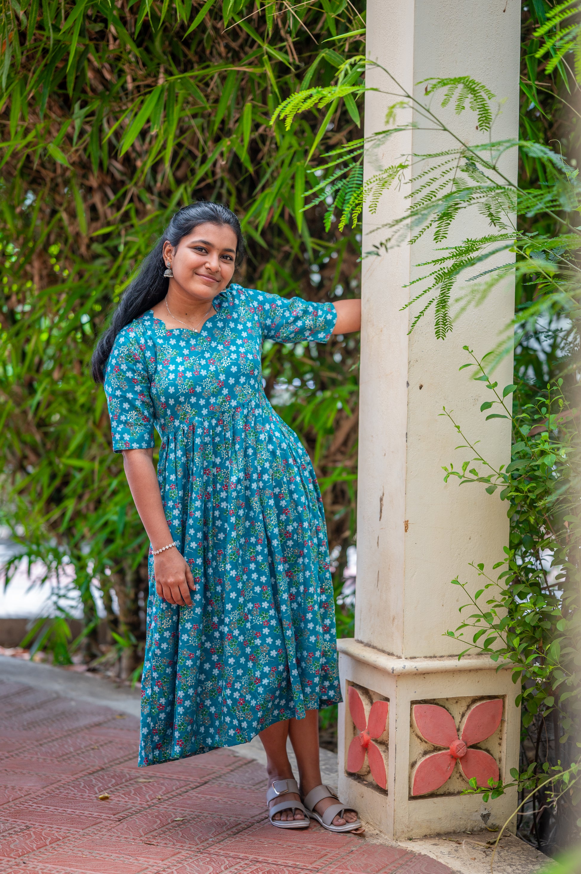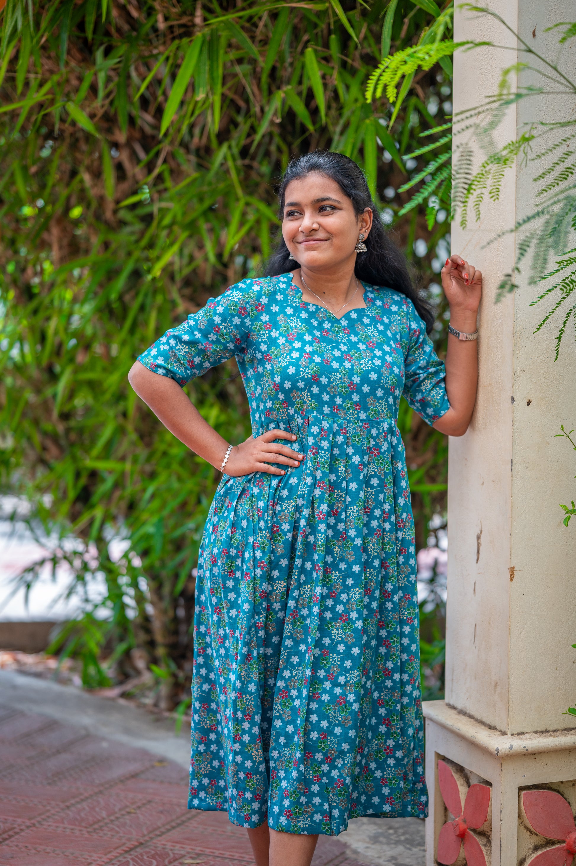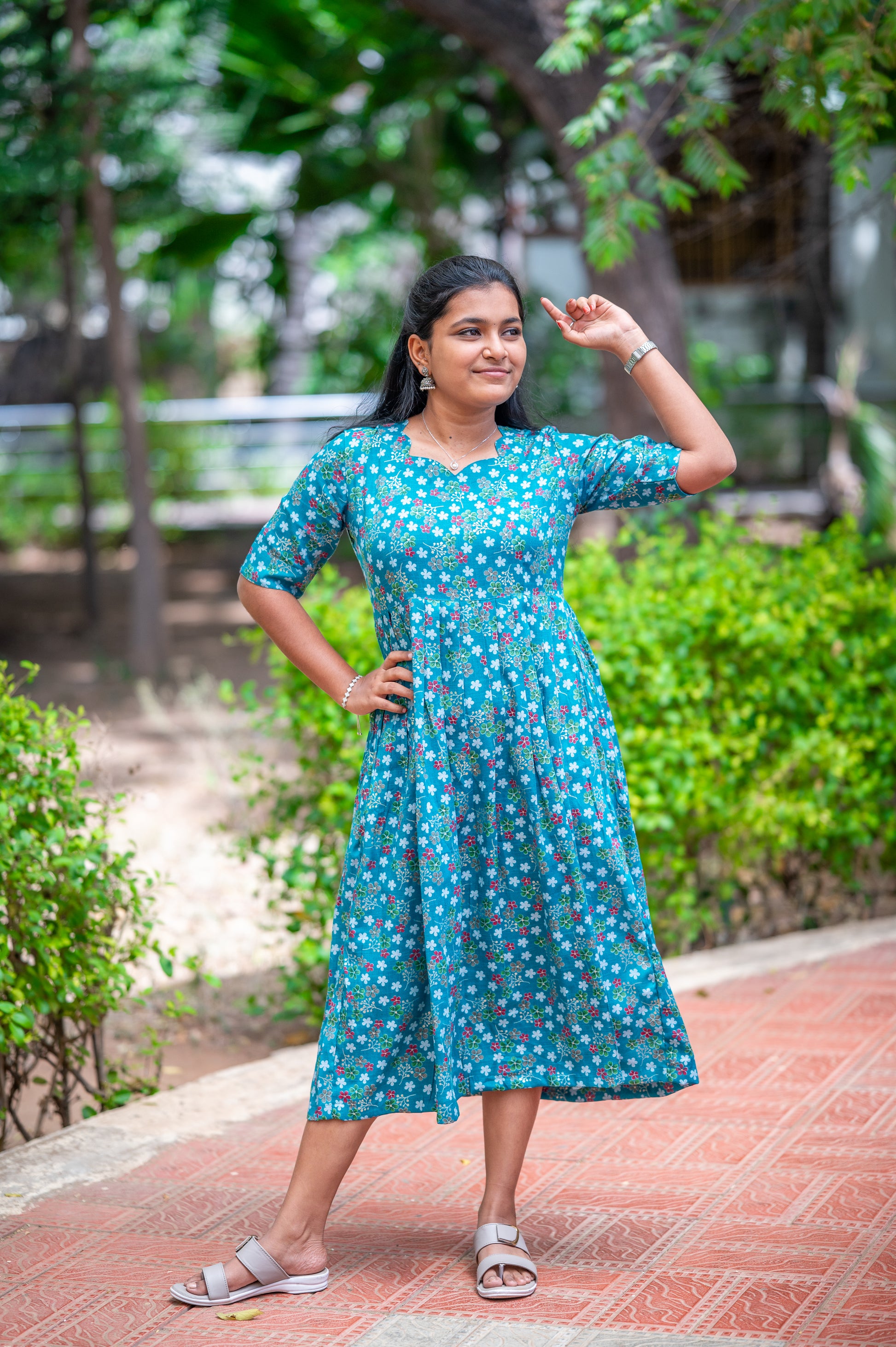 This Teal Blossom Breeze Kurti is styled in a classic fit & flare silhouette, offering a graceful and comfortable look.