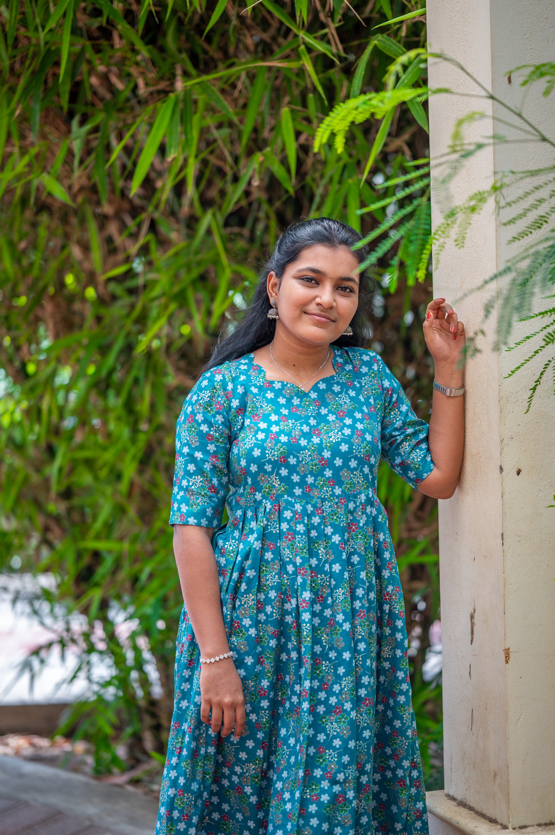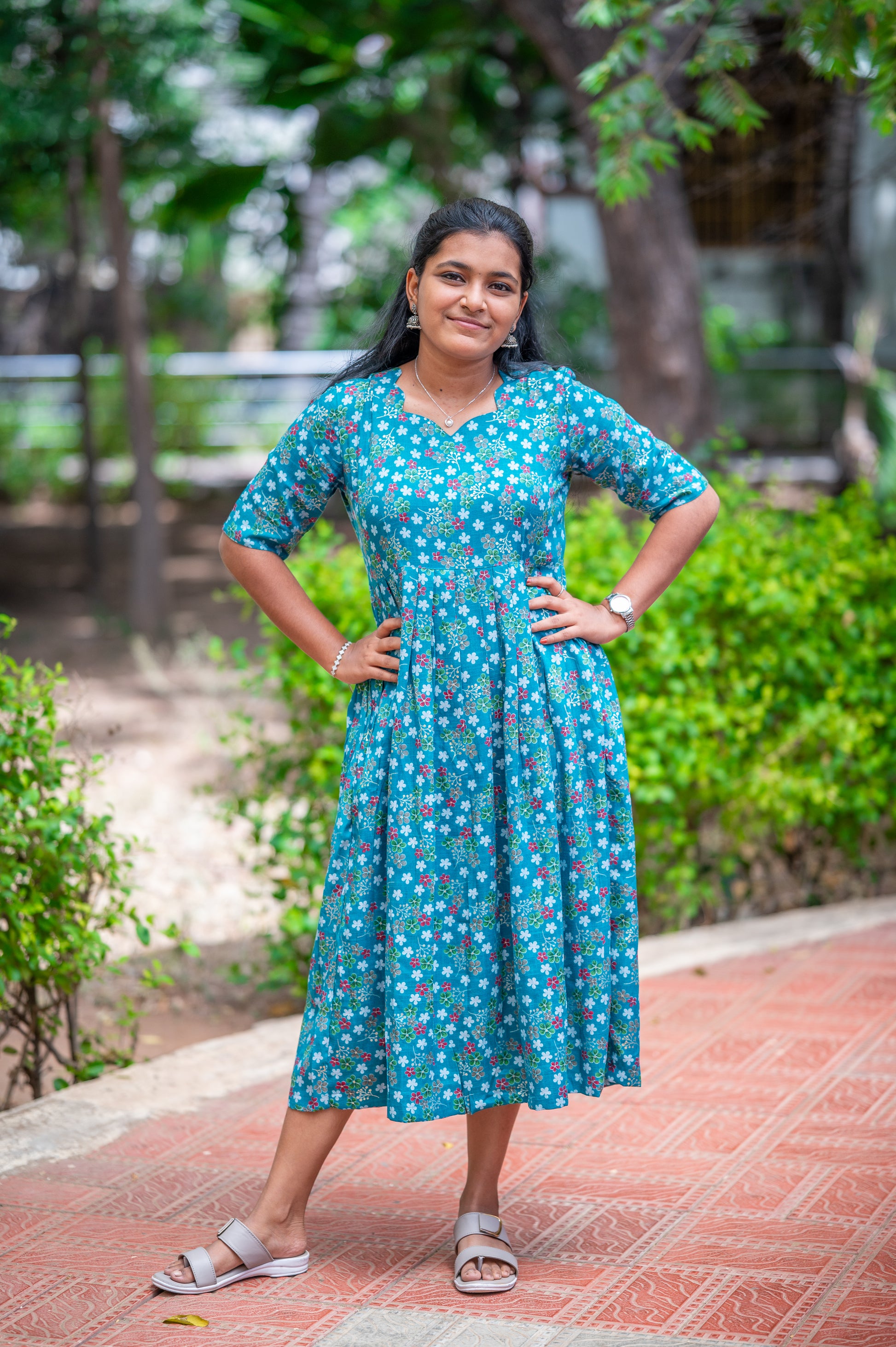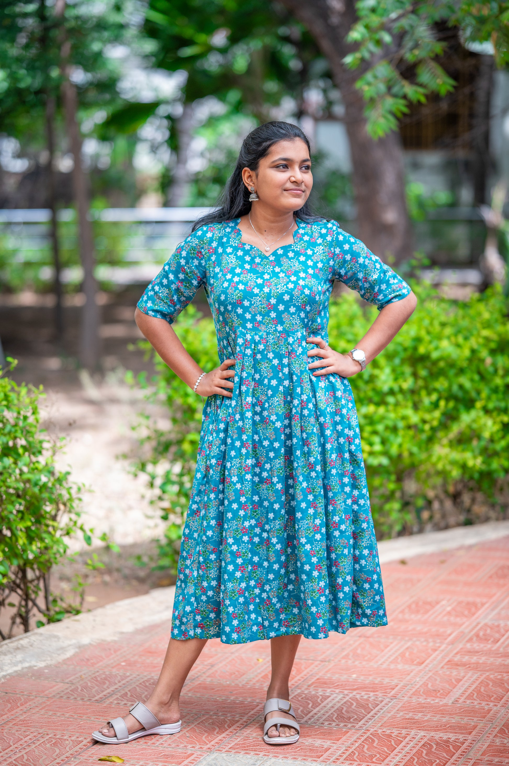 This Teal Blossom Breeze Kurti is styled in a classic fit & flare silhouette, offering a graceful and comfortable look.