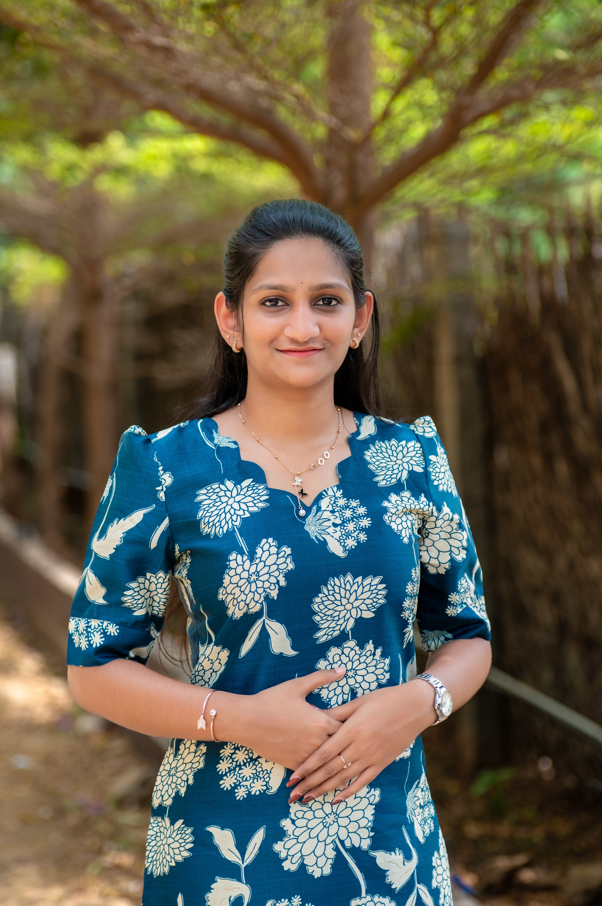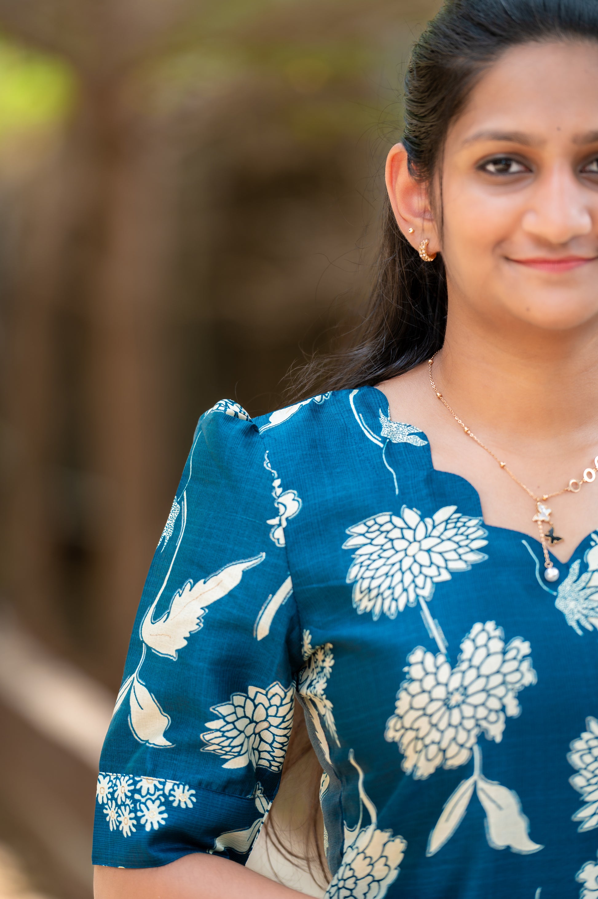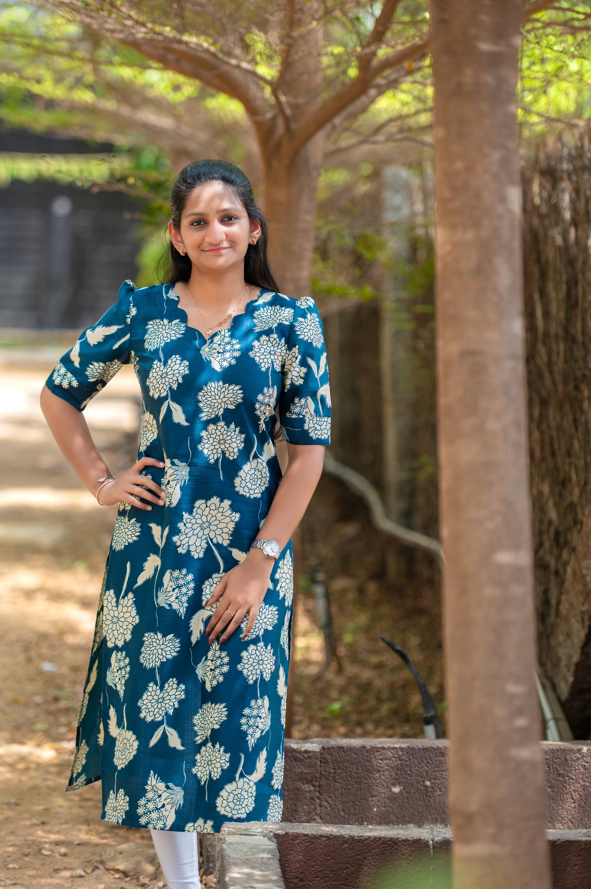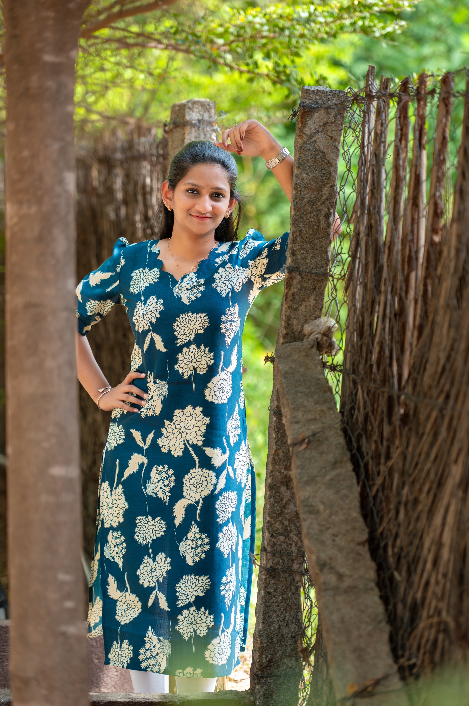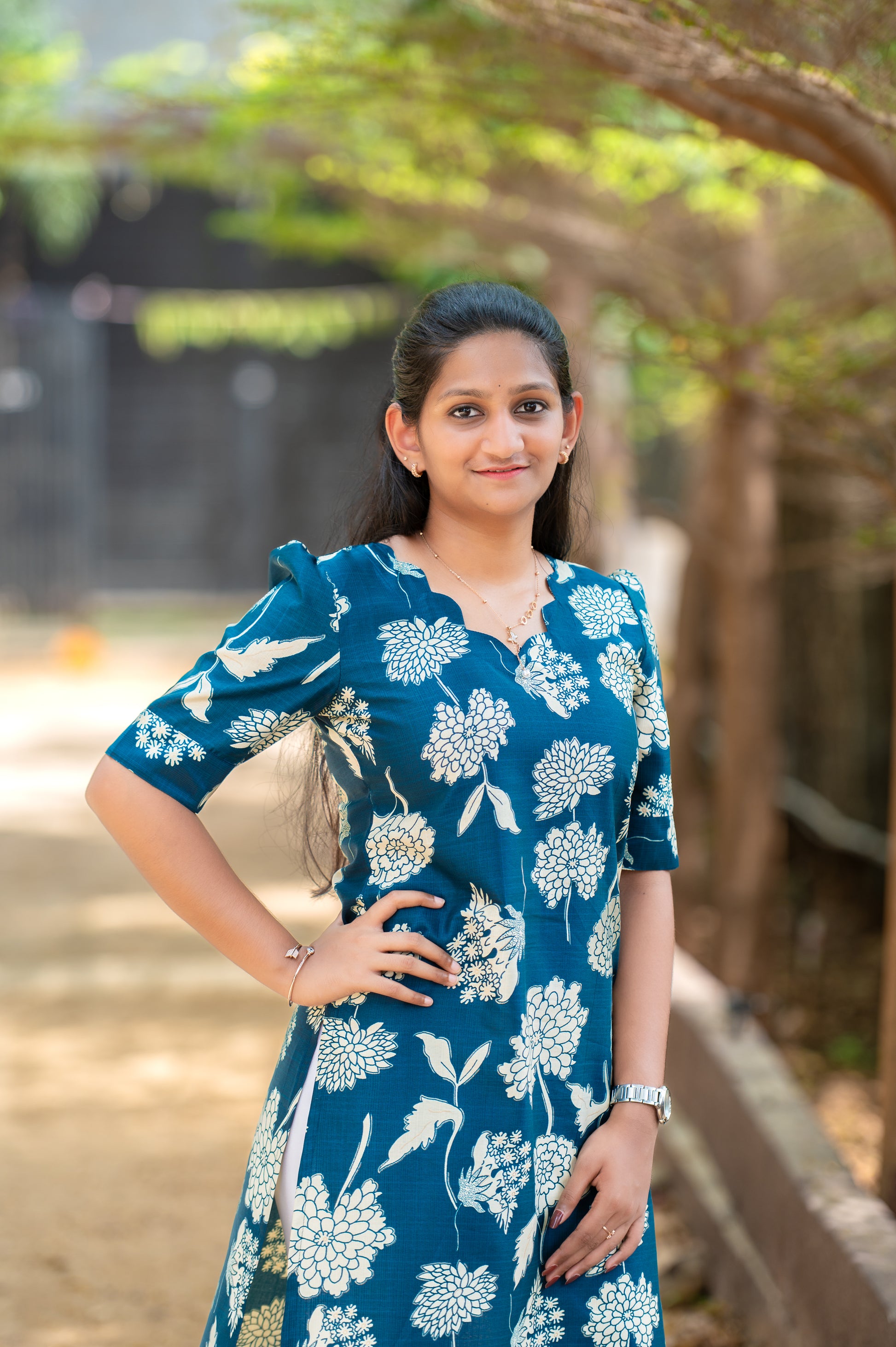 A charming straight-cut kurti featuring elegant off-white floral prints on a rich teal base. The design includes a scalloped neckline with a small keyhole detail, short puff sleeves, and side slits for ease and style. Its classic floral pattern adds sophistication and grace โ perfect for casual and office wear alike.