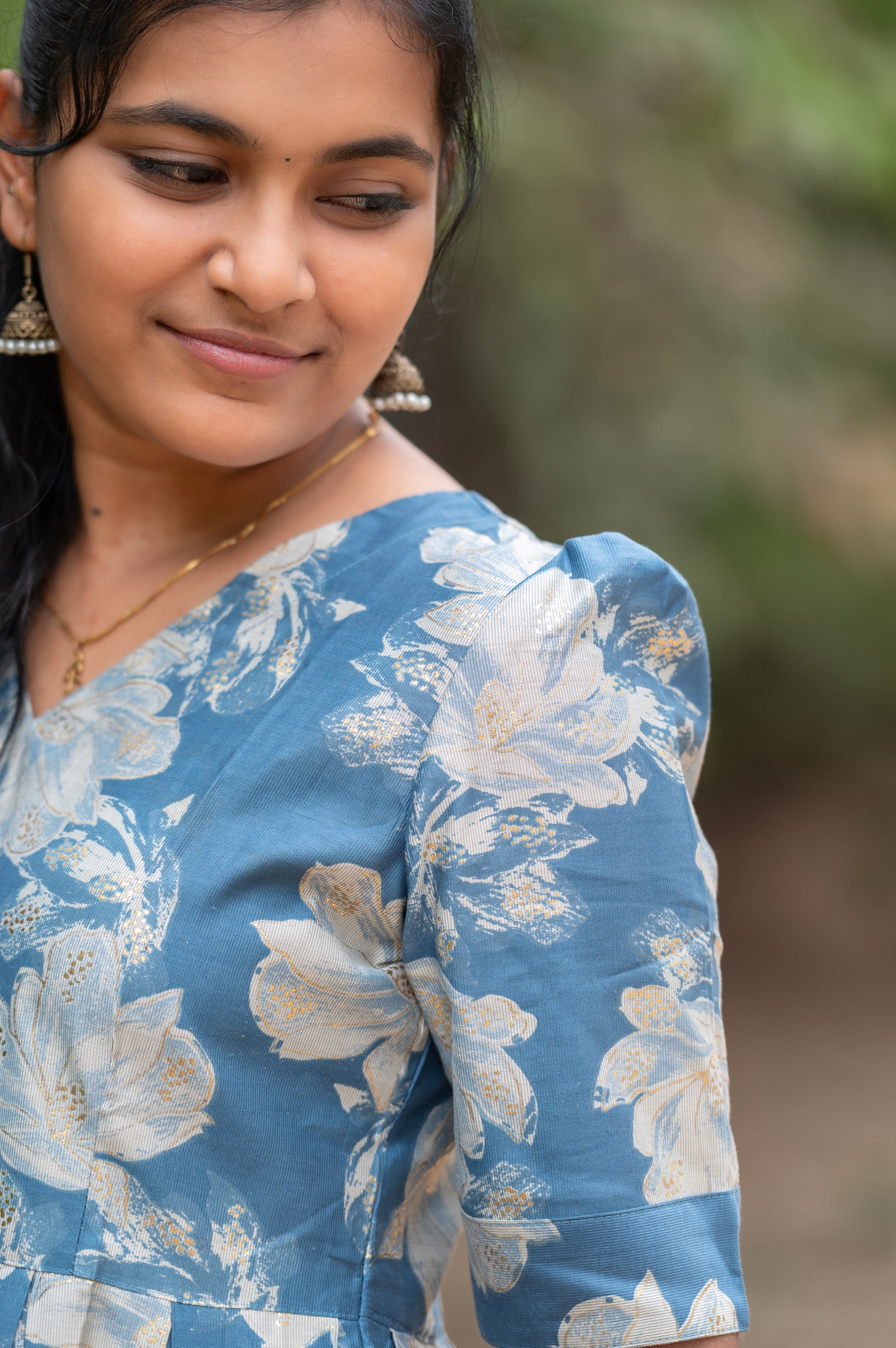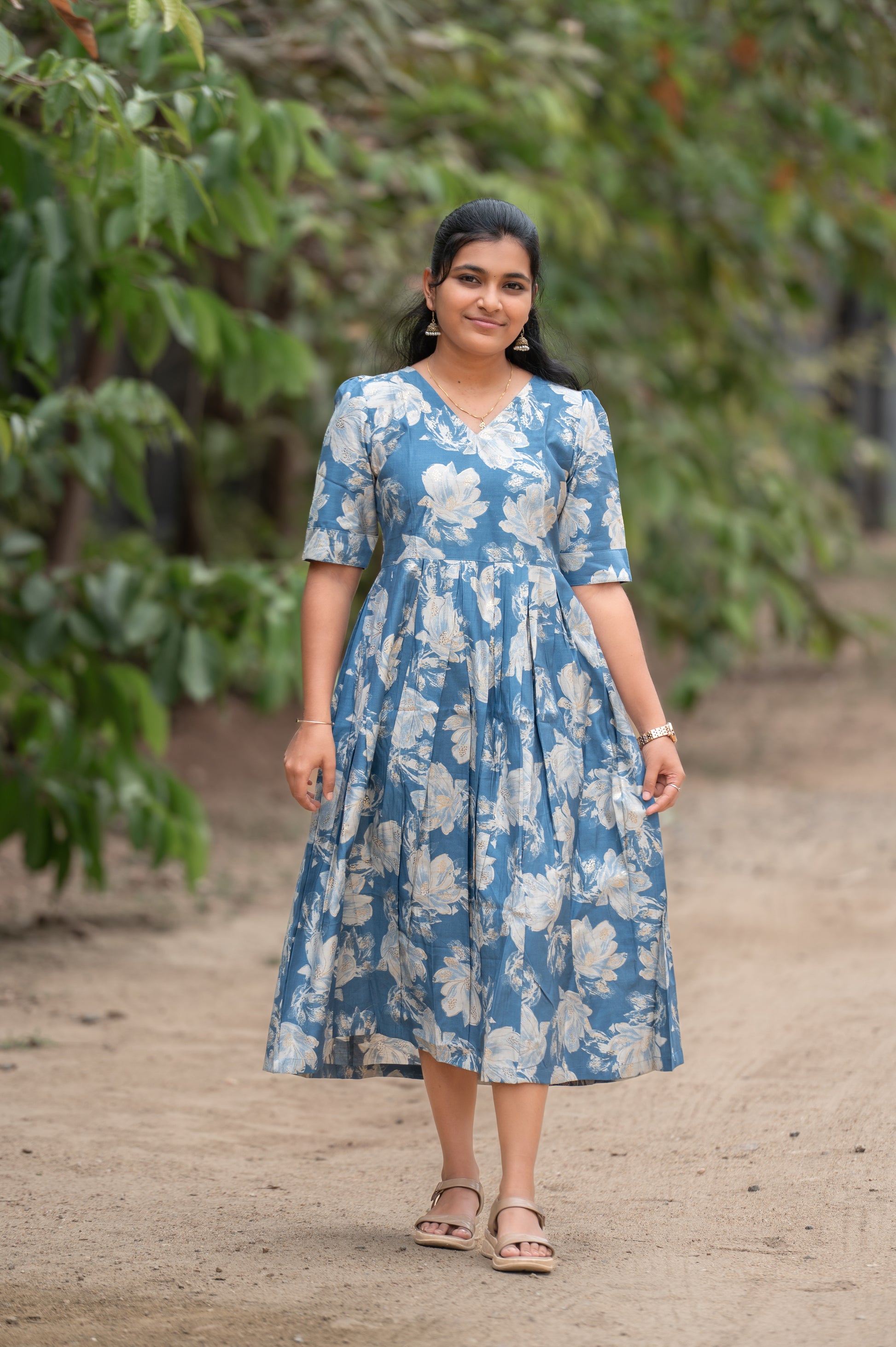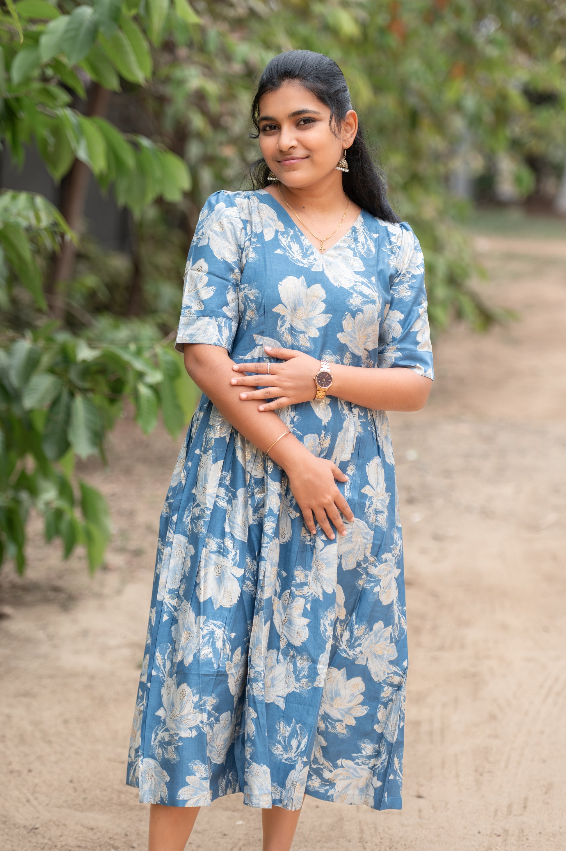 A serene blue fit & flare maxi featuring elegant off-white floral prints that exude calm sophistication. The V-neckline and half sleeves bring a graceful charm, while the gathered waistline gives a flattering, flowy silhouette — perfect for casual day wear, festive get-togethers, or semi-formal occasions.