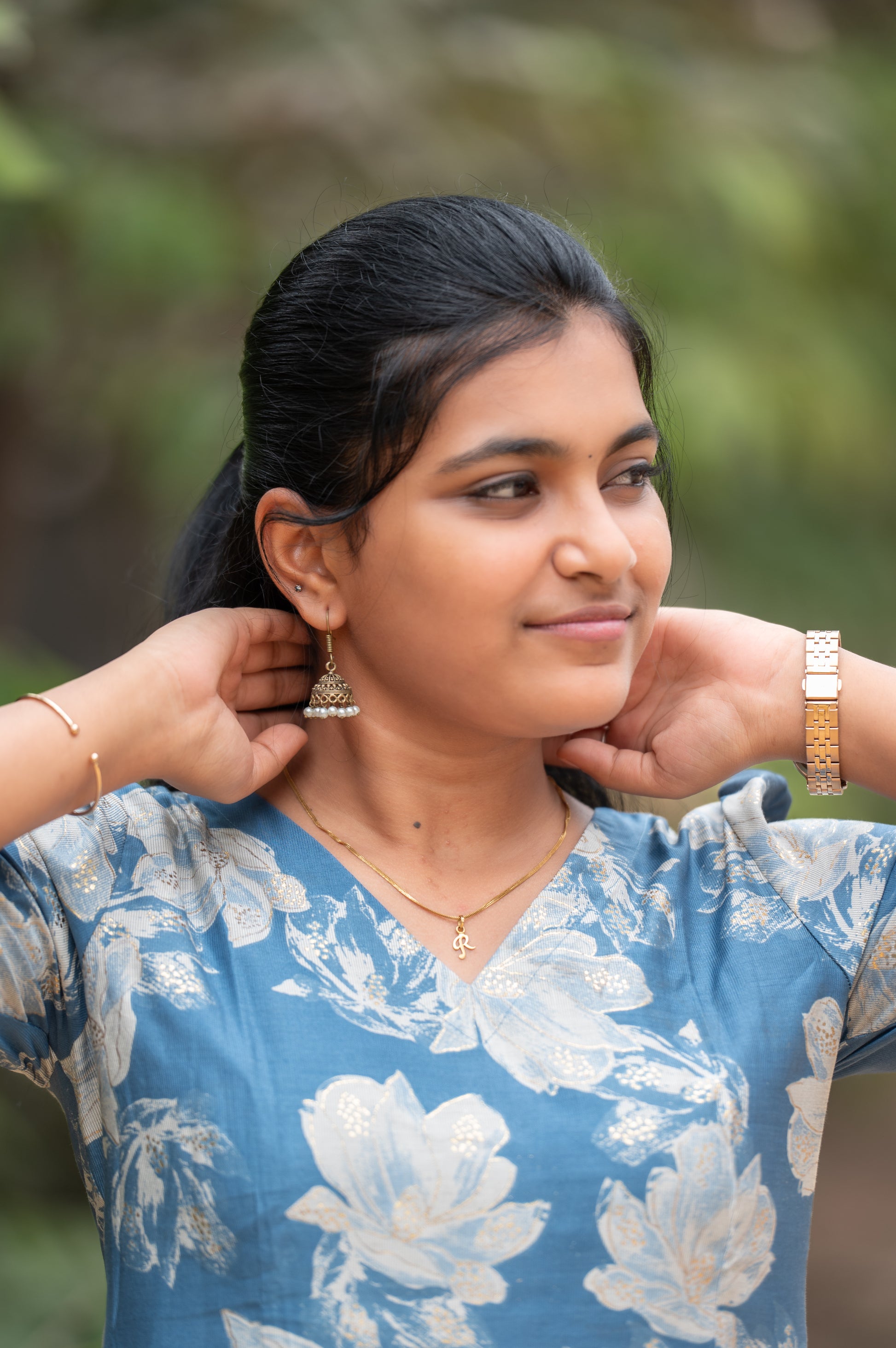 Accentuate with silver jhumkas or pearl earrings, a delicate