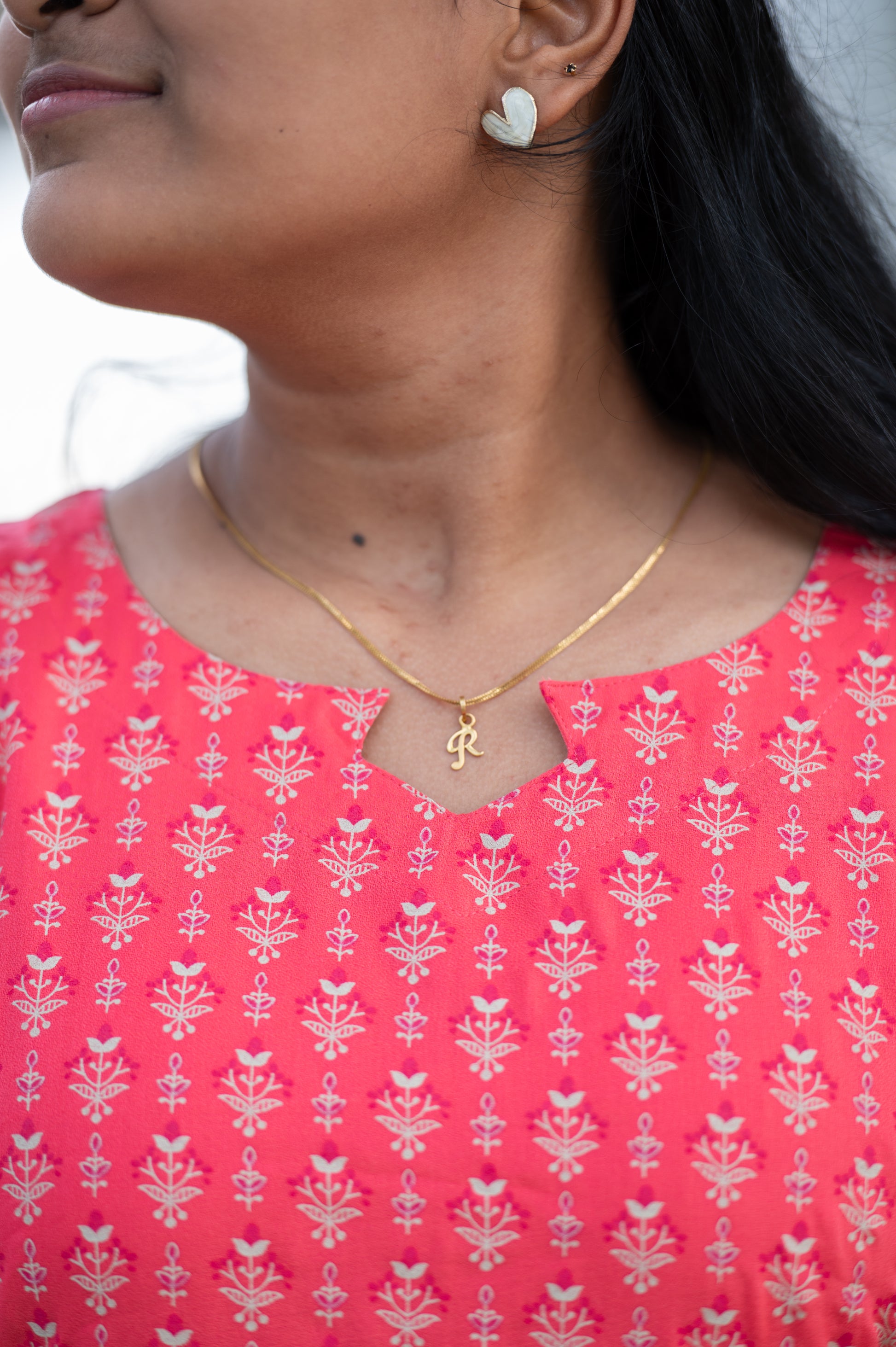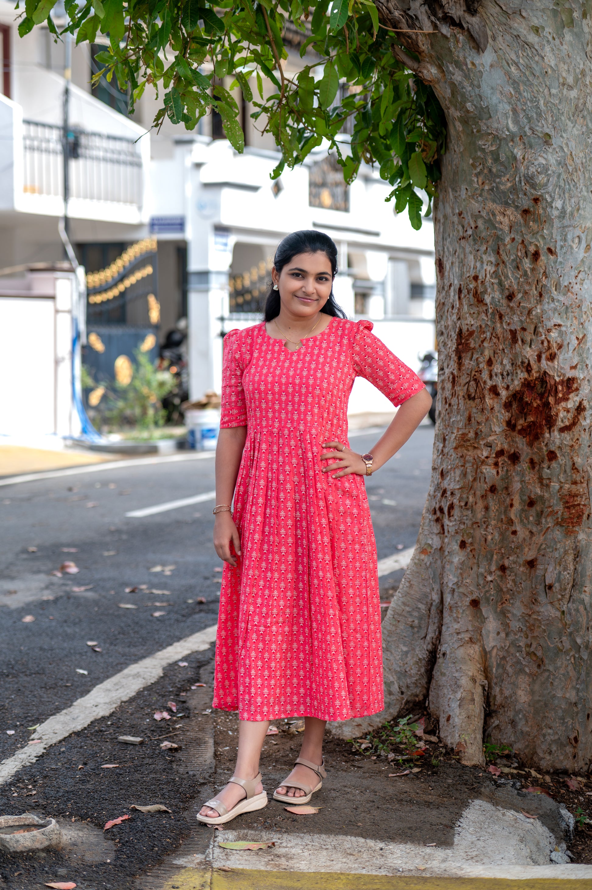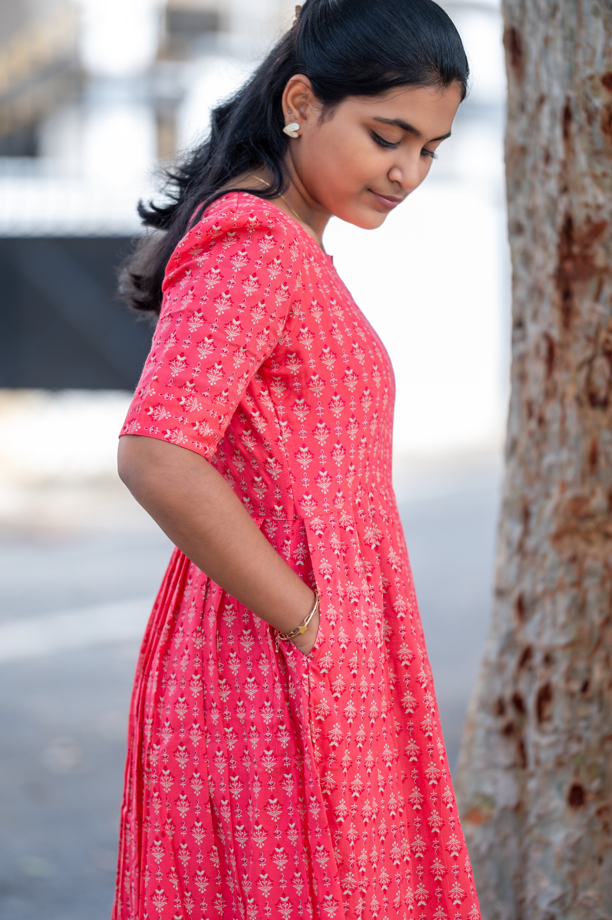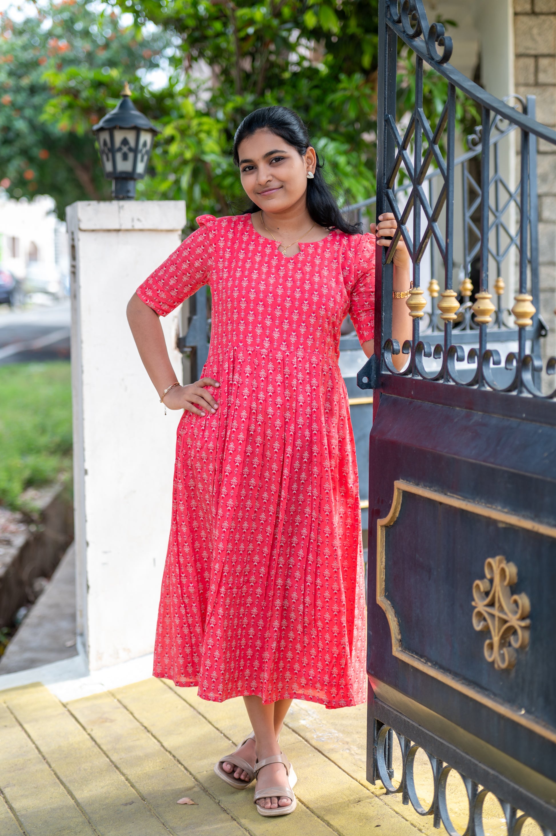 A graceful coral red maxi featuring delicate ethnic motifs and a flattering fit-and-flare silhouette. Perfect for casual outings, festive gatherings, or day events.