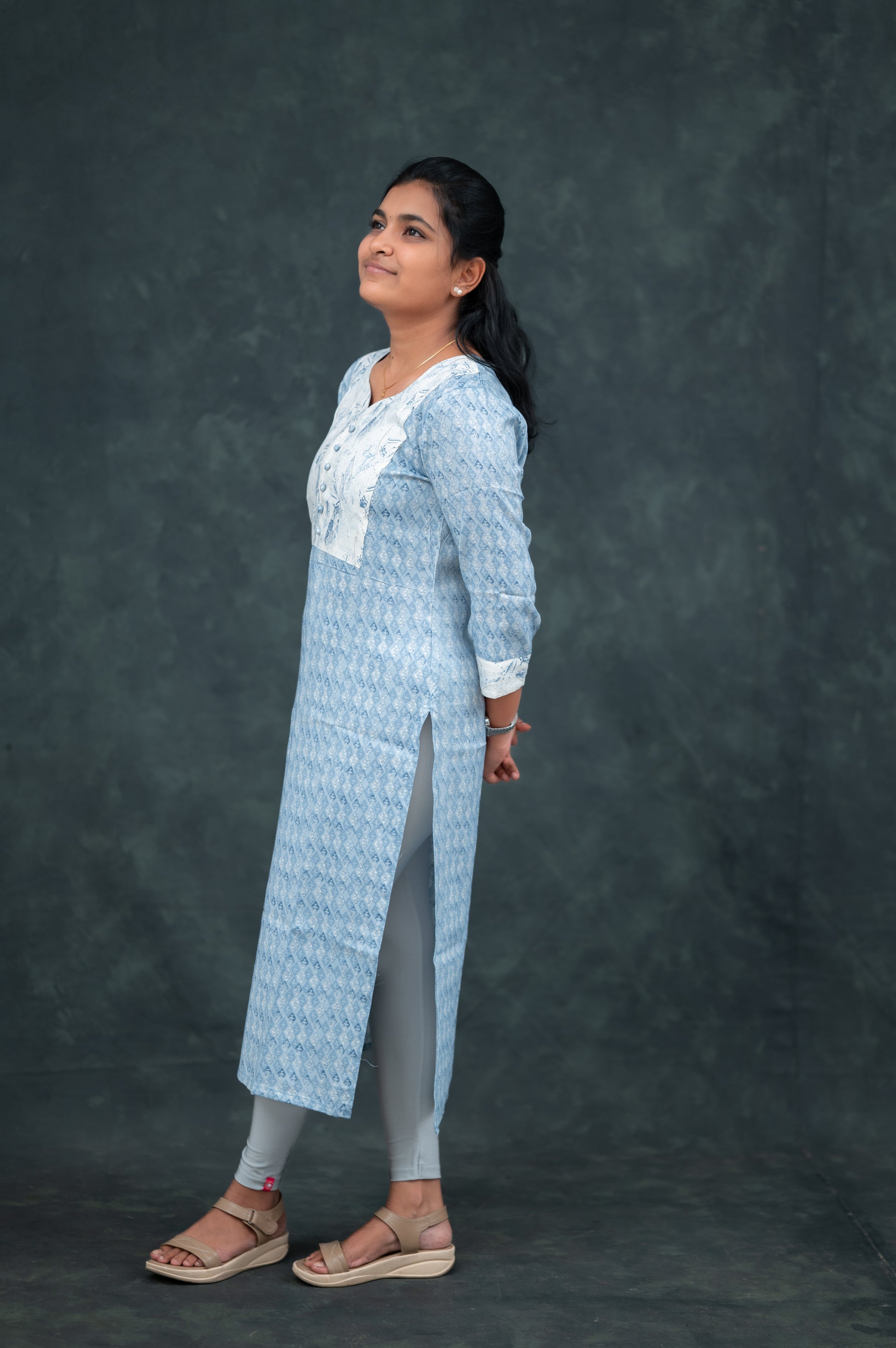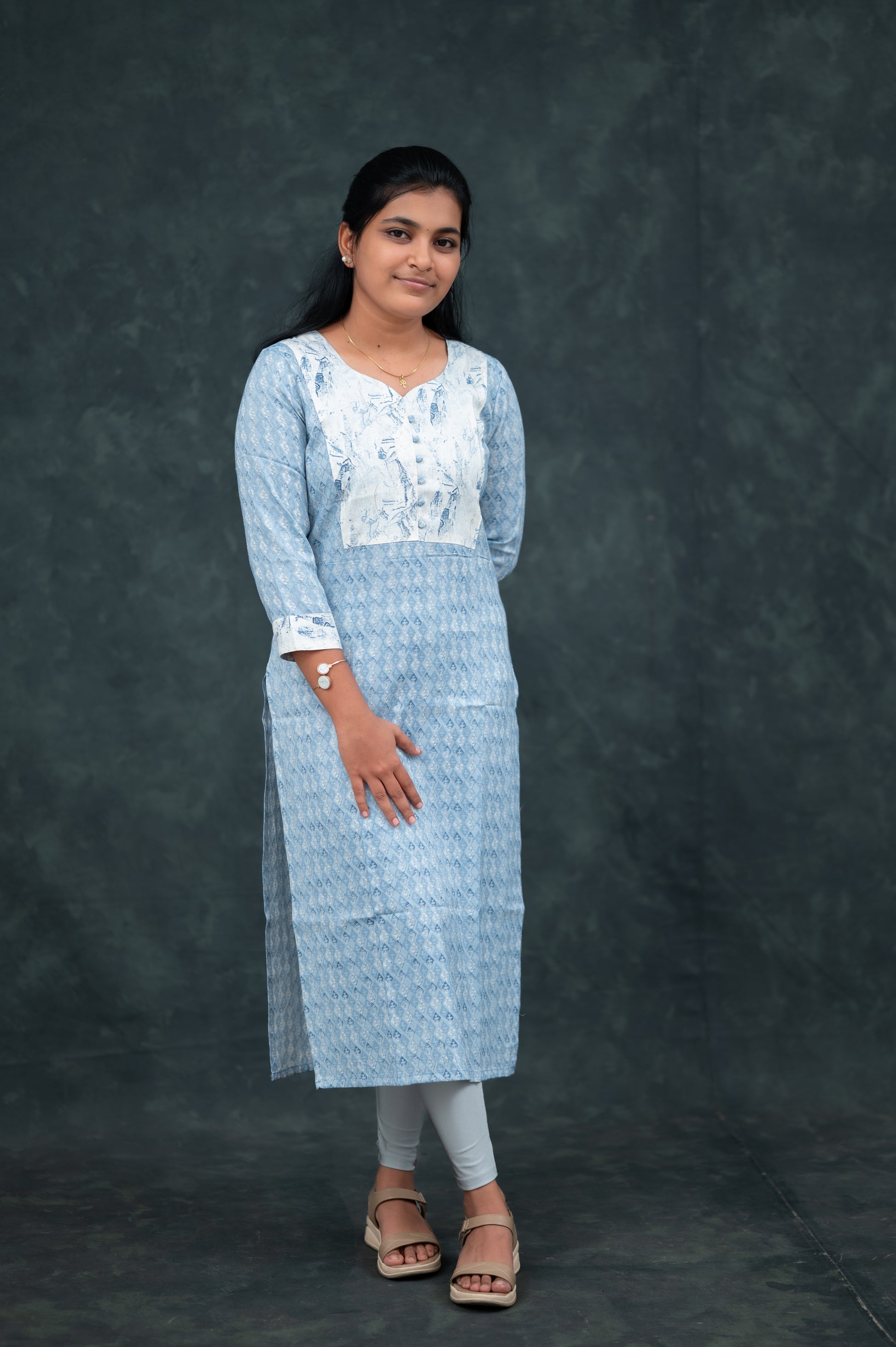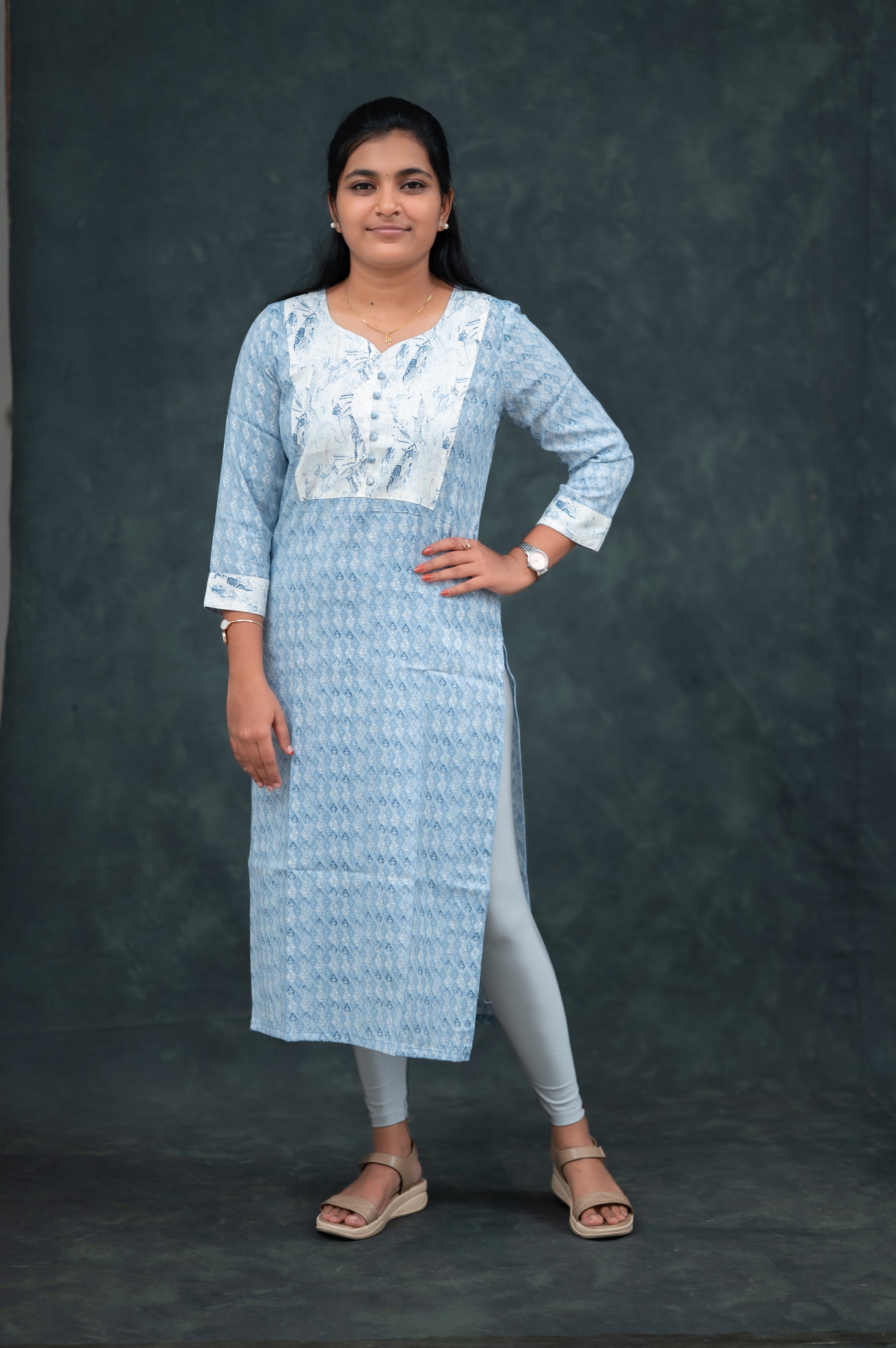 A graceful blend of simplicity and elegance, this sky blue straight-cut kurti features delicate prints and a striking white yoke design. Its breathable fabric and soft color palette make it ideal for everyday wear, office settings, or casual outings.