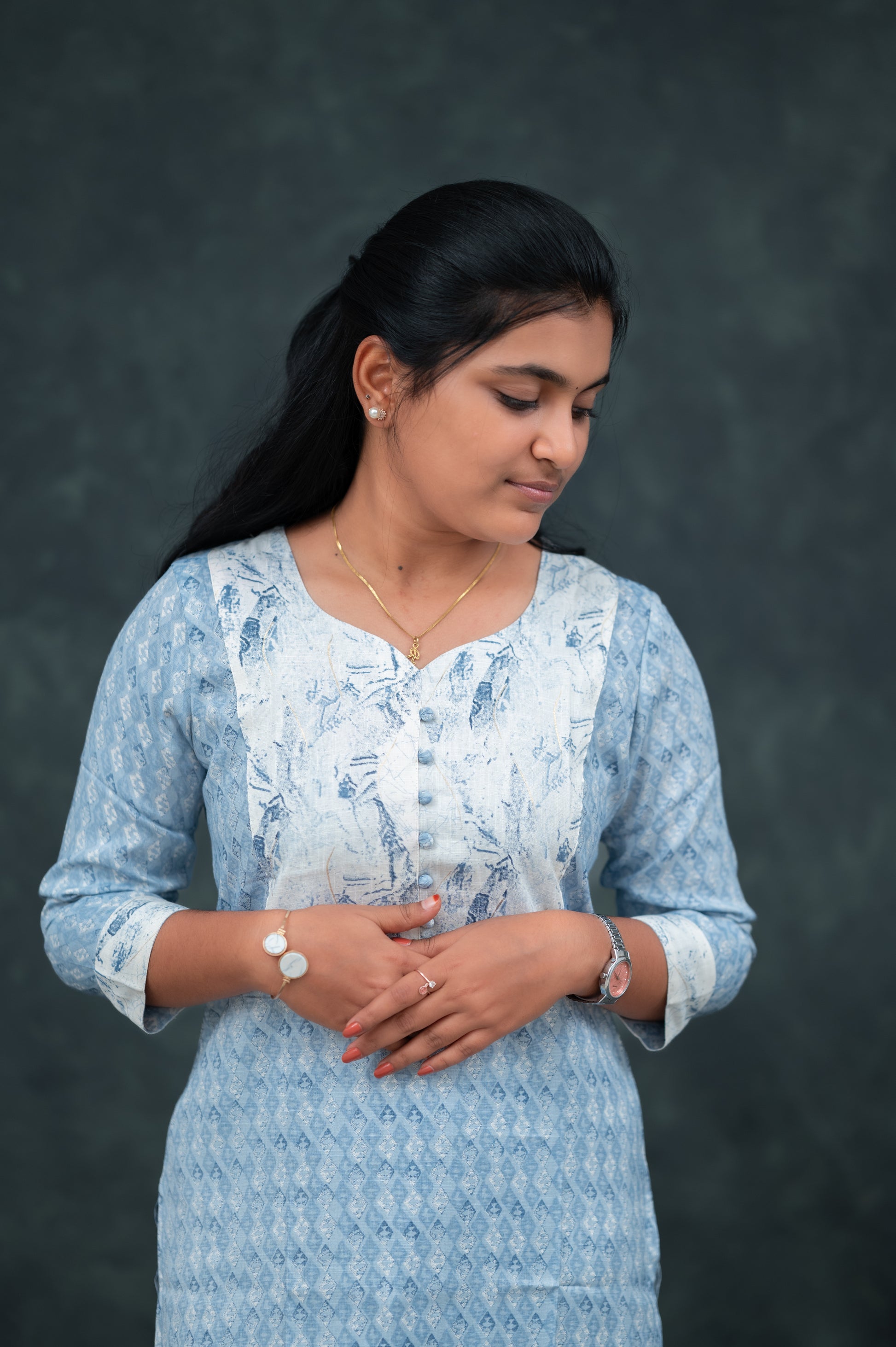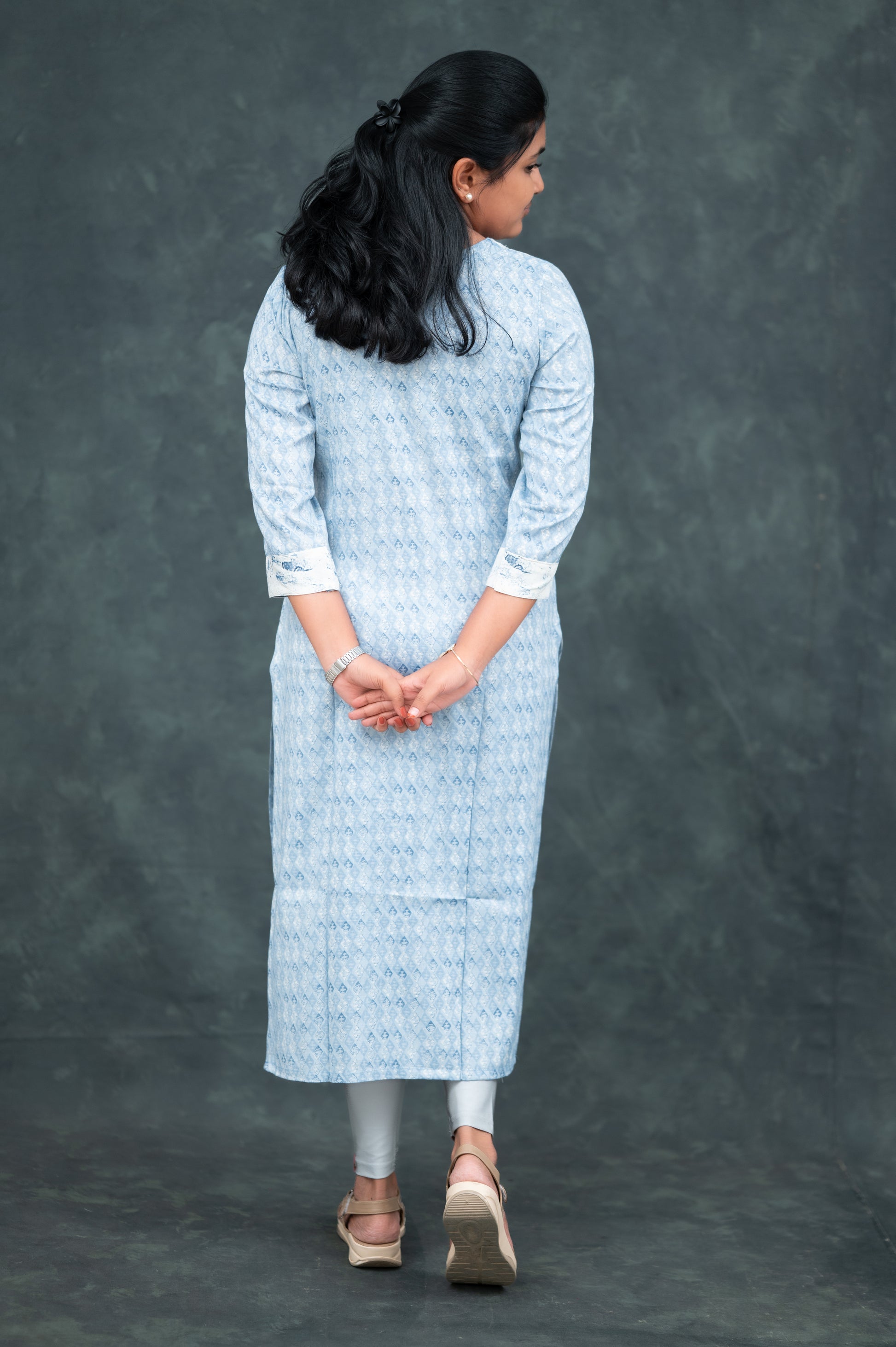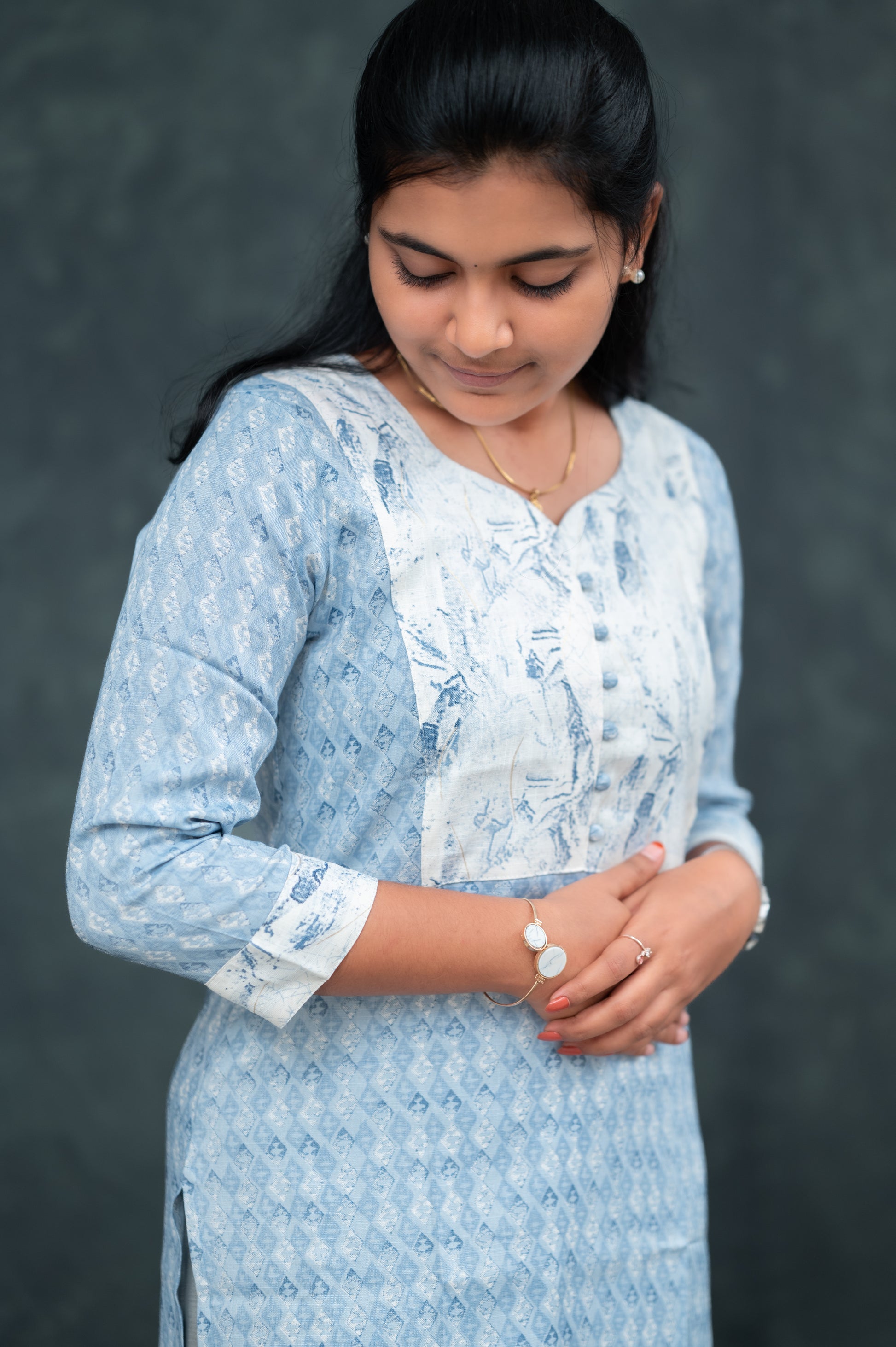 A graceful blend of simplicity and elegance, this sky blue straight-cut kurti features delicate prints and a striking white yoke design. Its breathable fabric and soft color palette make it ideal for everyday wear, office settings, or casual outings.