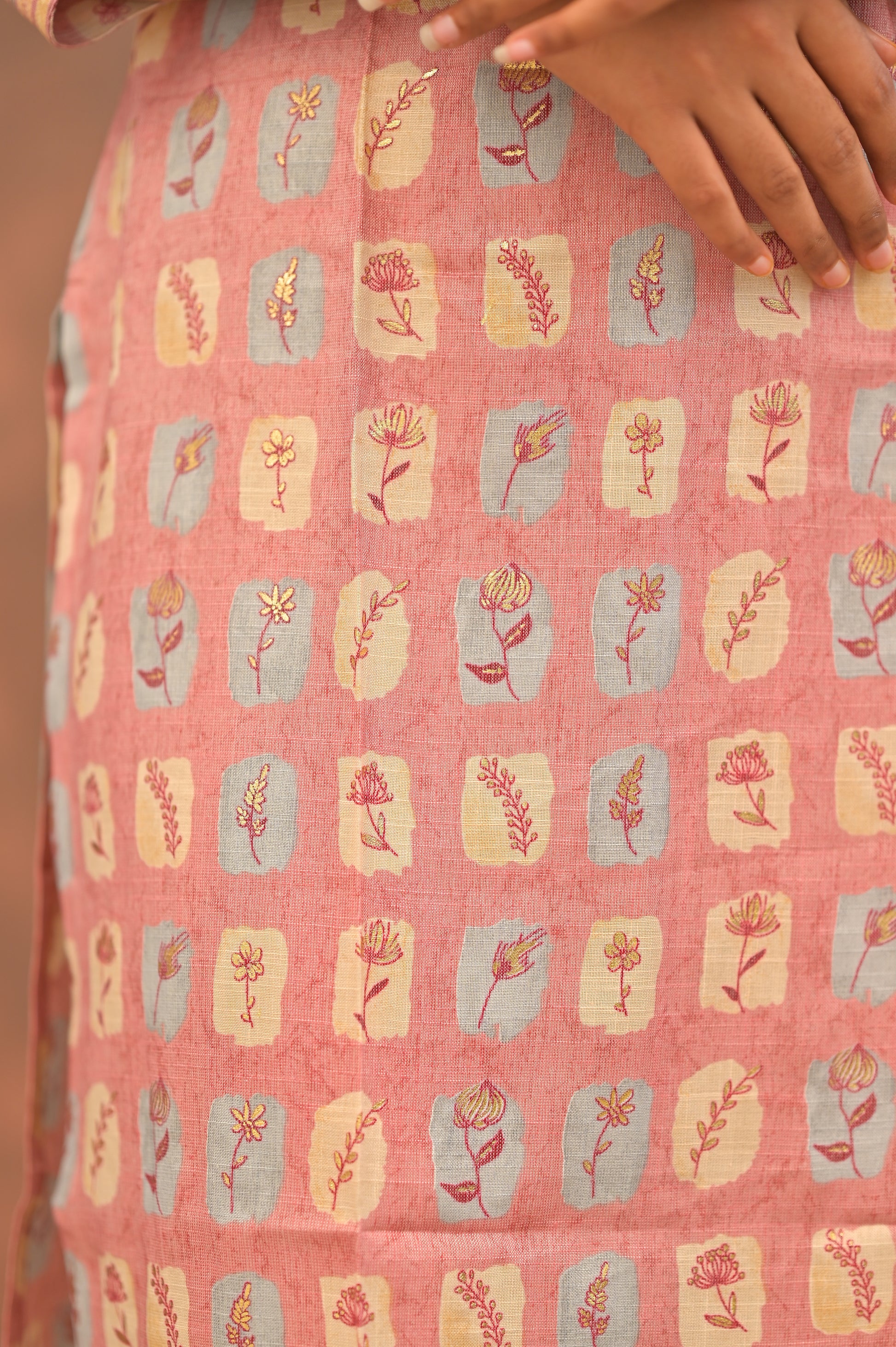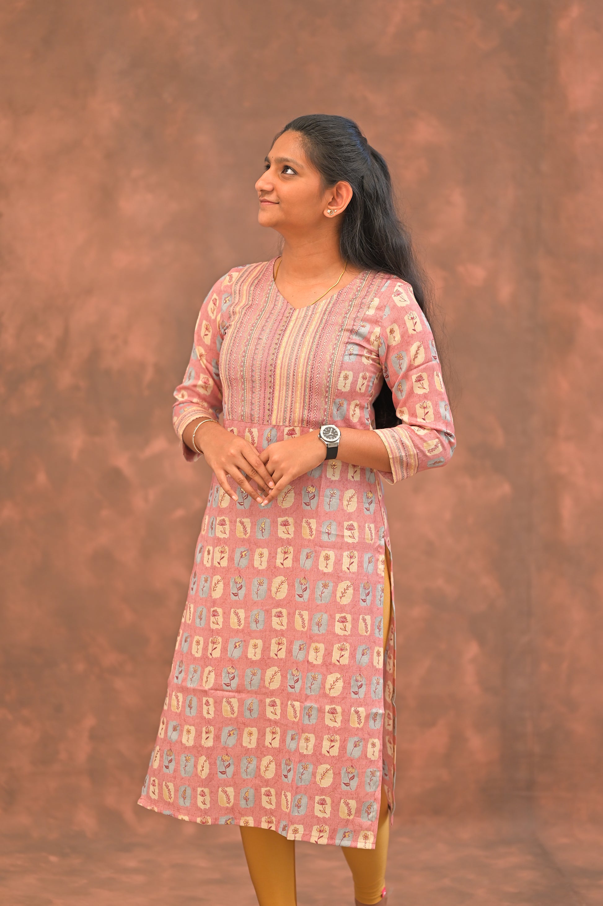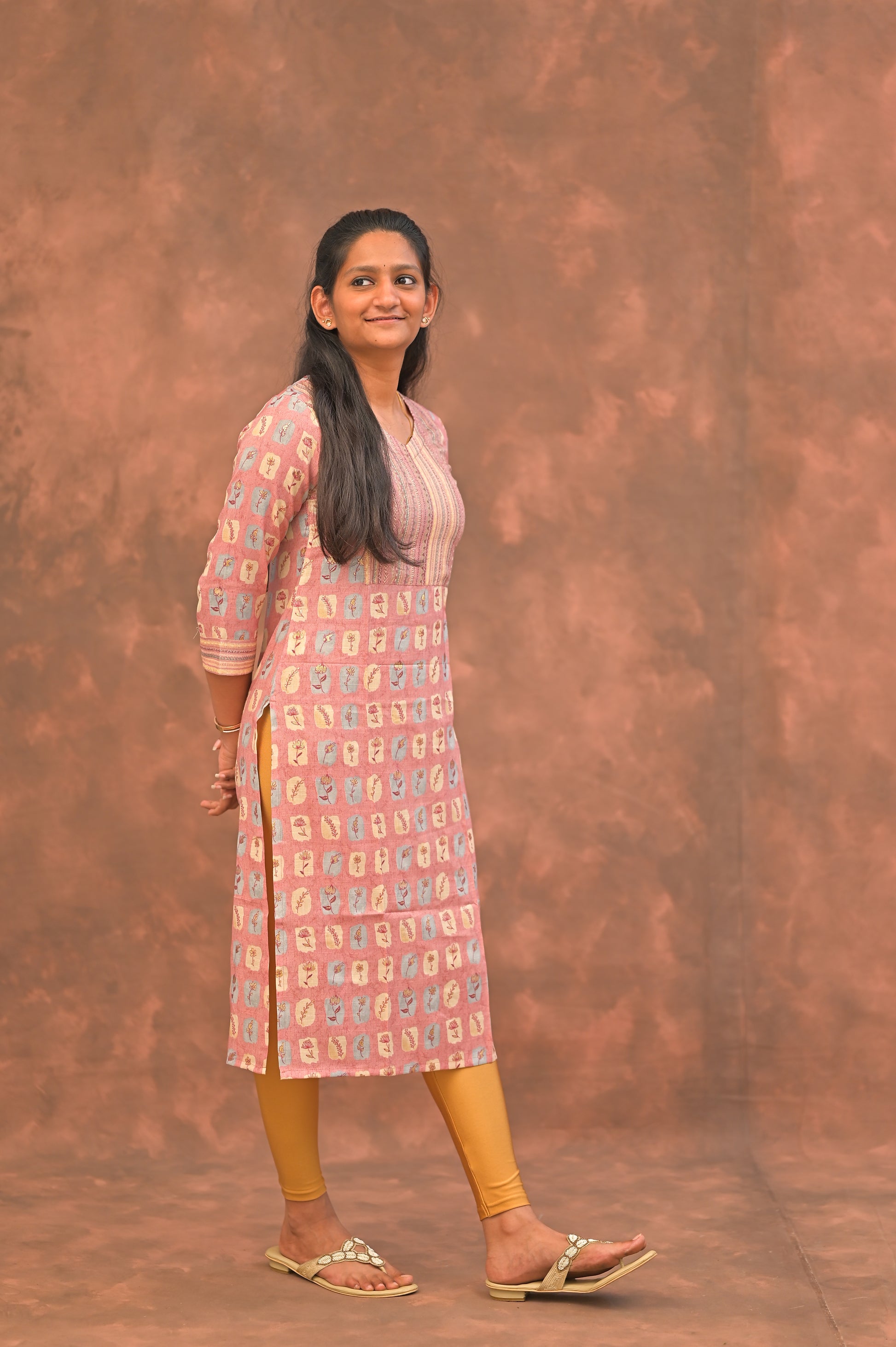 This kurti features a unique block-printed mosaic pattern across the body, with a mix of abstract and floral motifs arranged in soft square tiles. The yoke area has contrasting vertical tribal-inspired stripes, adding a structured and artistic flair.