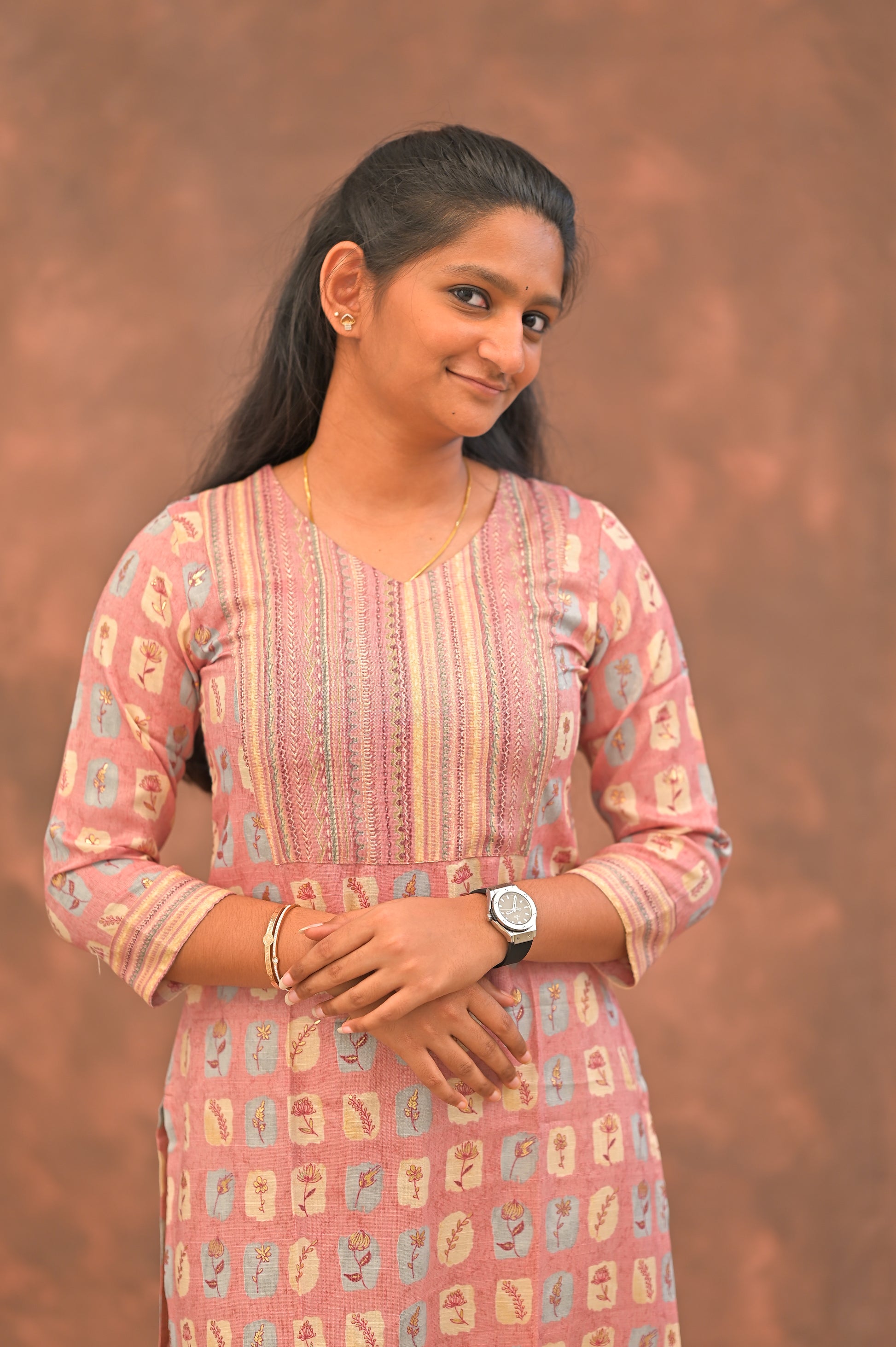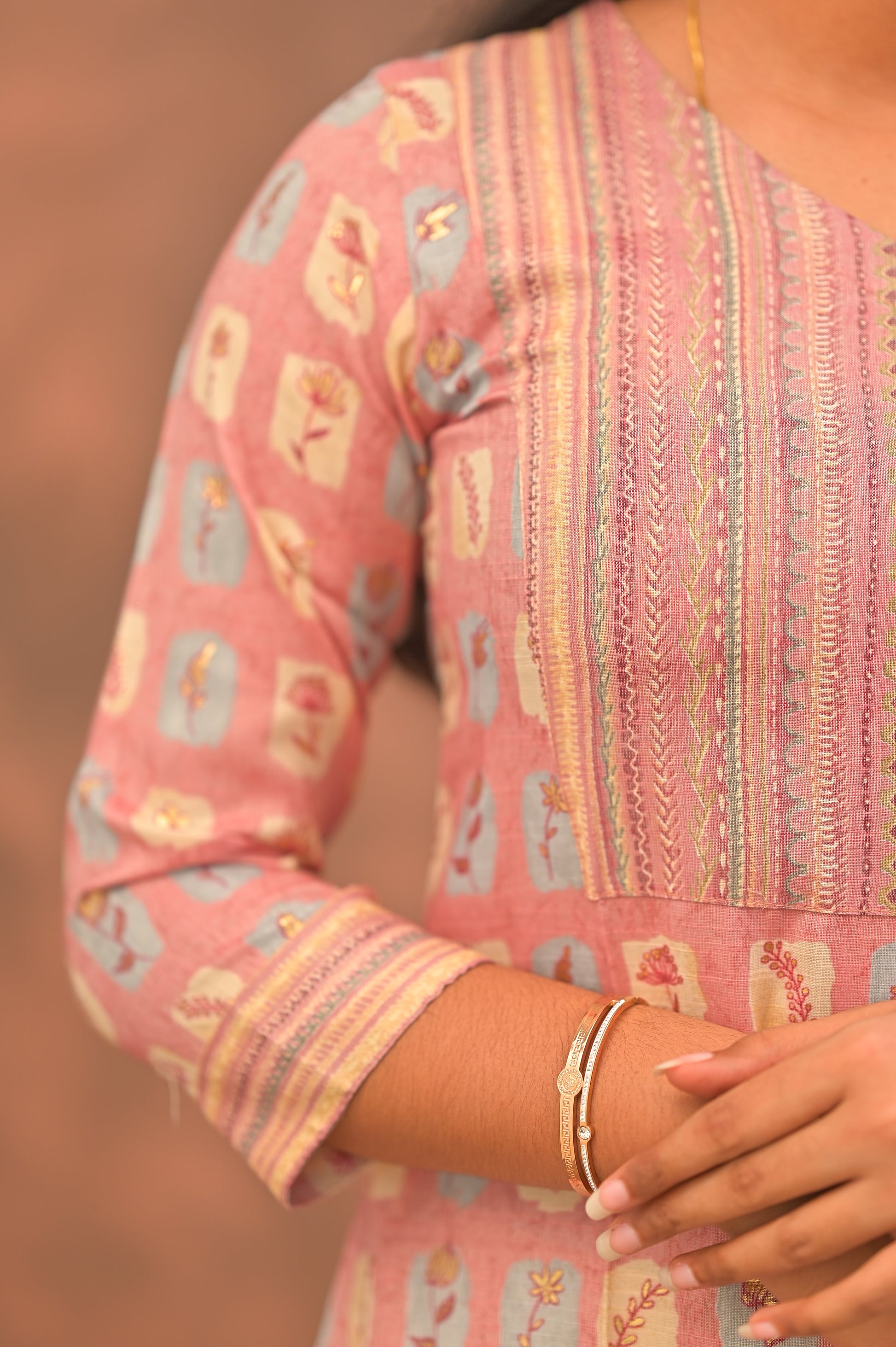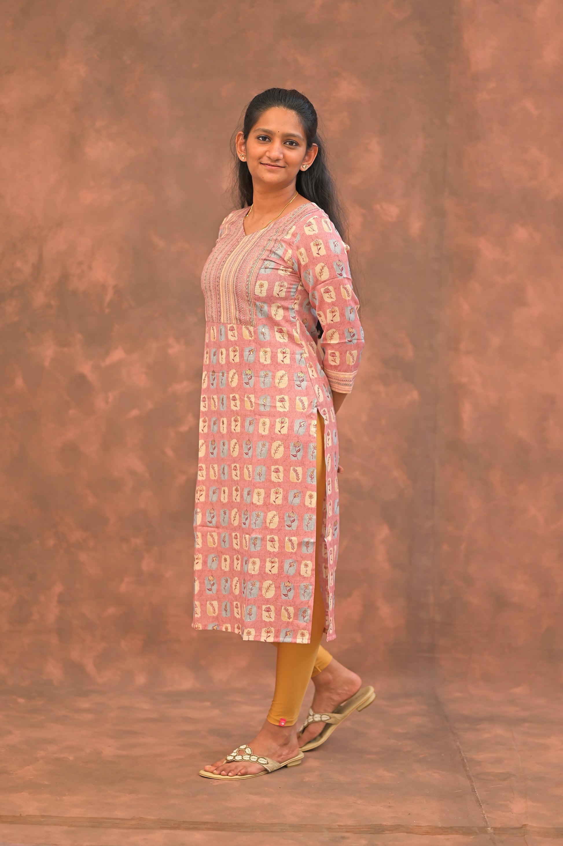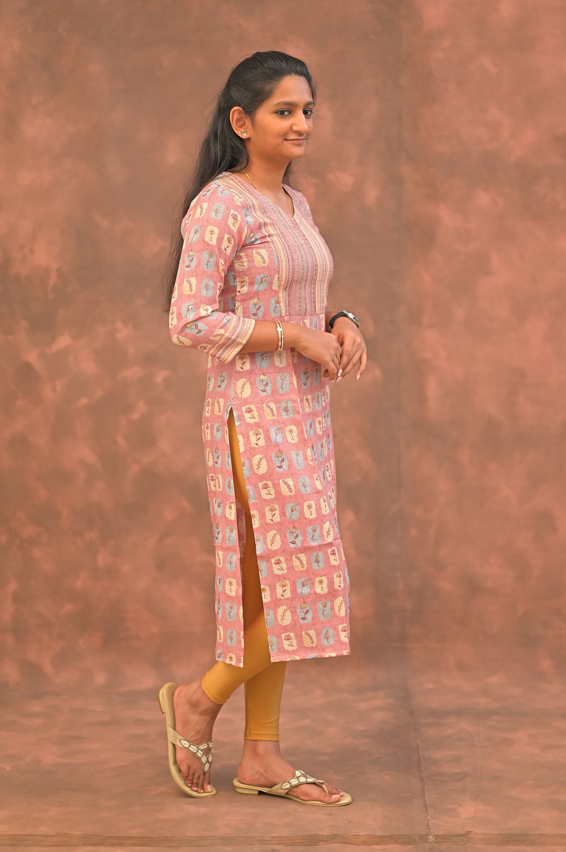 This kurti features a unique block-printed mosaic pattern across the body, with a mix of abstract and floral motifs arranged in soft square tiles. The yoke area has contrasting vertical tribal-inspired stripes, adding a structured and artistic flair.