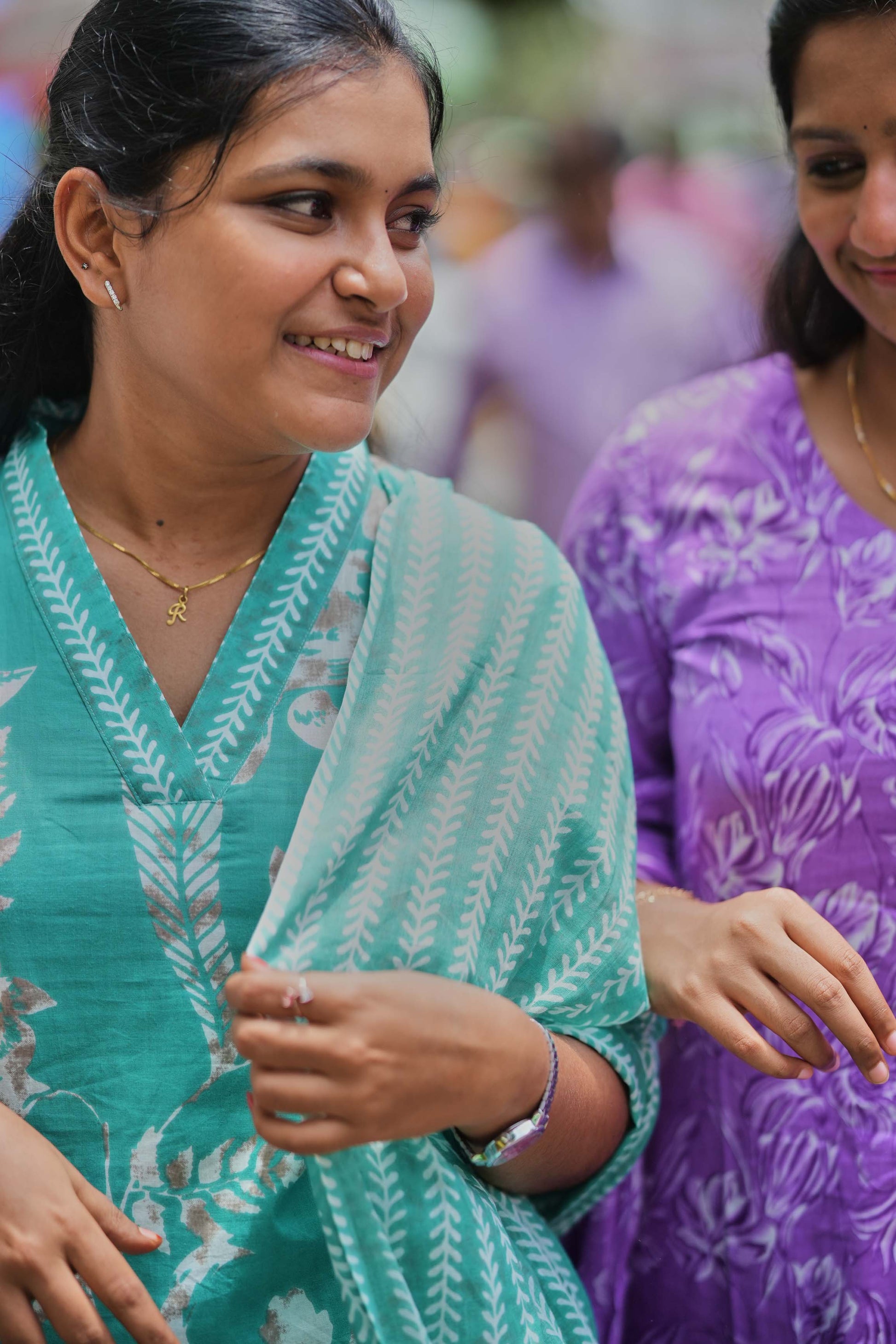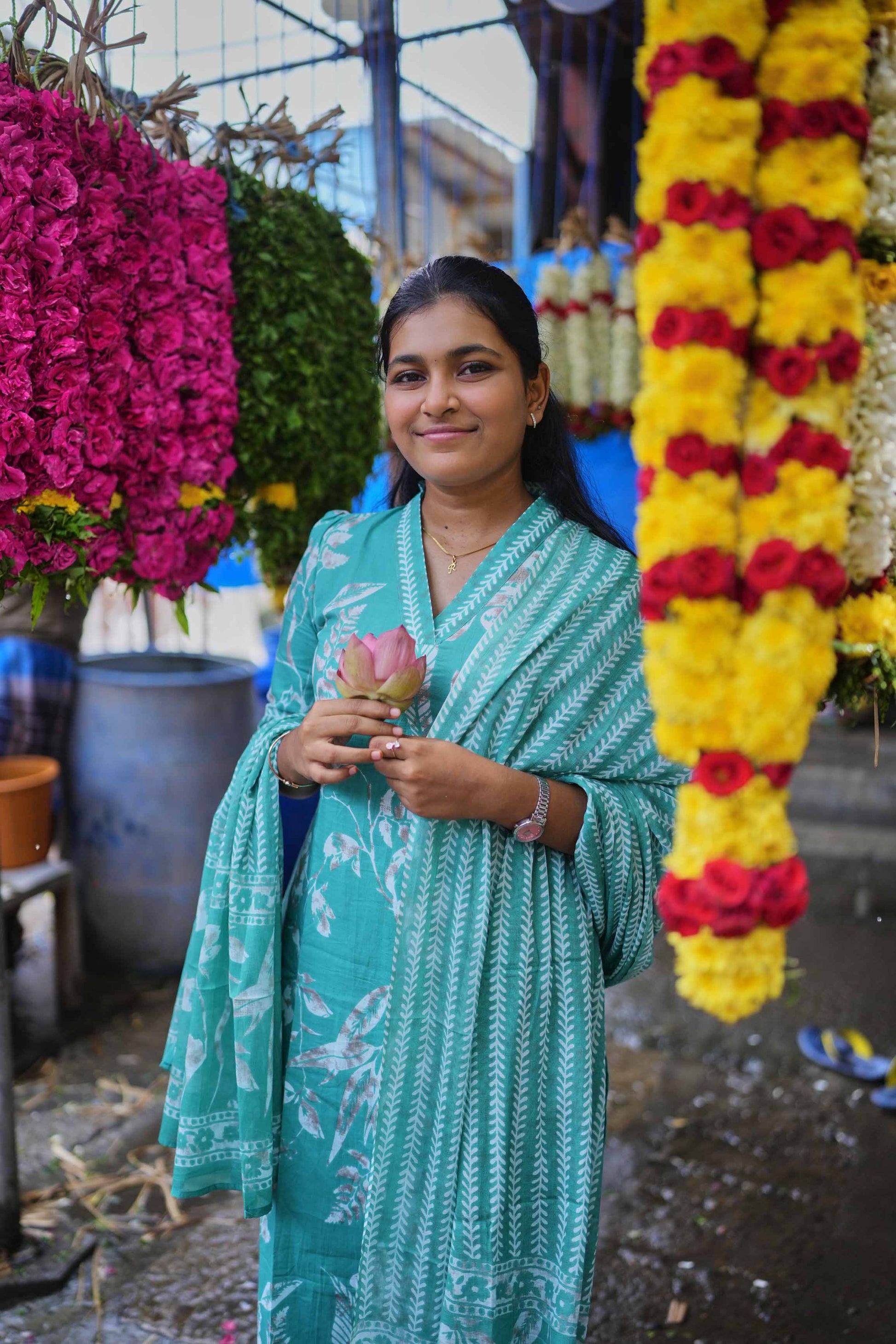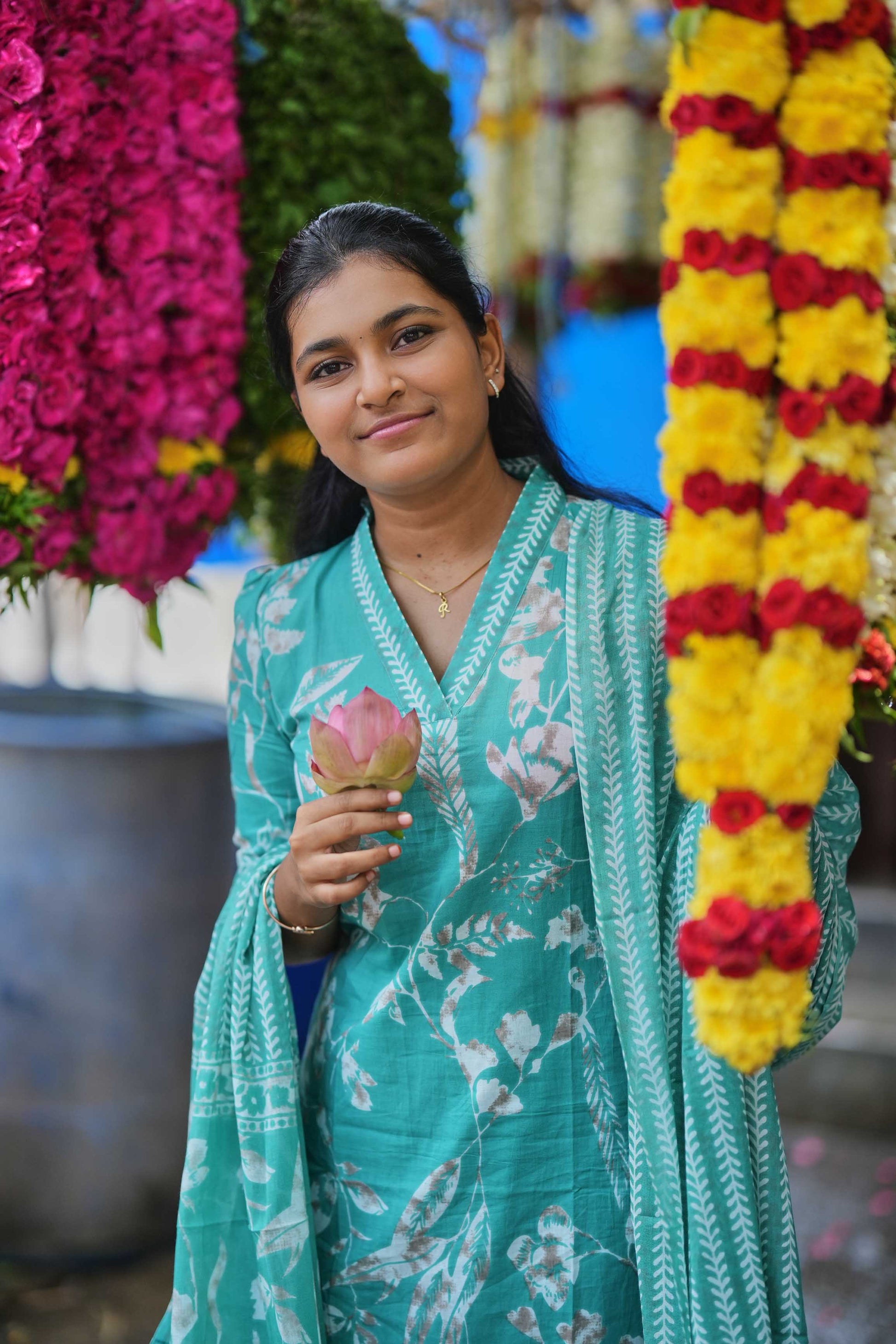 A graceful turquoise kurti with floral prints, paired with a matching dupatta and pants, designed to bring a refreshing festive charm.
