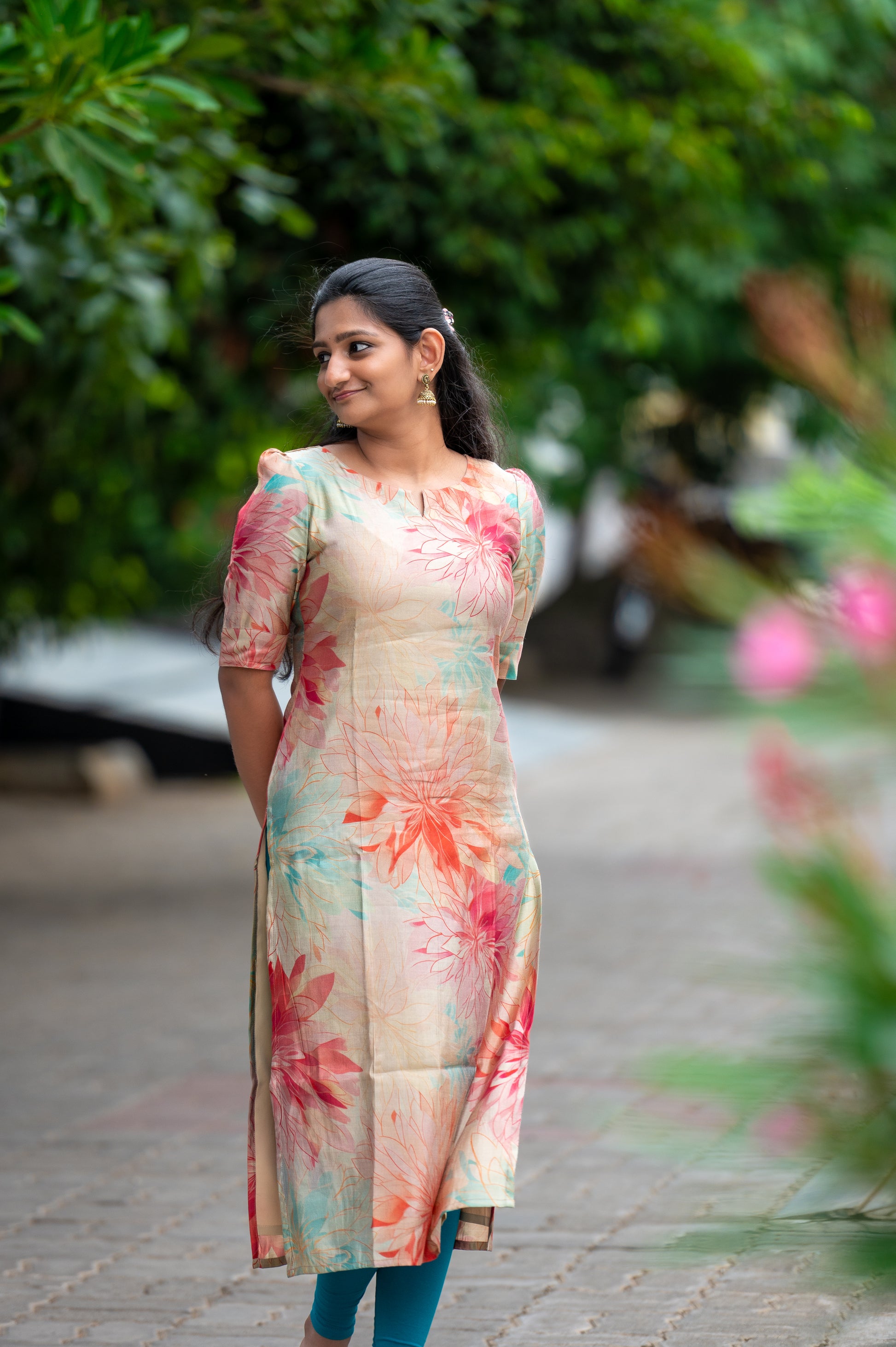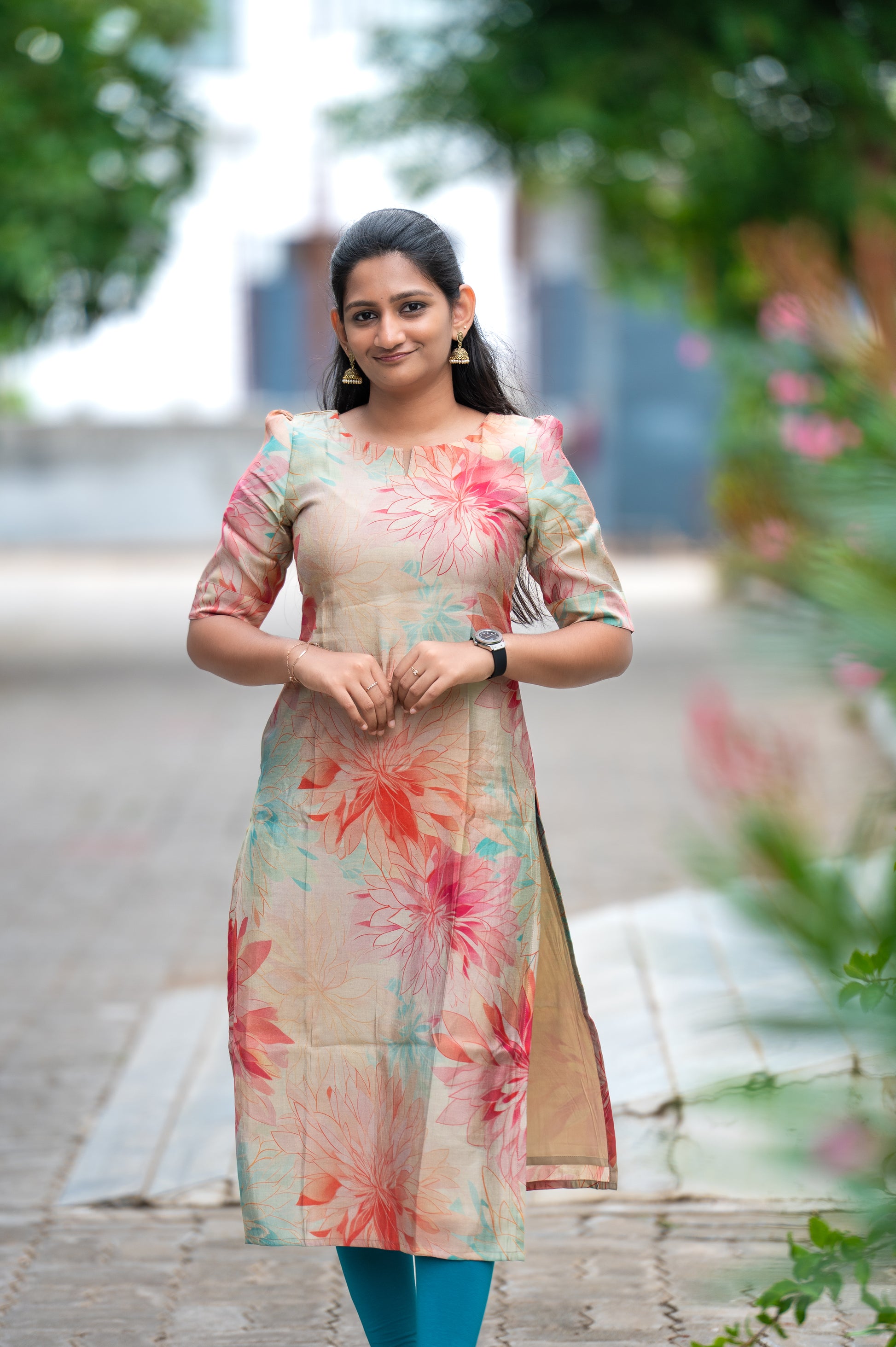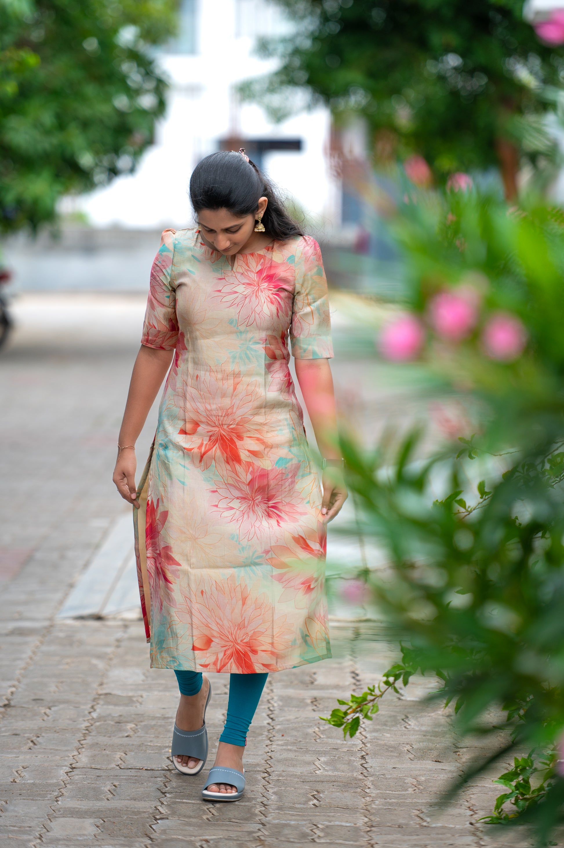 A harmony of pastel elegance, Petal Whispers is adorned with dreamy floral motifs in soft corals, blush pinks, and gentle aqua tones. Set against a light beige backdrop, the kurti flows with a serene grace that’s perfect for breezy mornings or relaxed outings.
