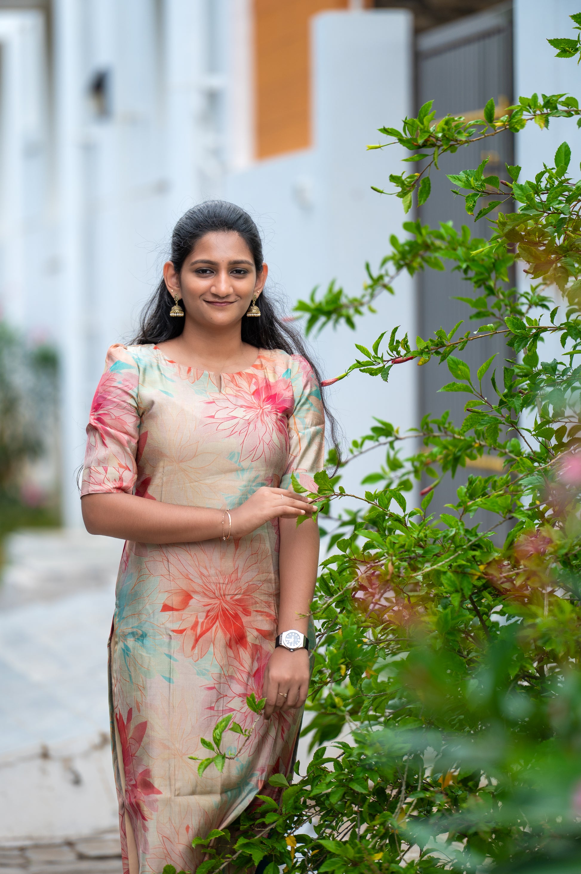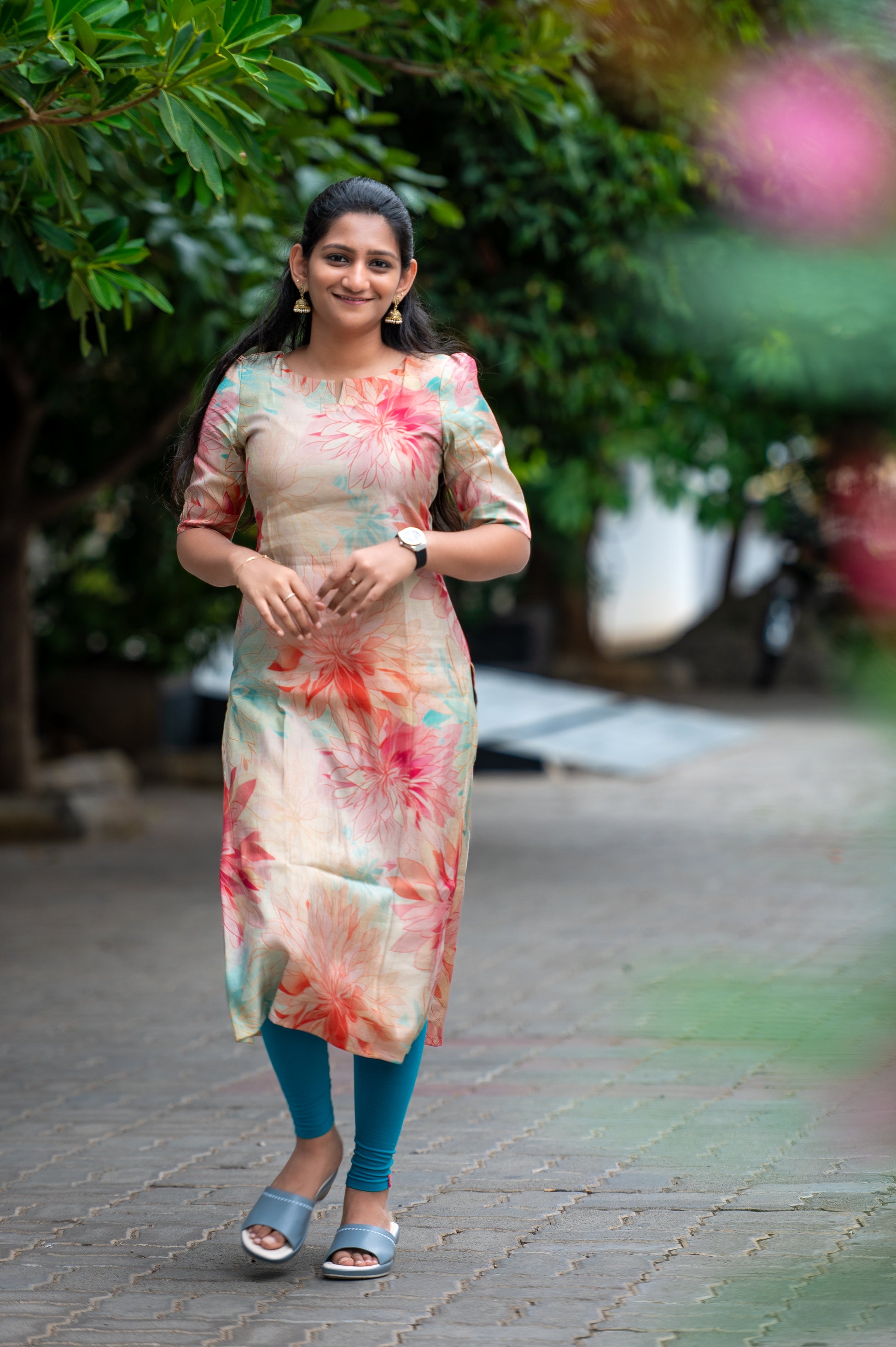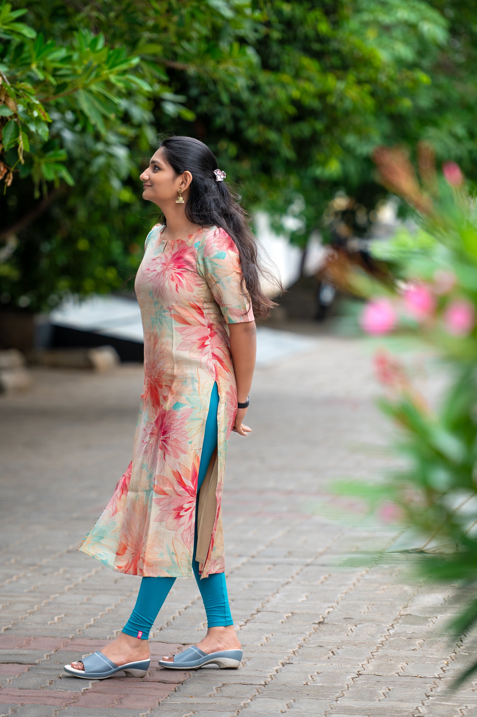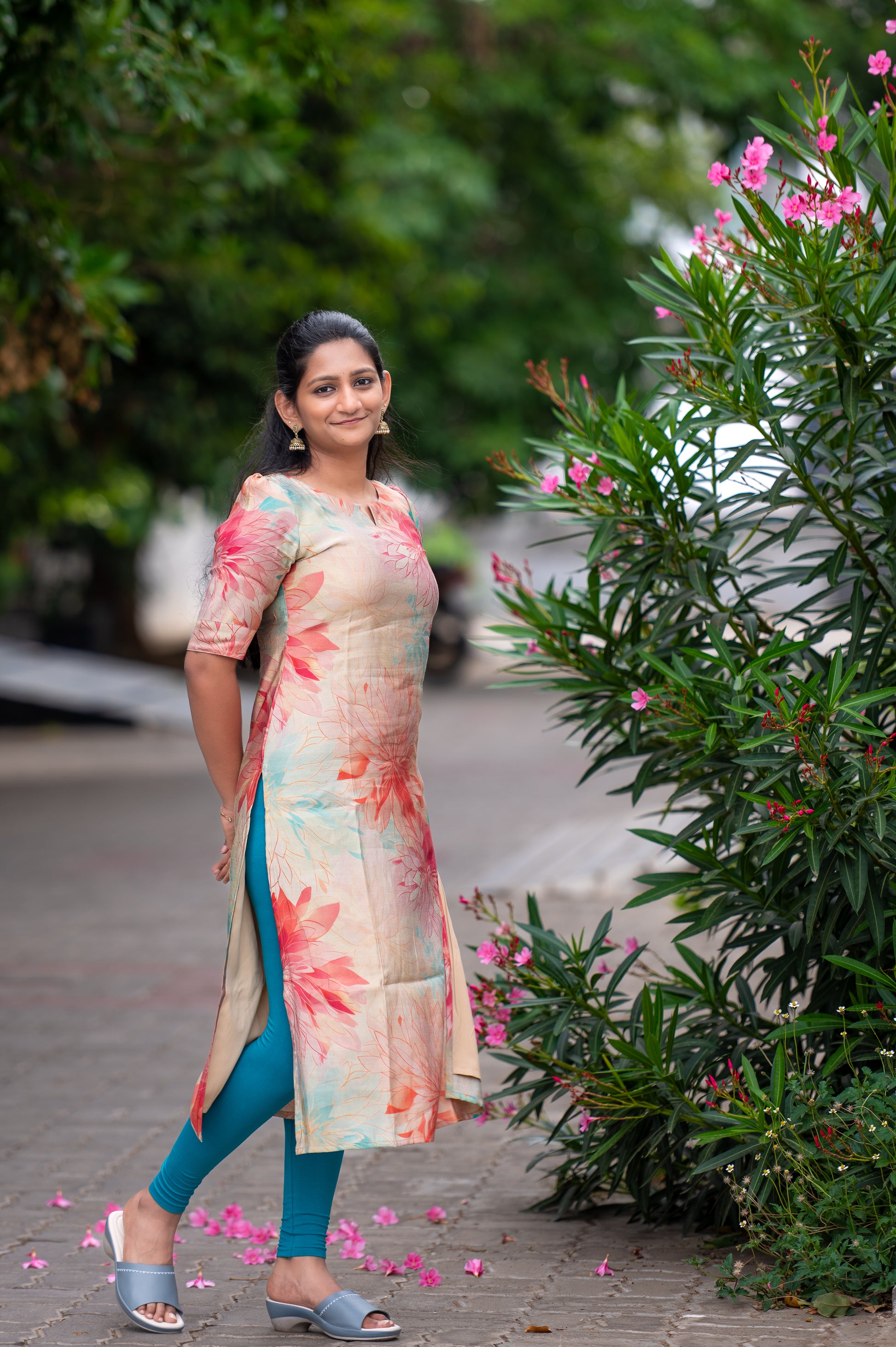 A harmony of pastel elegance, Petal Whispers is adorned with dreamy floral motifs in soft corals, blush pinks, and gentle aqua tones. Set against a light beige backdrop, the kurti flows with a serene grace that’s perfect for breezy mornings or relaxed outings.