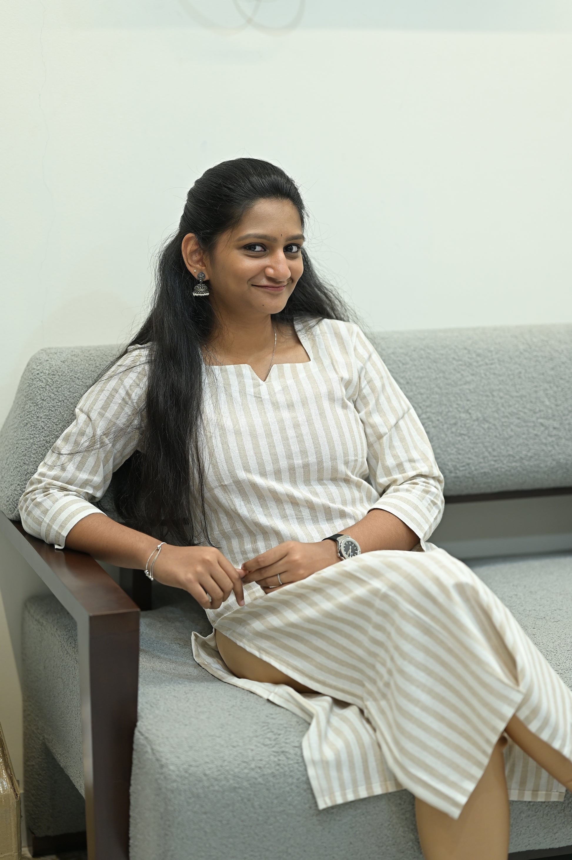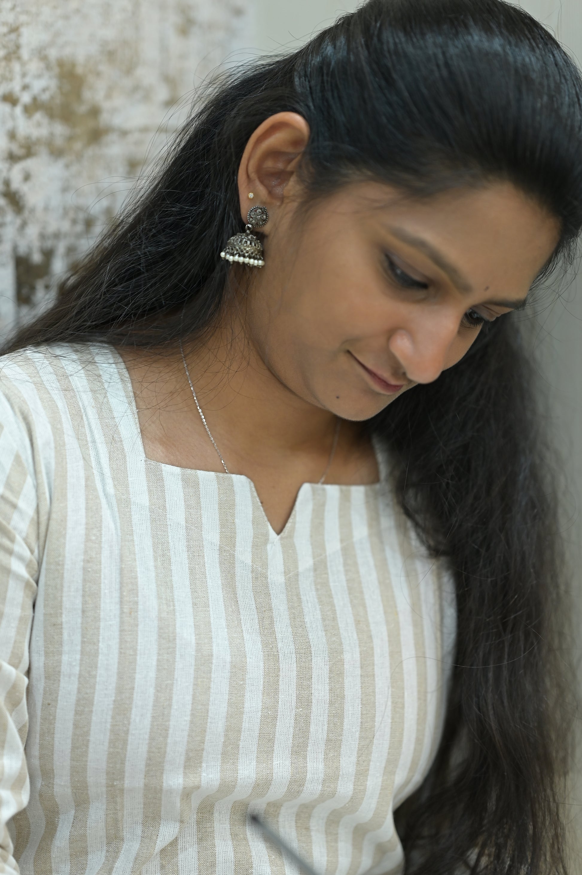 This chic beige kurti with vertical white stripes brings a clean and modern vibe. Its sleek design and straight cut make it perfect for both workwear and casual outings.
