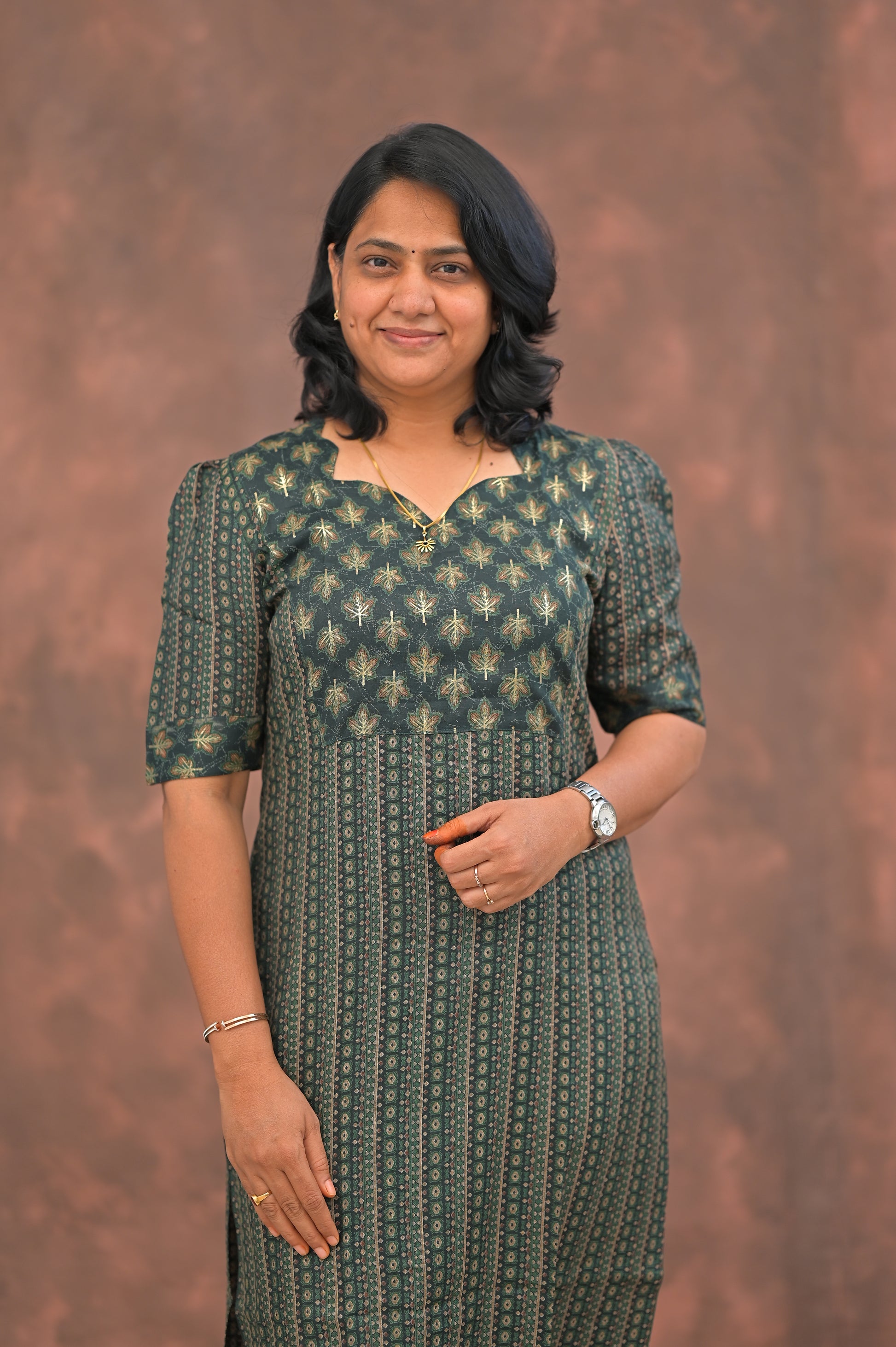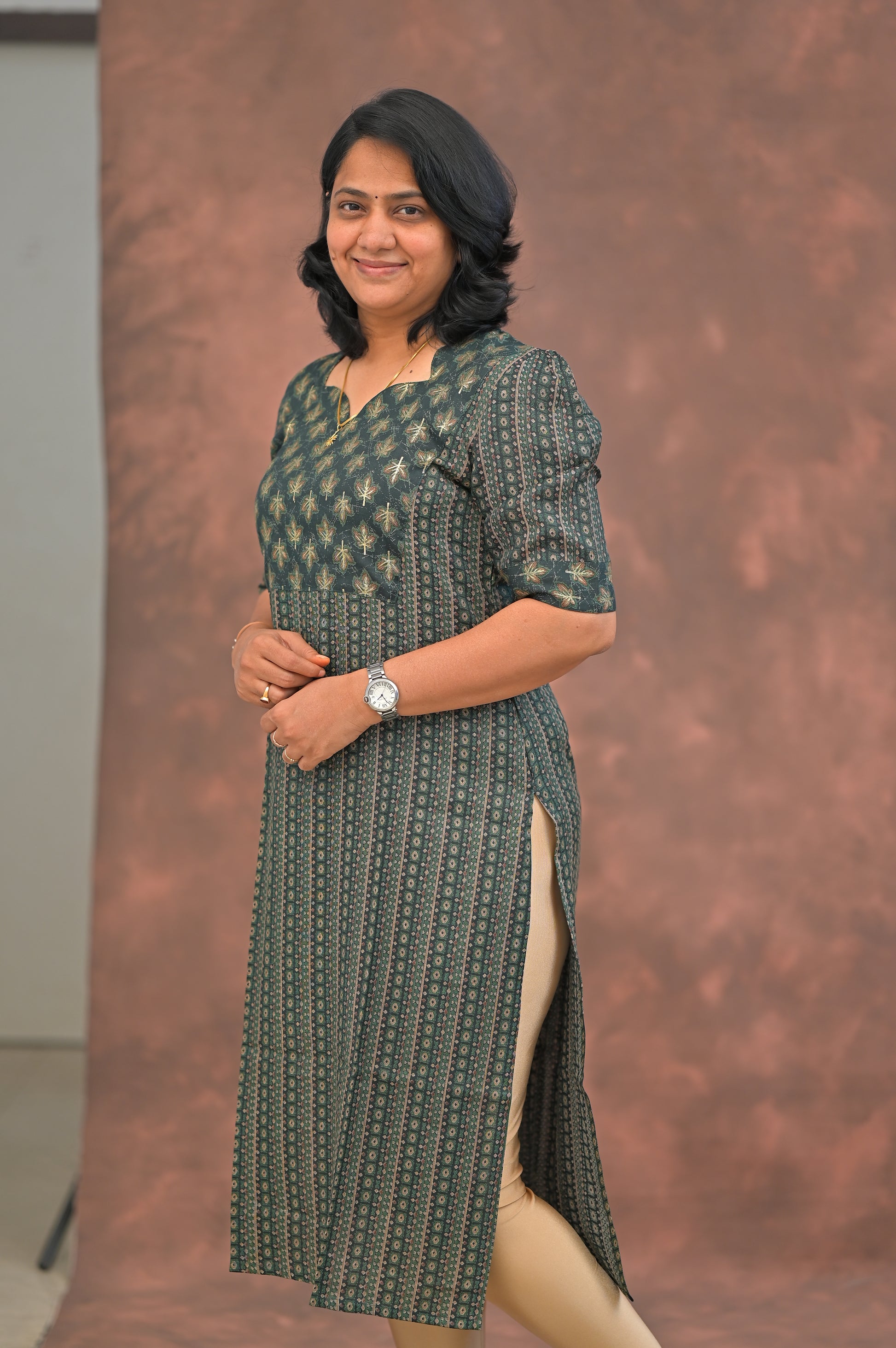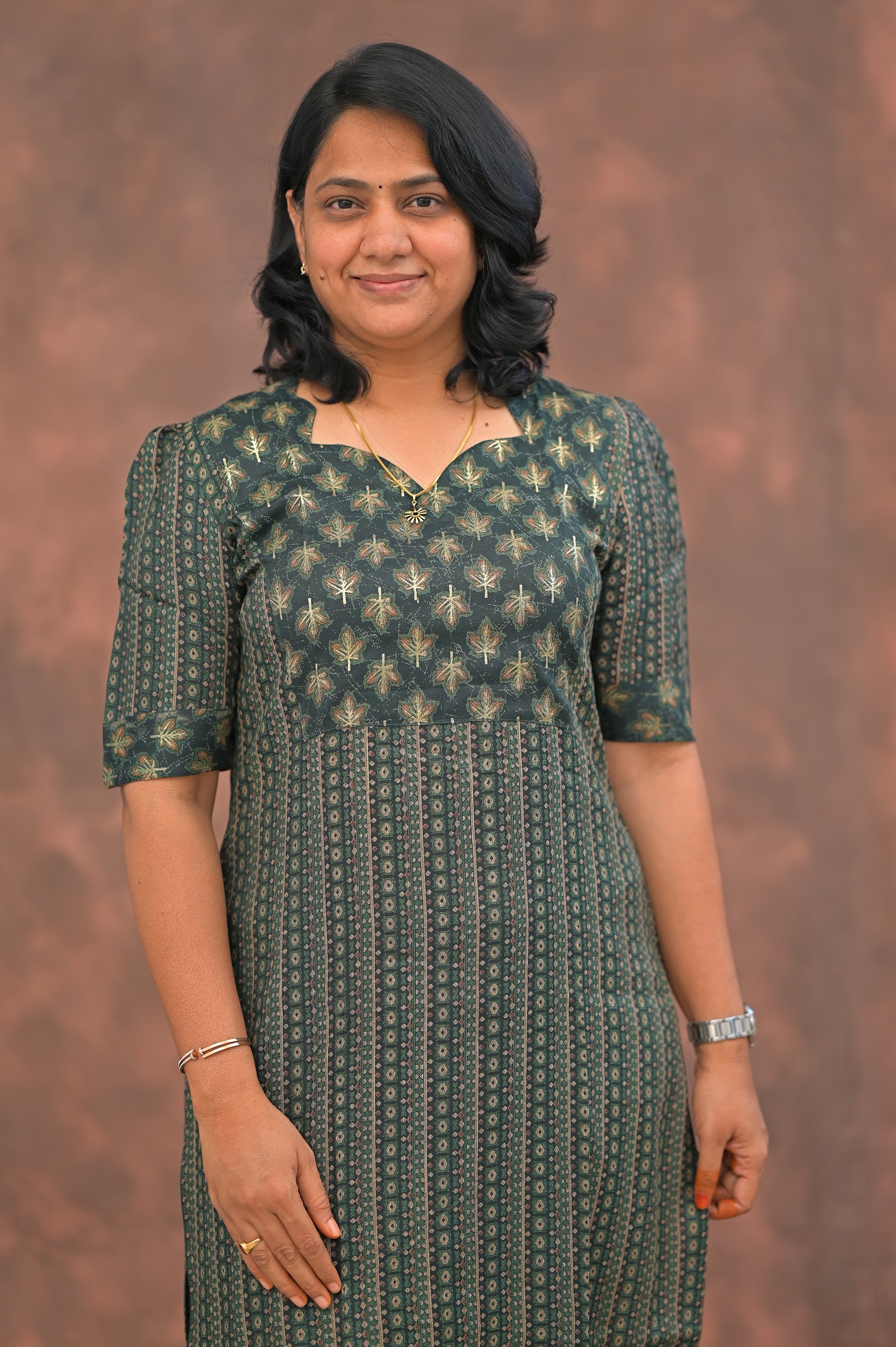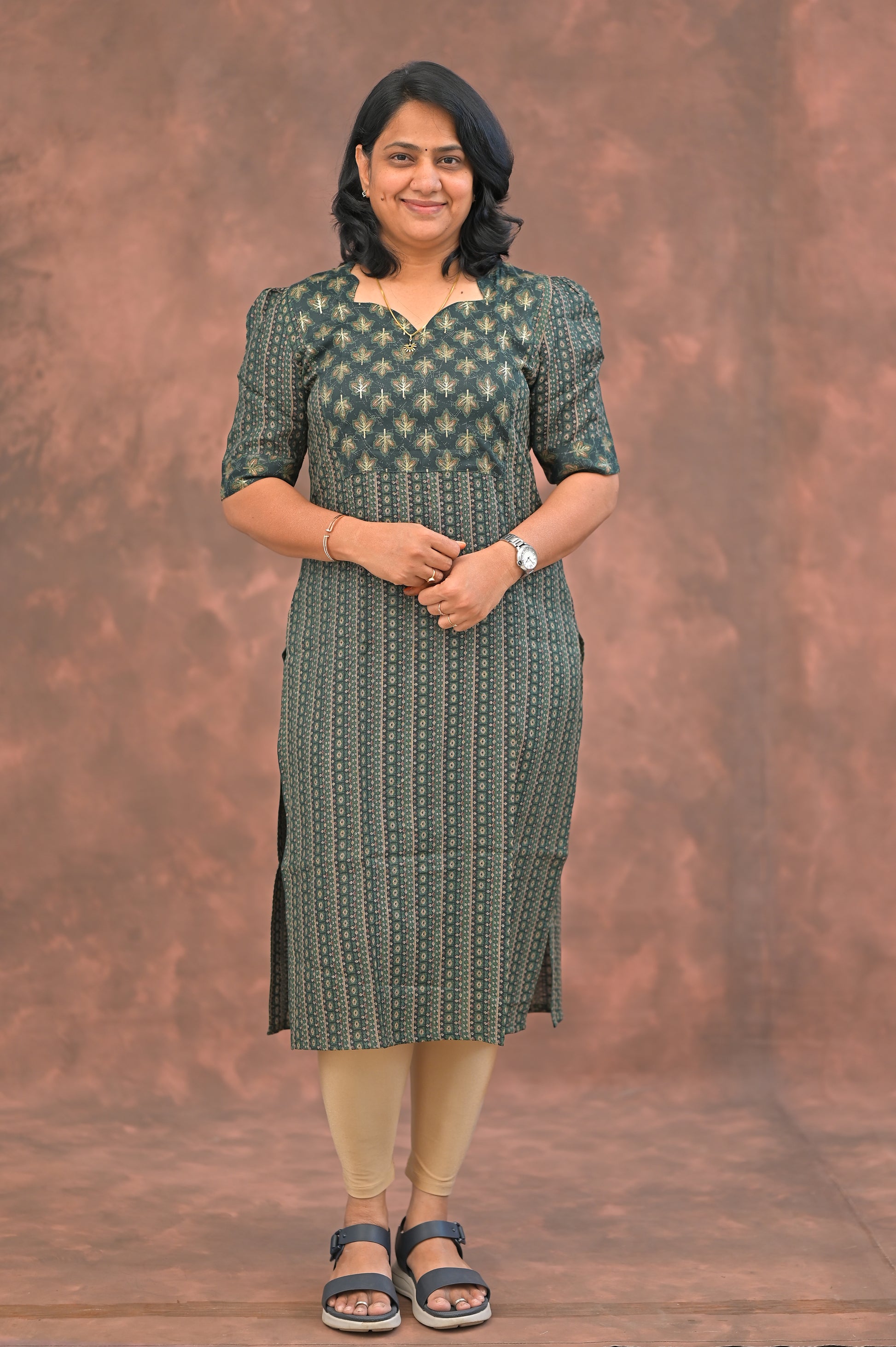 This kurti features an elegant block-printed floral and vertical motif pattern. The top yoke is detailed with striped traditional prints, while the rest of the body carries a repeating floral buti design, giving it a classic ethnic flair.