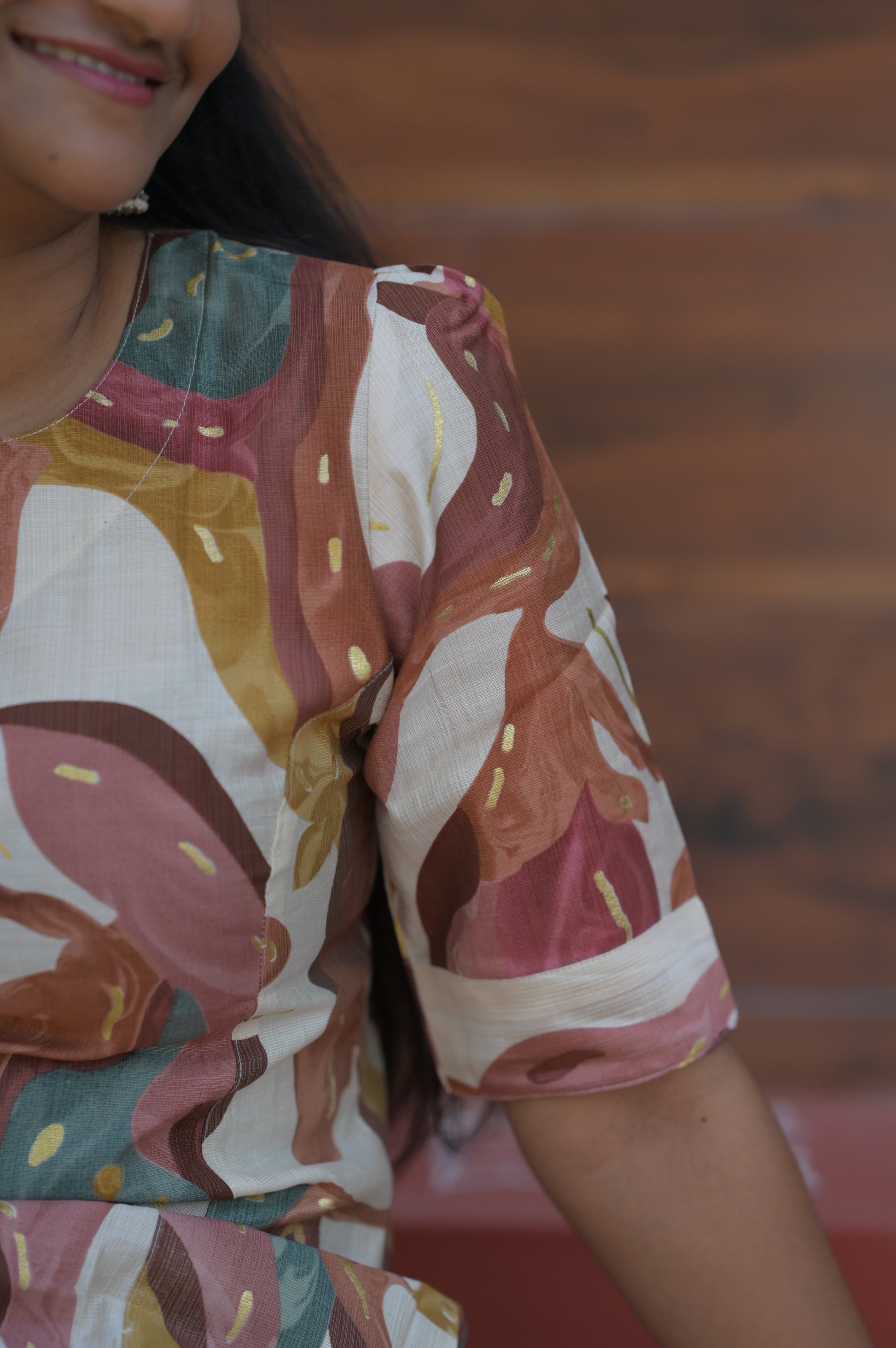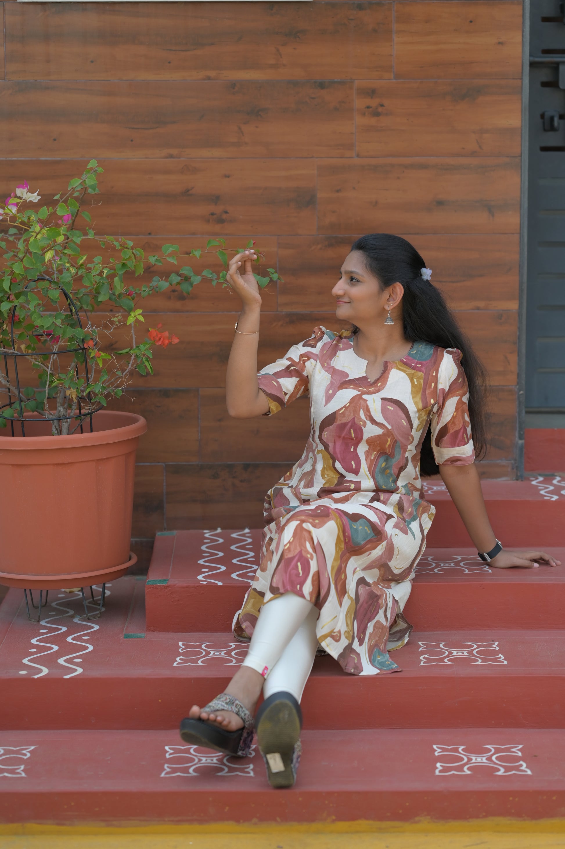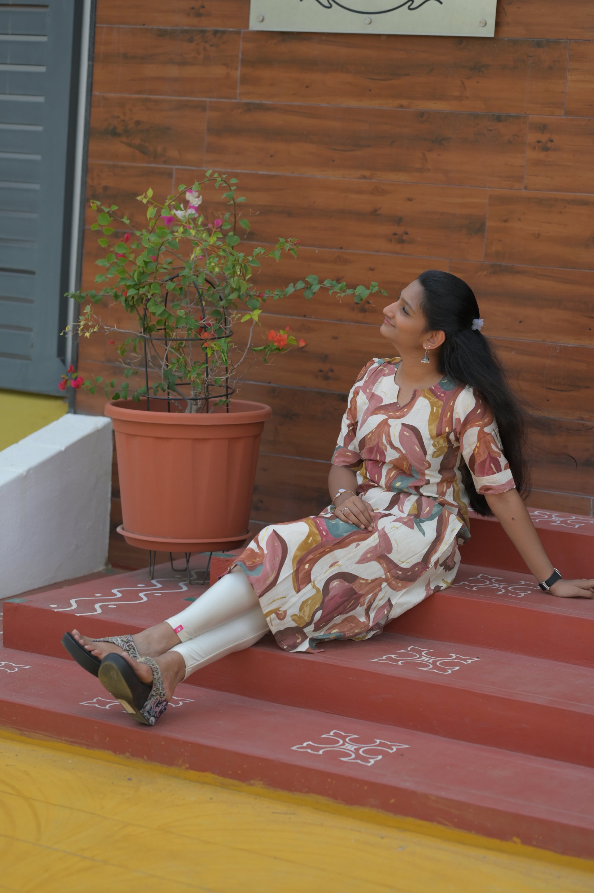 Delicate floral print patterns adorn the body, enhanced by thread embroidery around the yoke. Side slits and minimal wooden button accents add a touch of elegance, making it perfect for both casual outings and festive get-togethers.