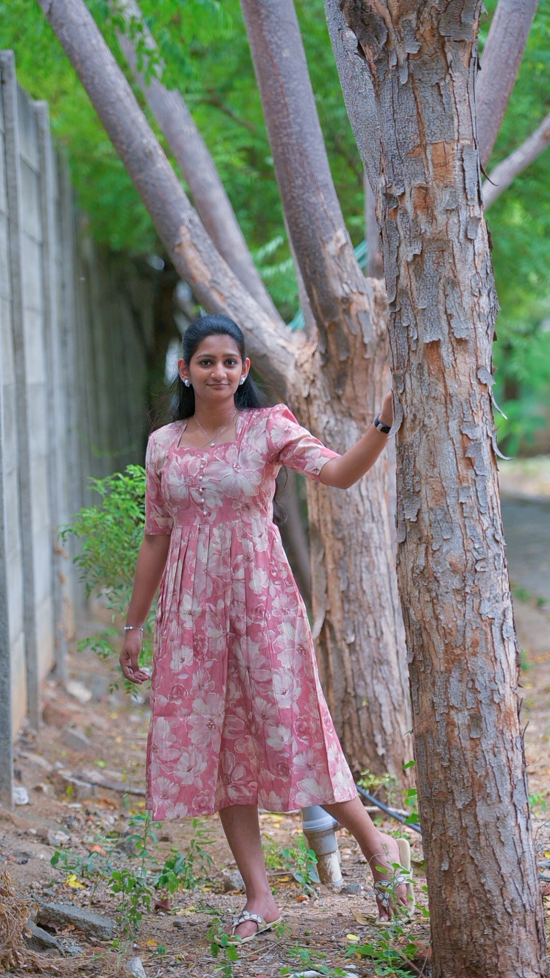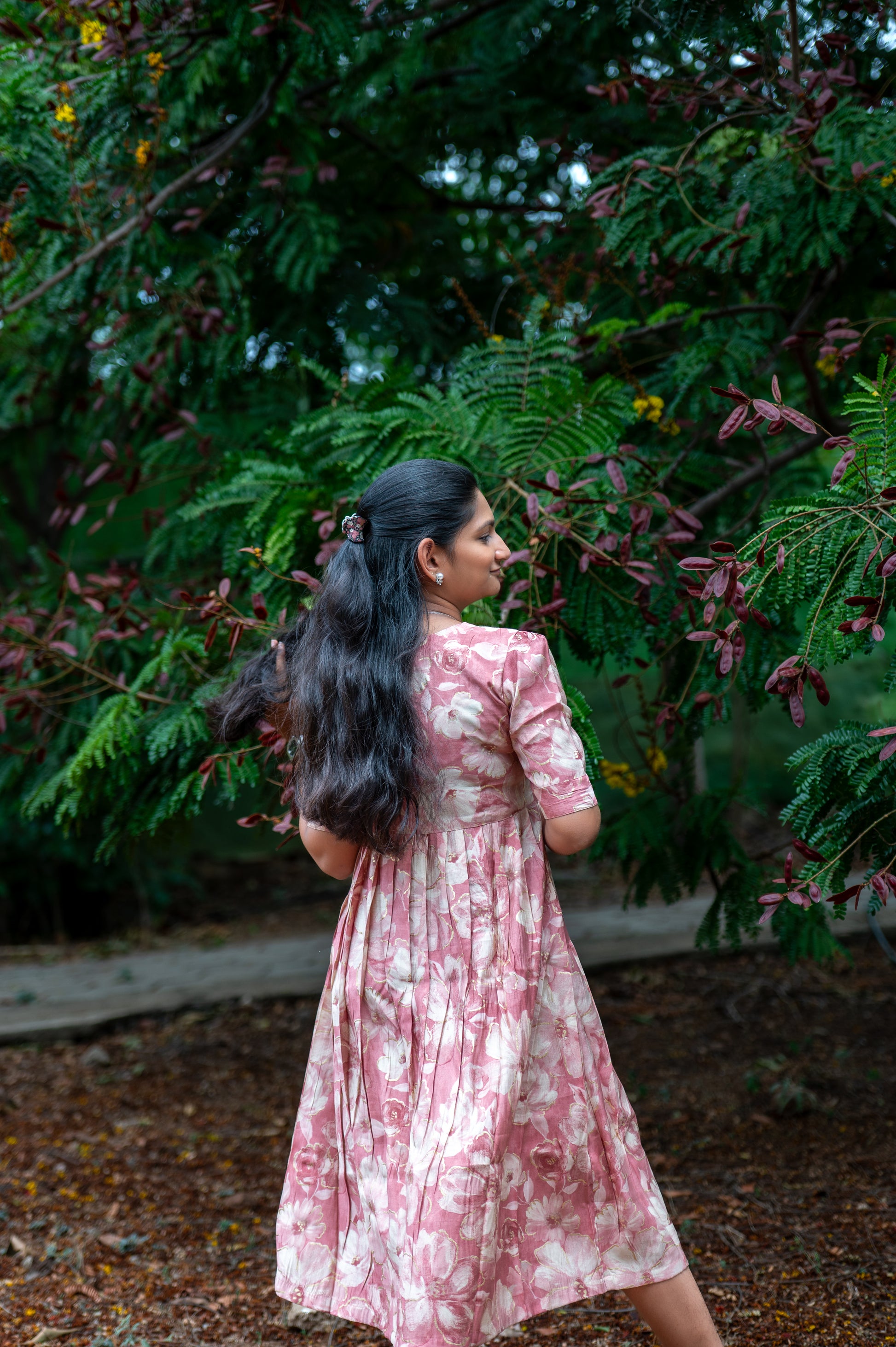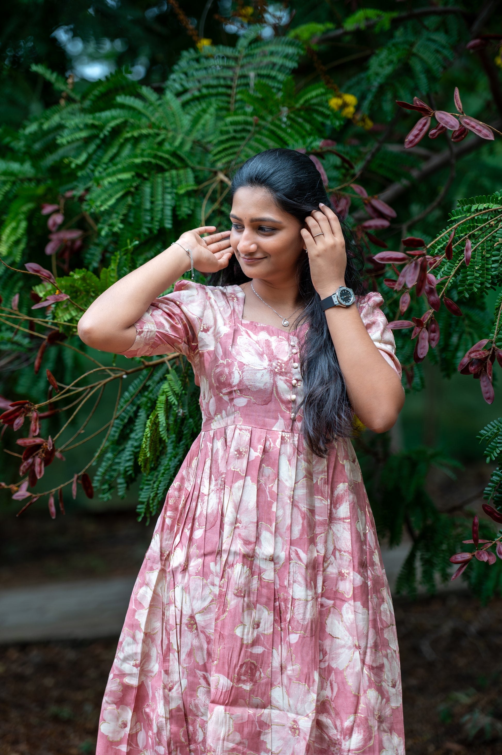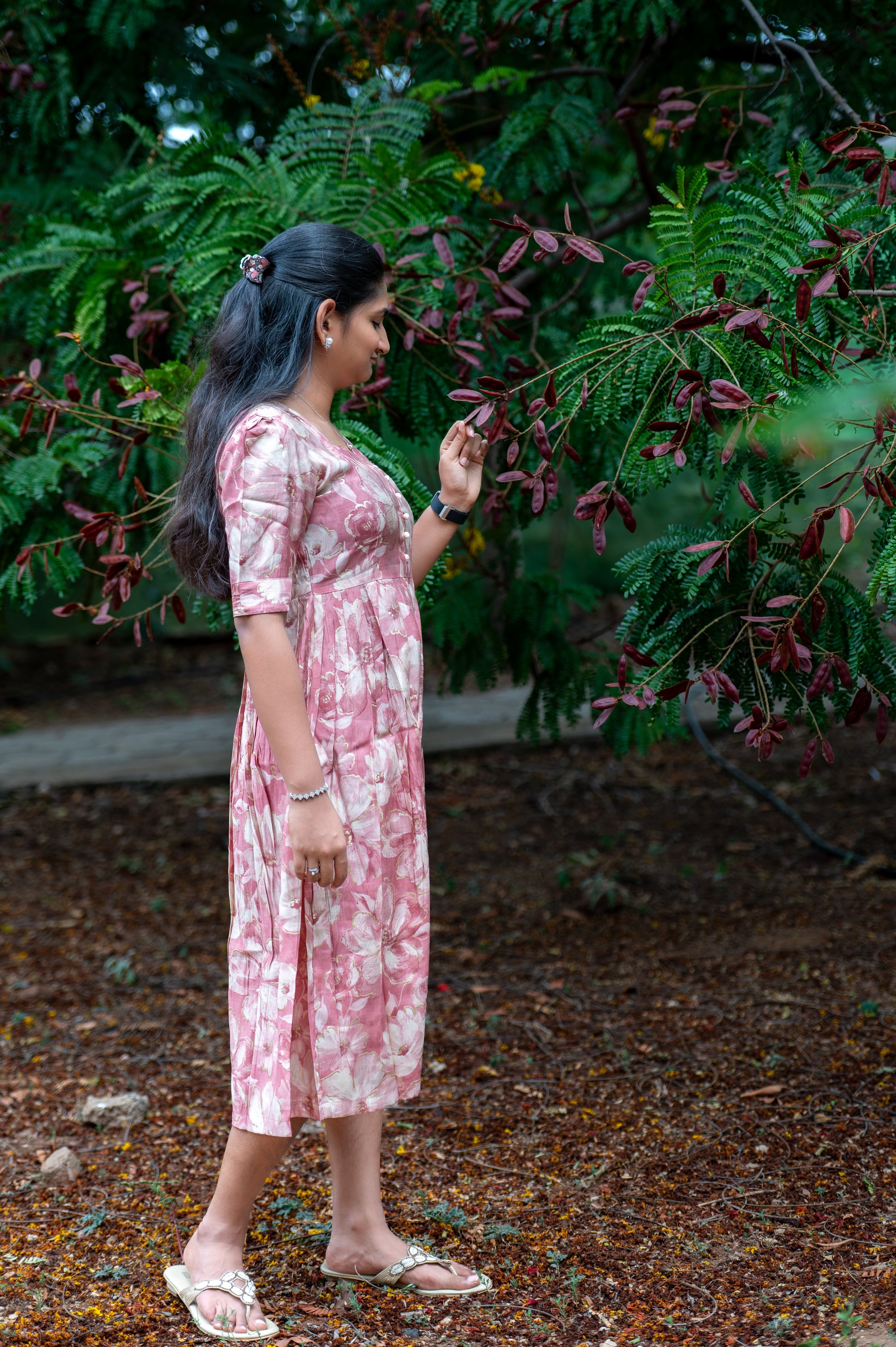 Grace meets vintage charm in the Dusky Rosewood kurti, adorned with delicate ivory floral patterns blooming over a soft, dusty rose base and gathered pleats below the bust add a romantic, old-world elegance. Ideal for intimate occasions or serene evening strolls, this kurti exudes timeless beauty with a gentle, feminine grace.