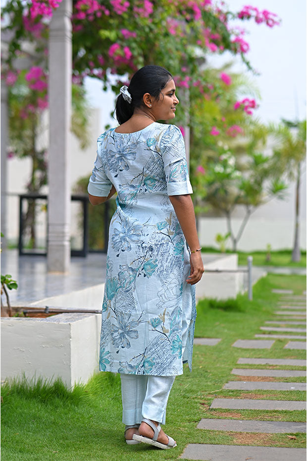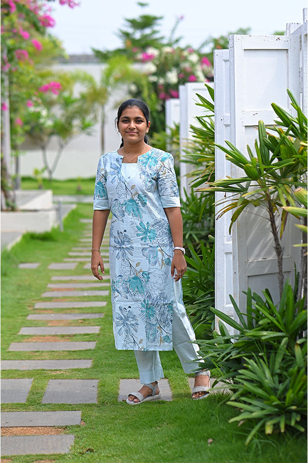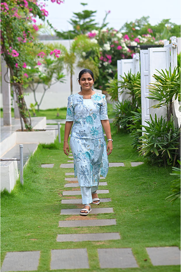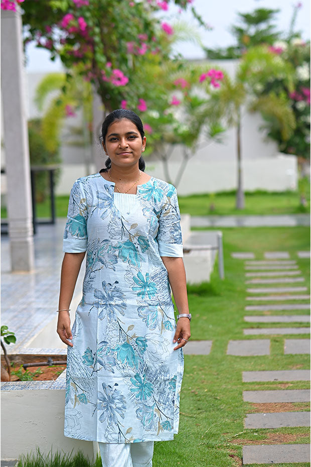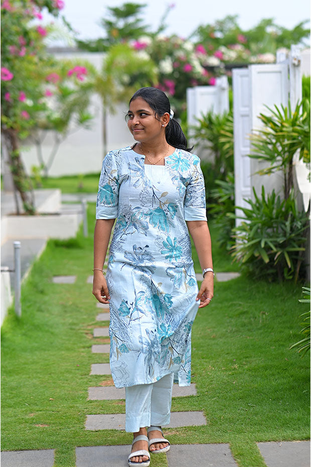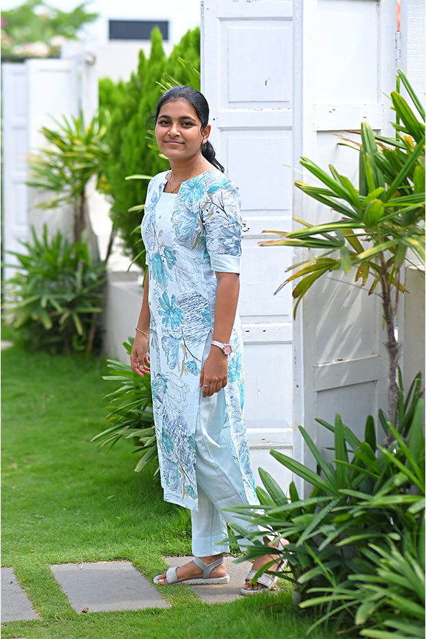 A canvas of calm — the ‘Tranquil Bloomscape’ kurti layers floral patterns over muted tones for serene sophistication.