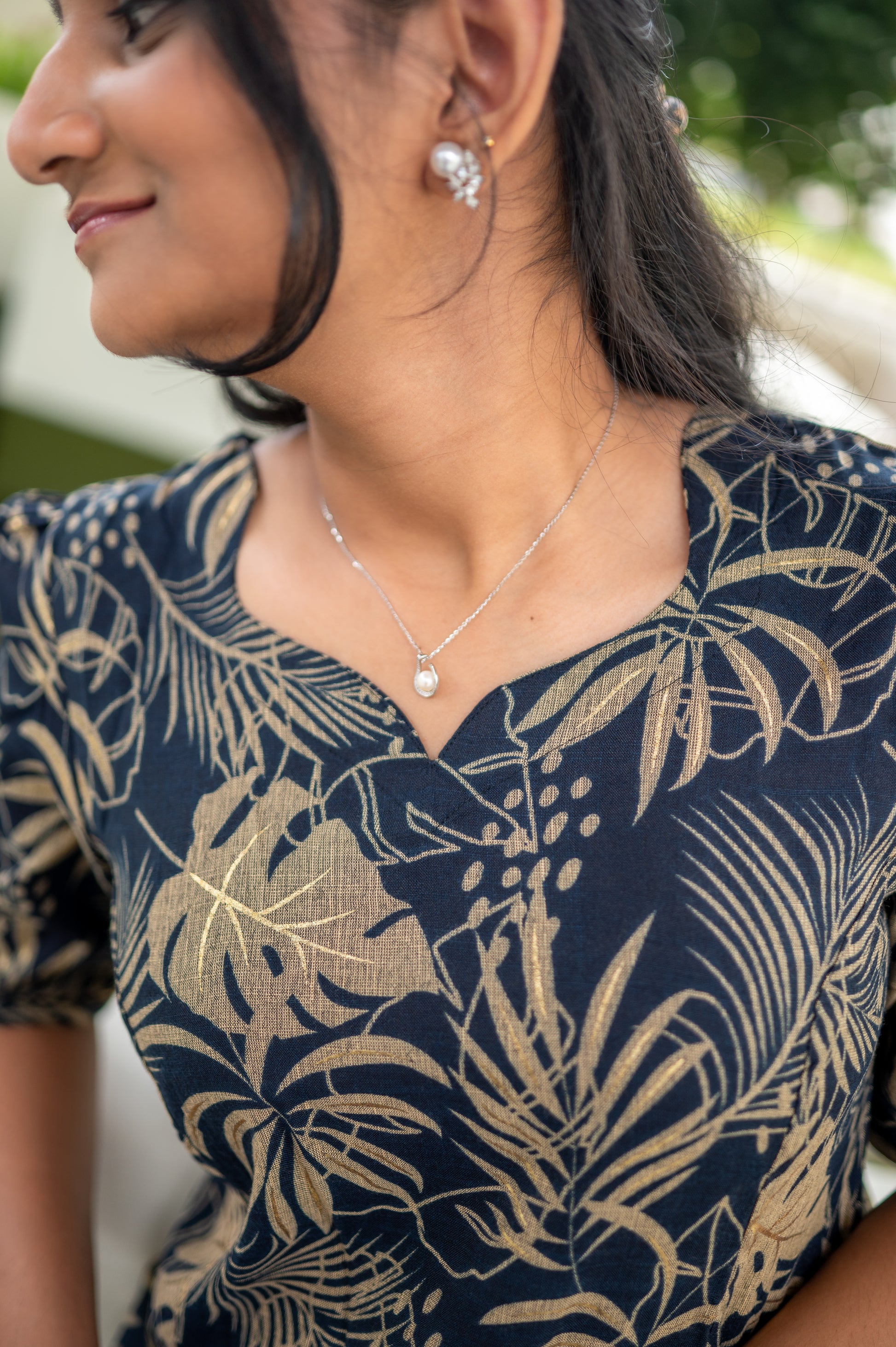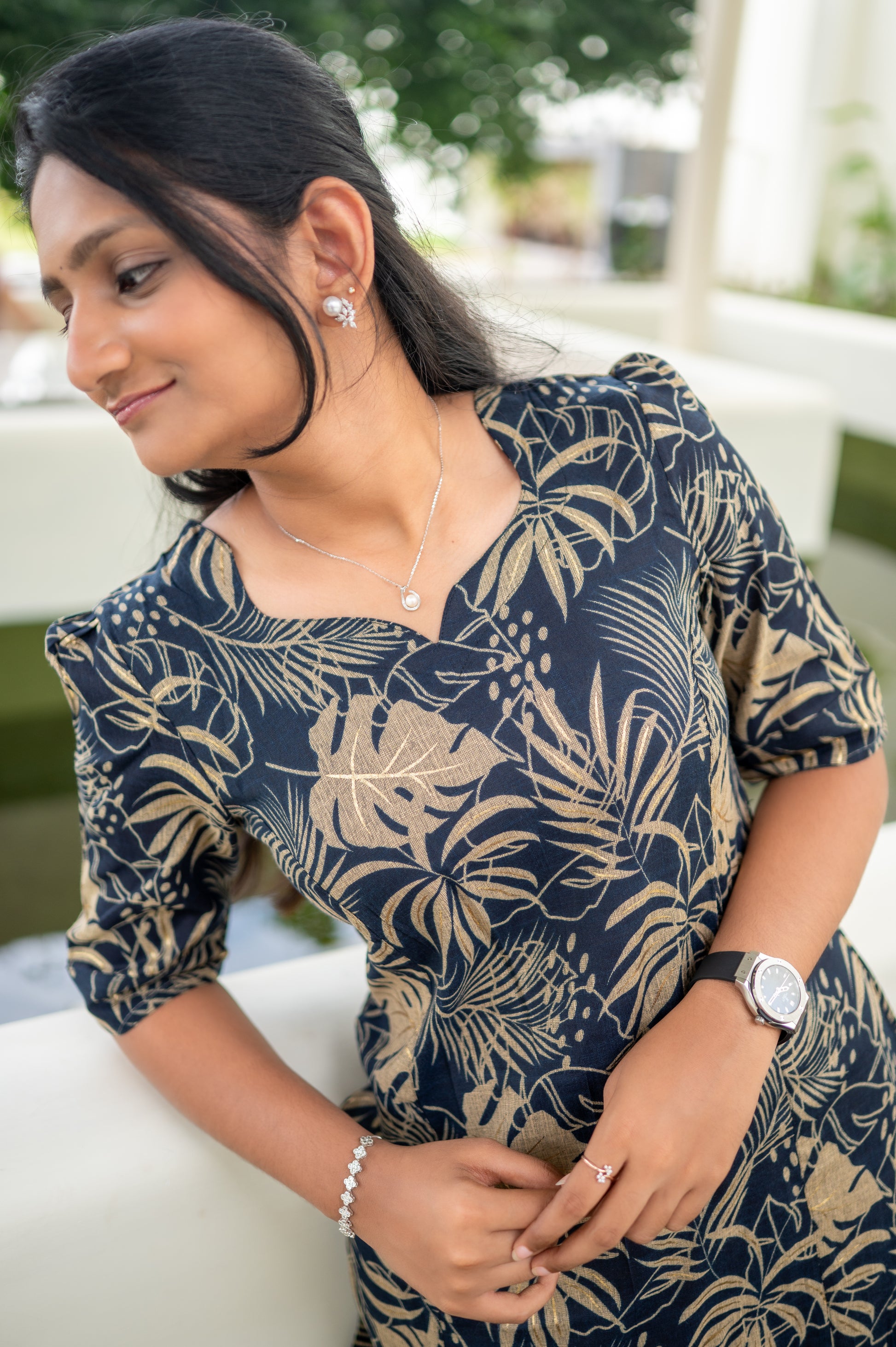 A-line silhouette with a stylish V-neckline, elbow sleeves, and all-over tropical leaf motifs. The design balances modern elegance with ethnic charm.