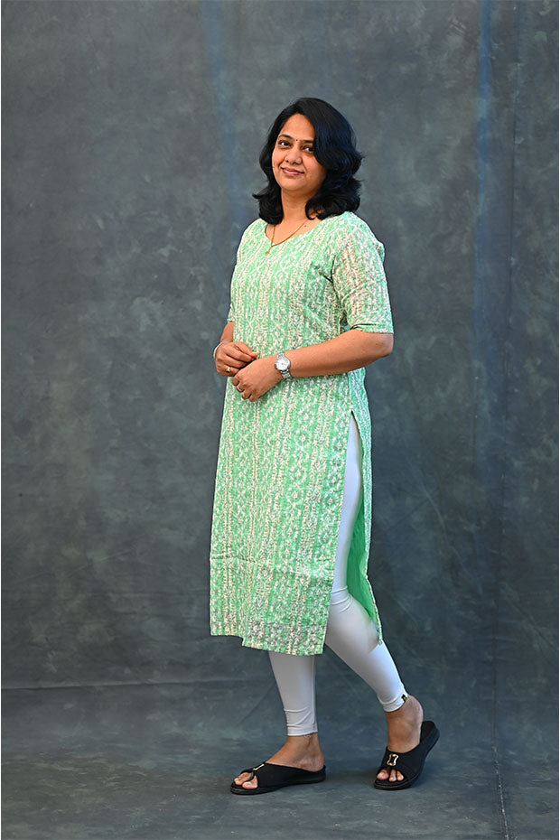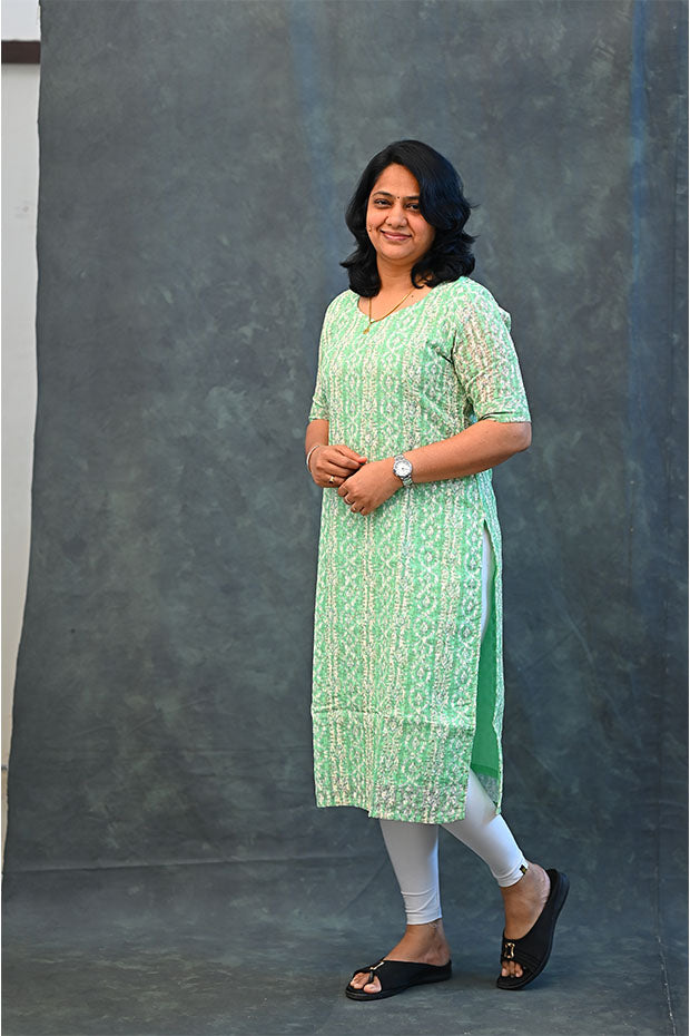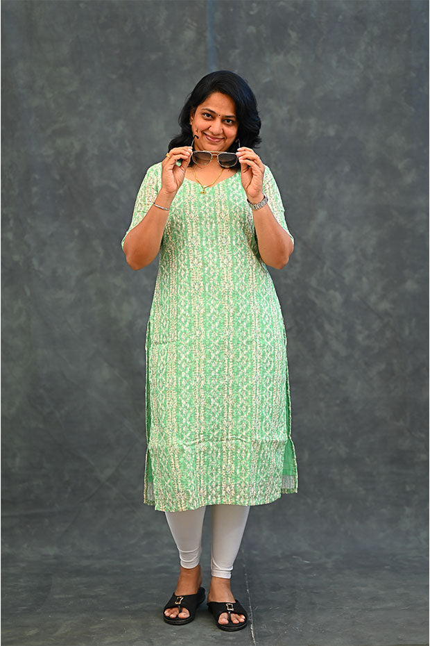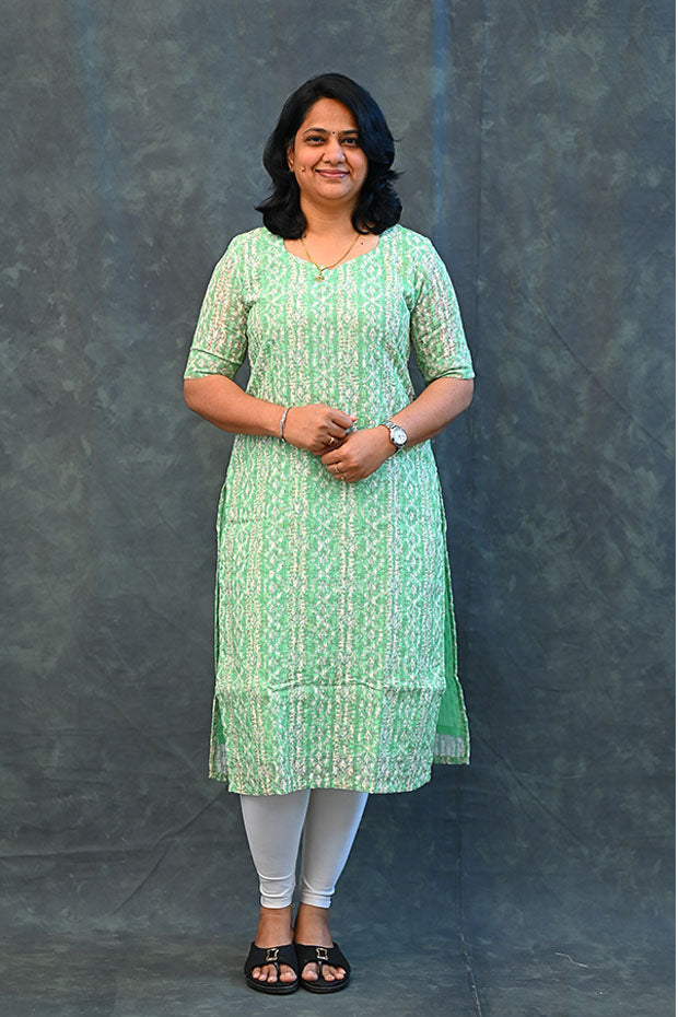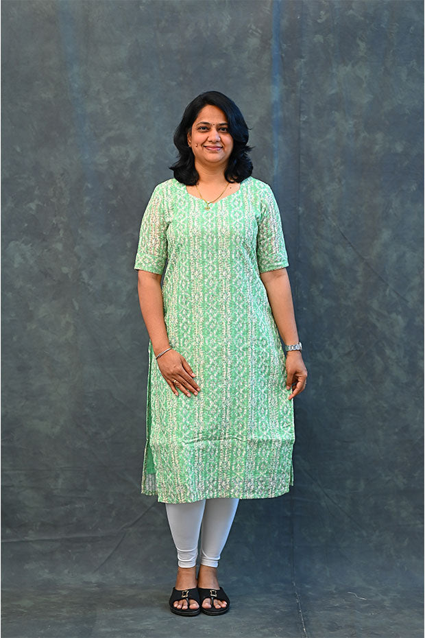 Fresh and refined, the ‘Pista Prism’ kurti blends pastel green hues with soft patterns for a crisp, contemporary look.