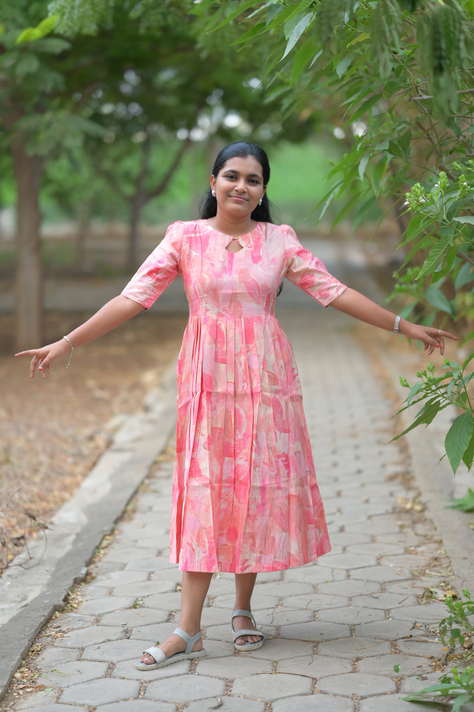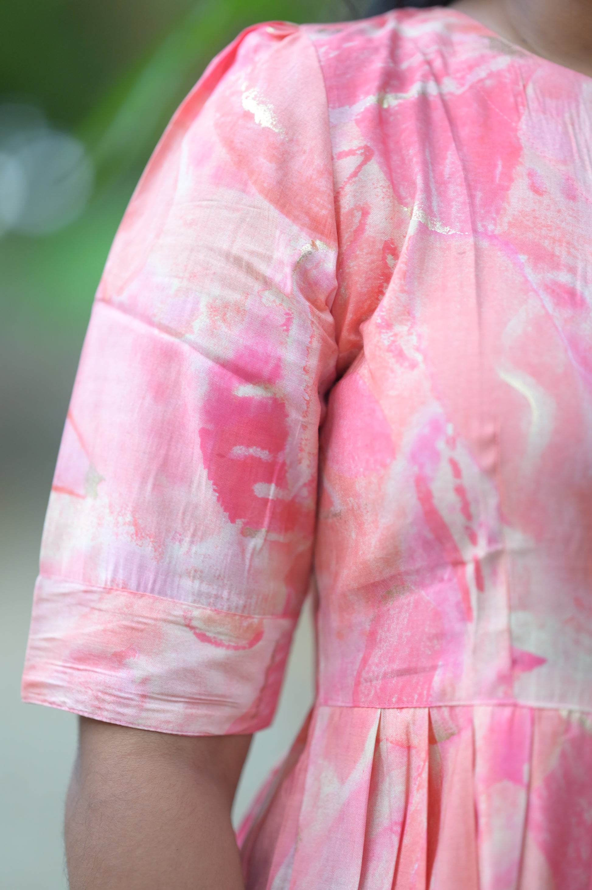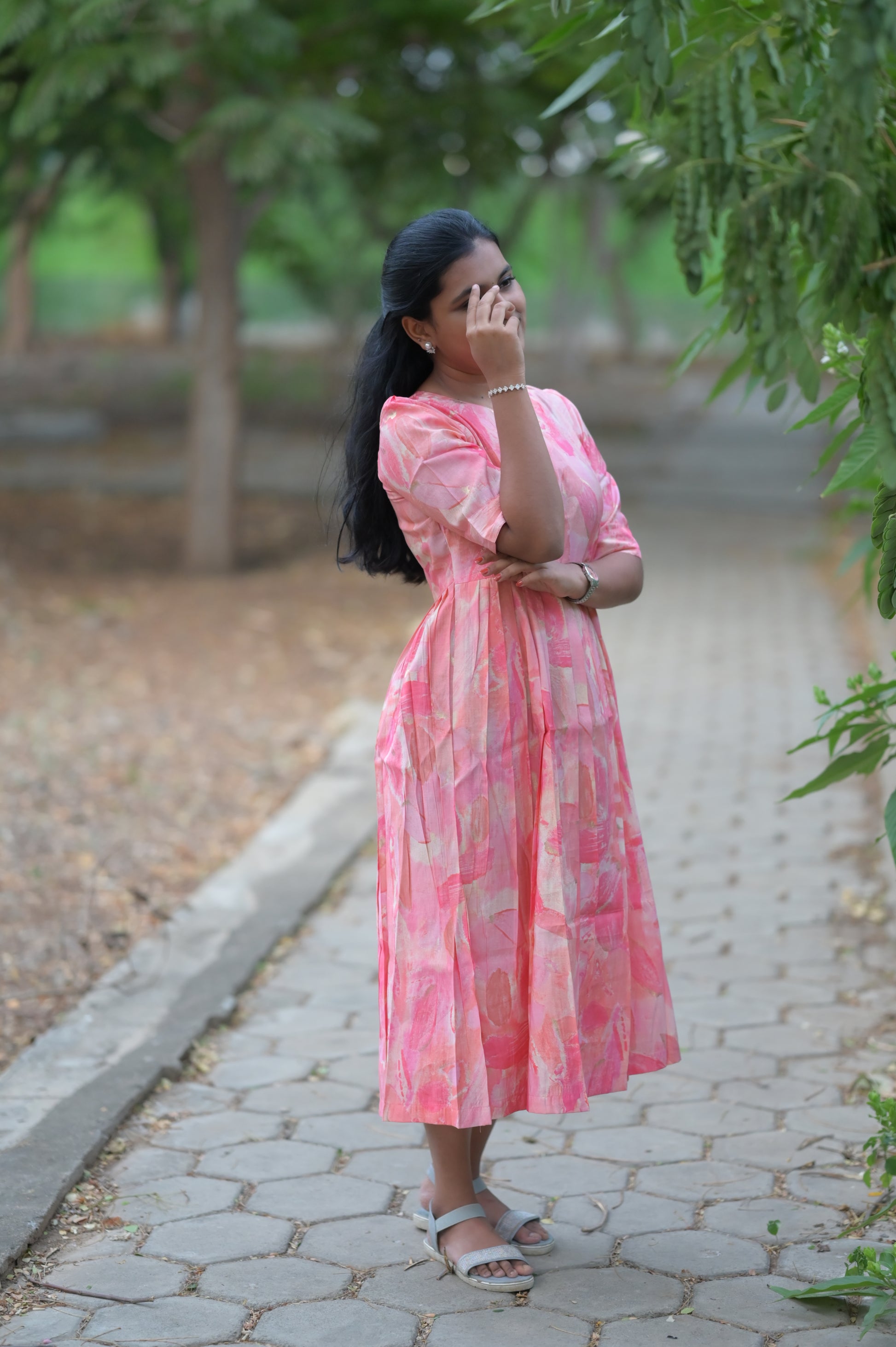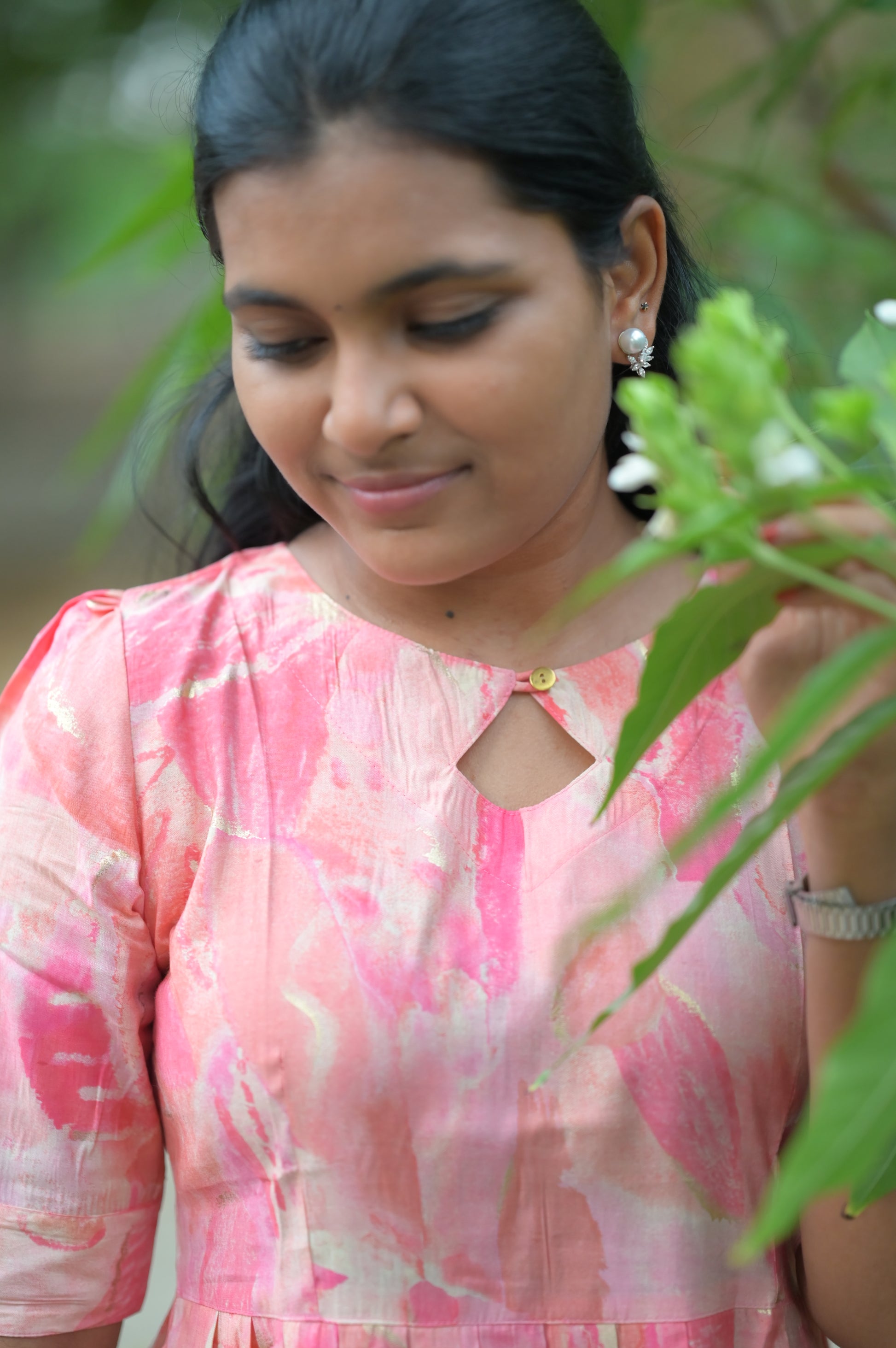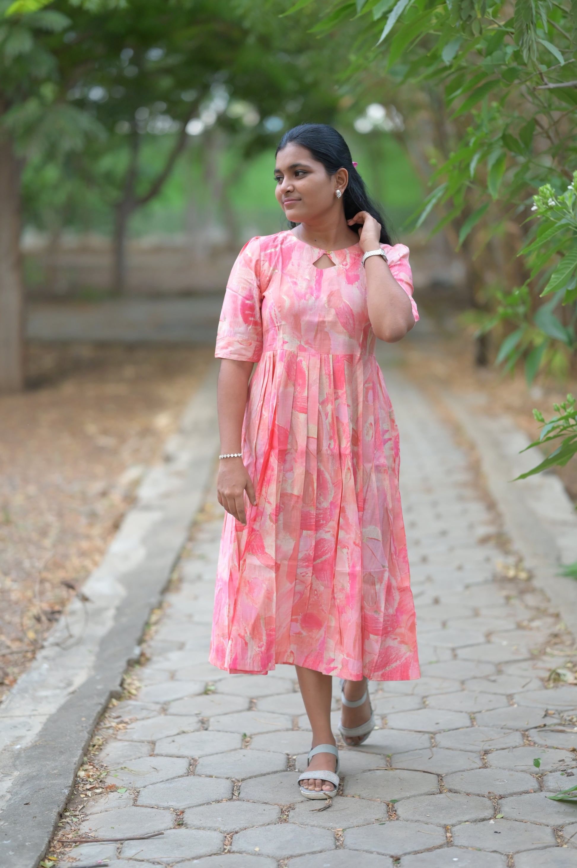 The Blush Breeze Kurti is a soft and feminine fit-and-flare design that exudes effortless charm. Crafted from lightweight, breathable fabric, it features an abstract floral print in graceful shades of blush pink, coral, and hints of beige, creating a dreamy watercolor effect.