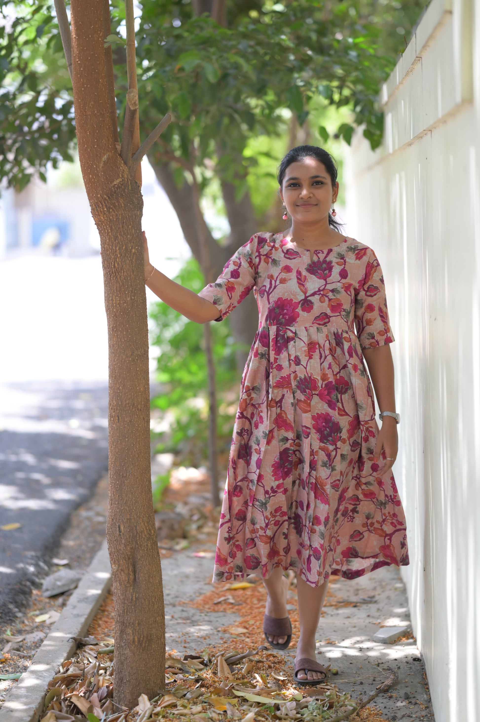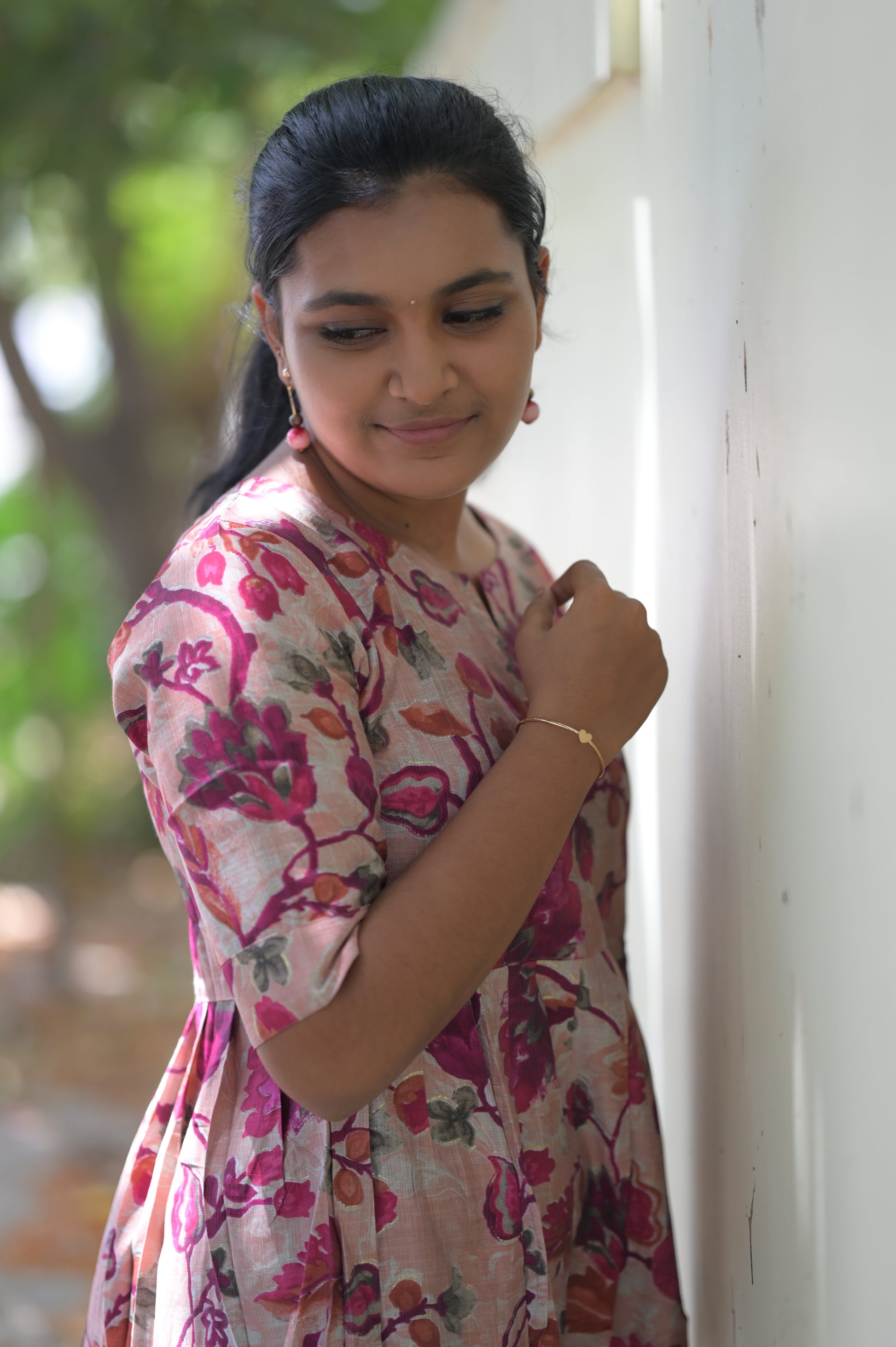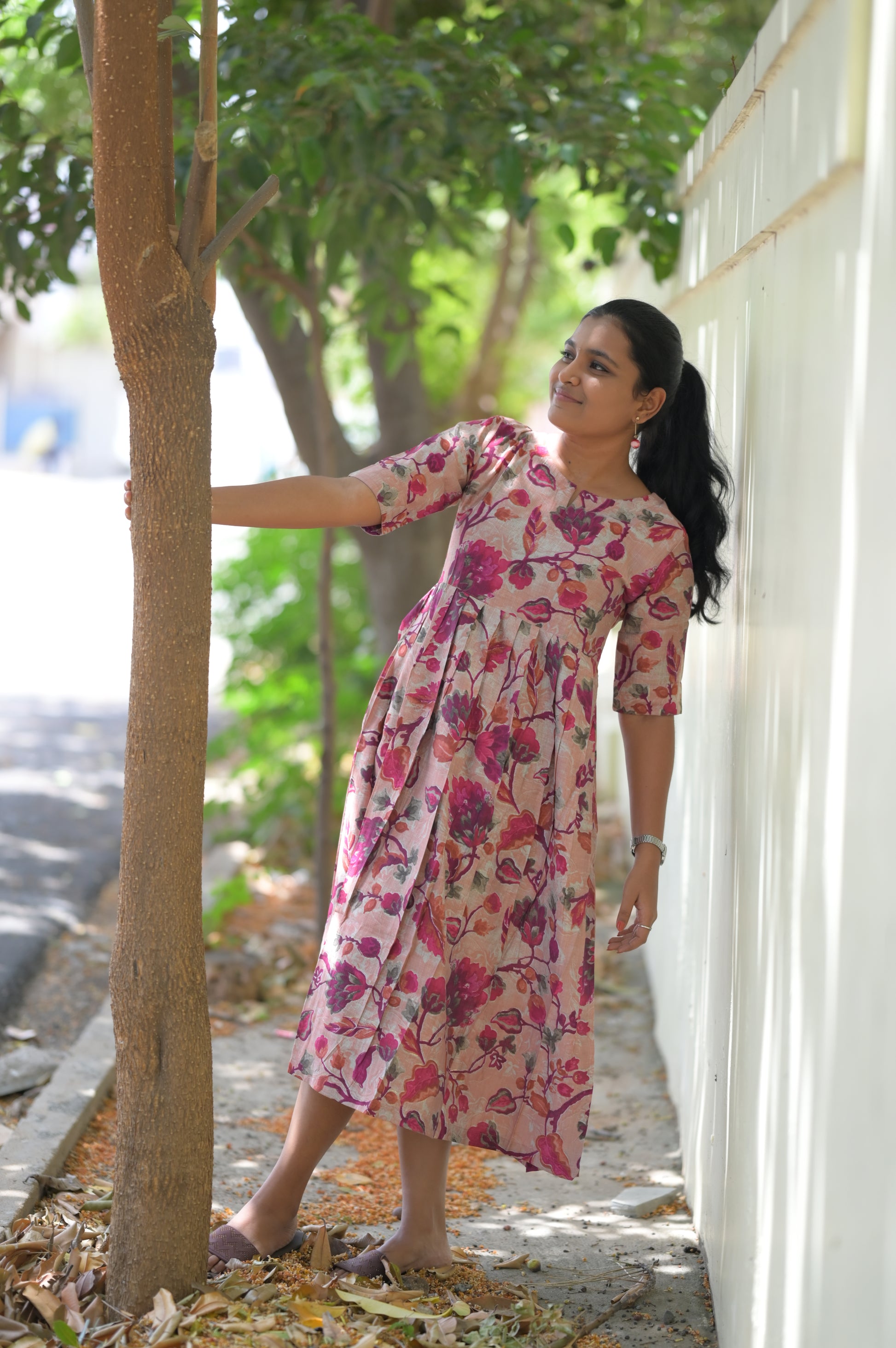 The kurti is adorned with a bold floral print in vibrant shades of rose pink, maroon, and muted green over a pastel peach base, giving it a rich and romantic aesthetic. The sweetheart neckline and half sleeves add a delicate feminine charm, making it ideal for brunches, daytime events, or casual festive occasions. Crafted from lightweight fabric, the kurti ensures all-day comfort while exuding timeless elegance.