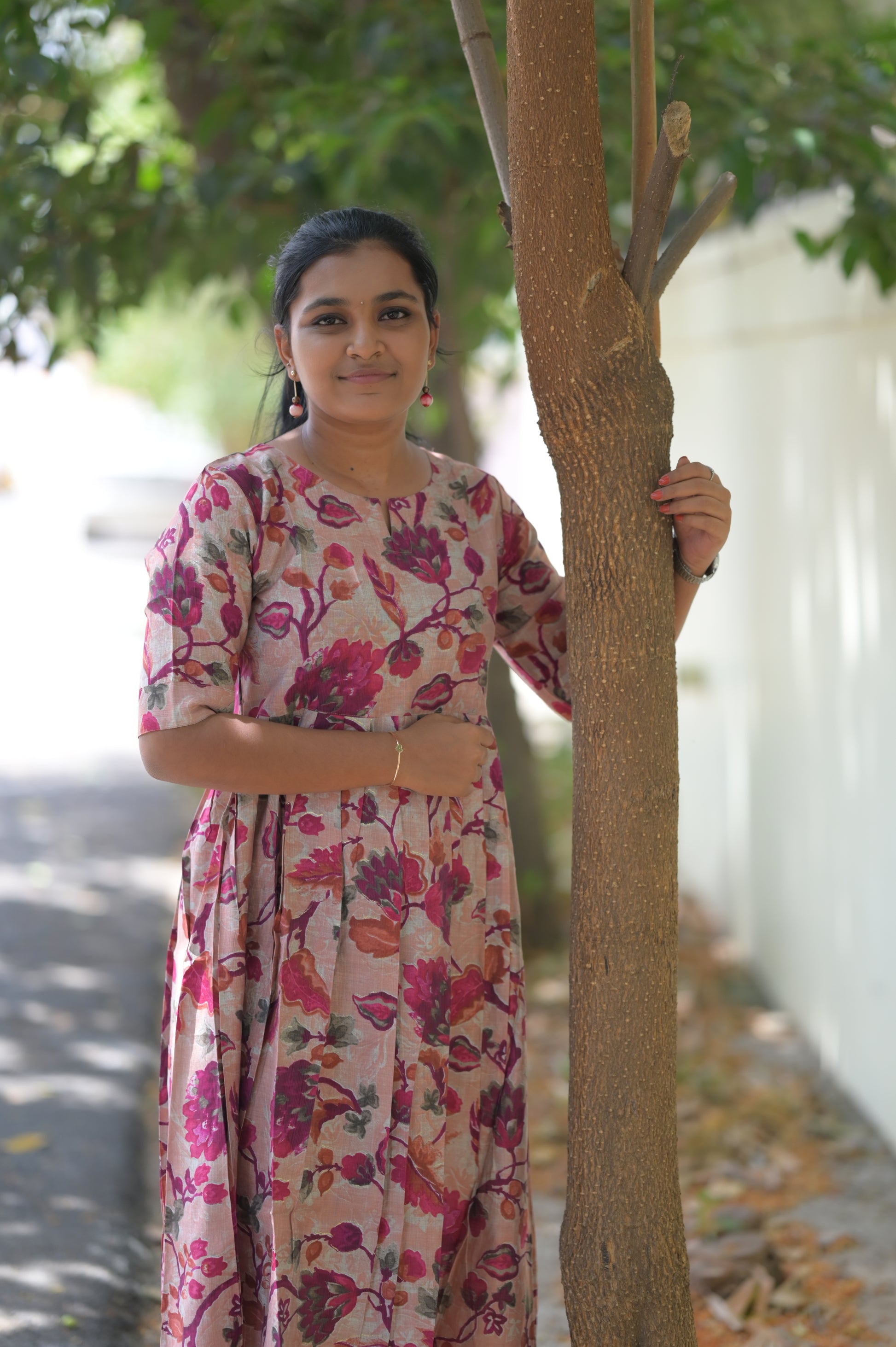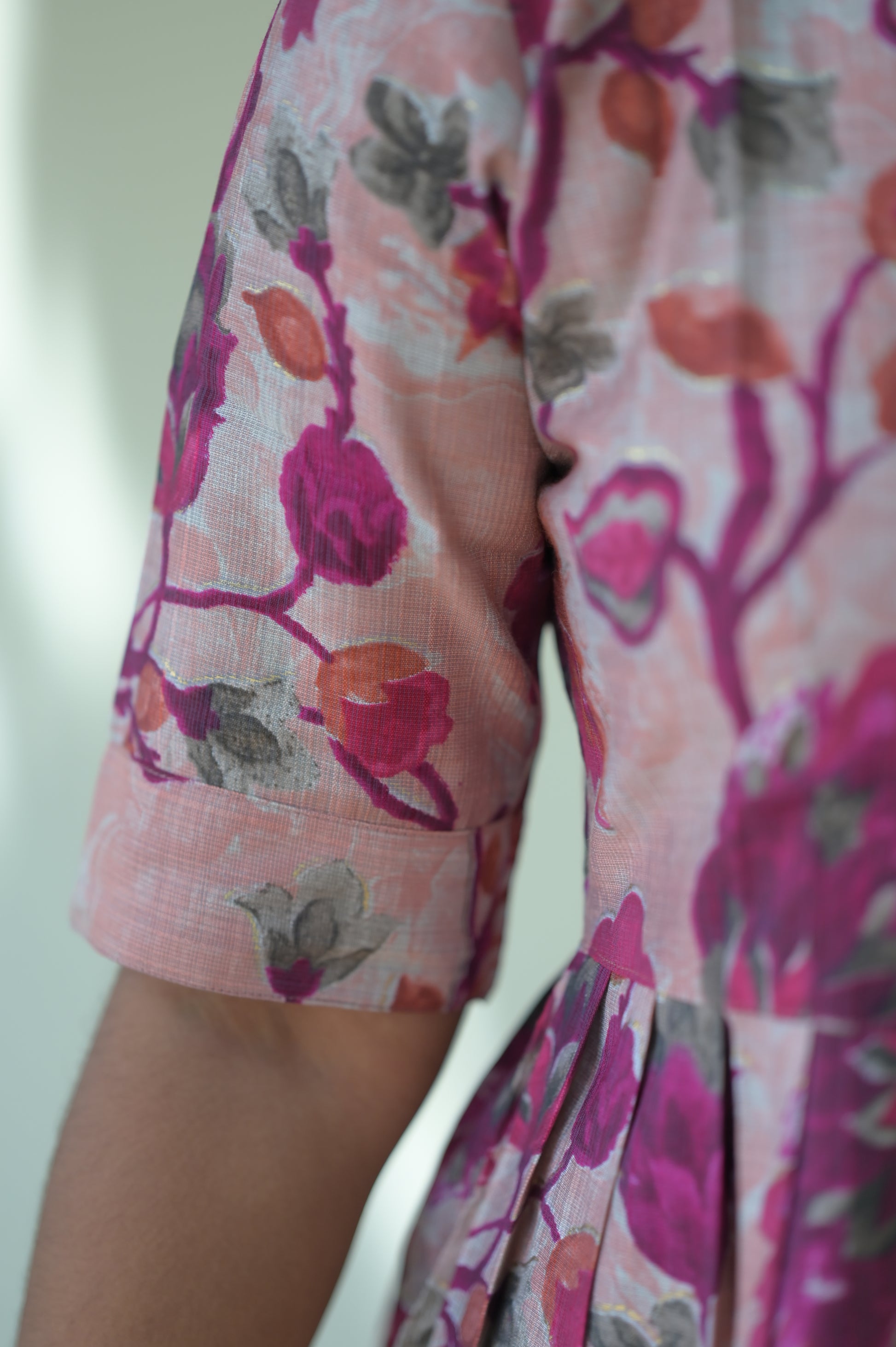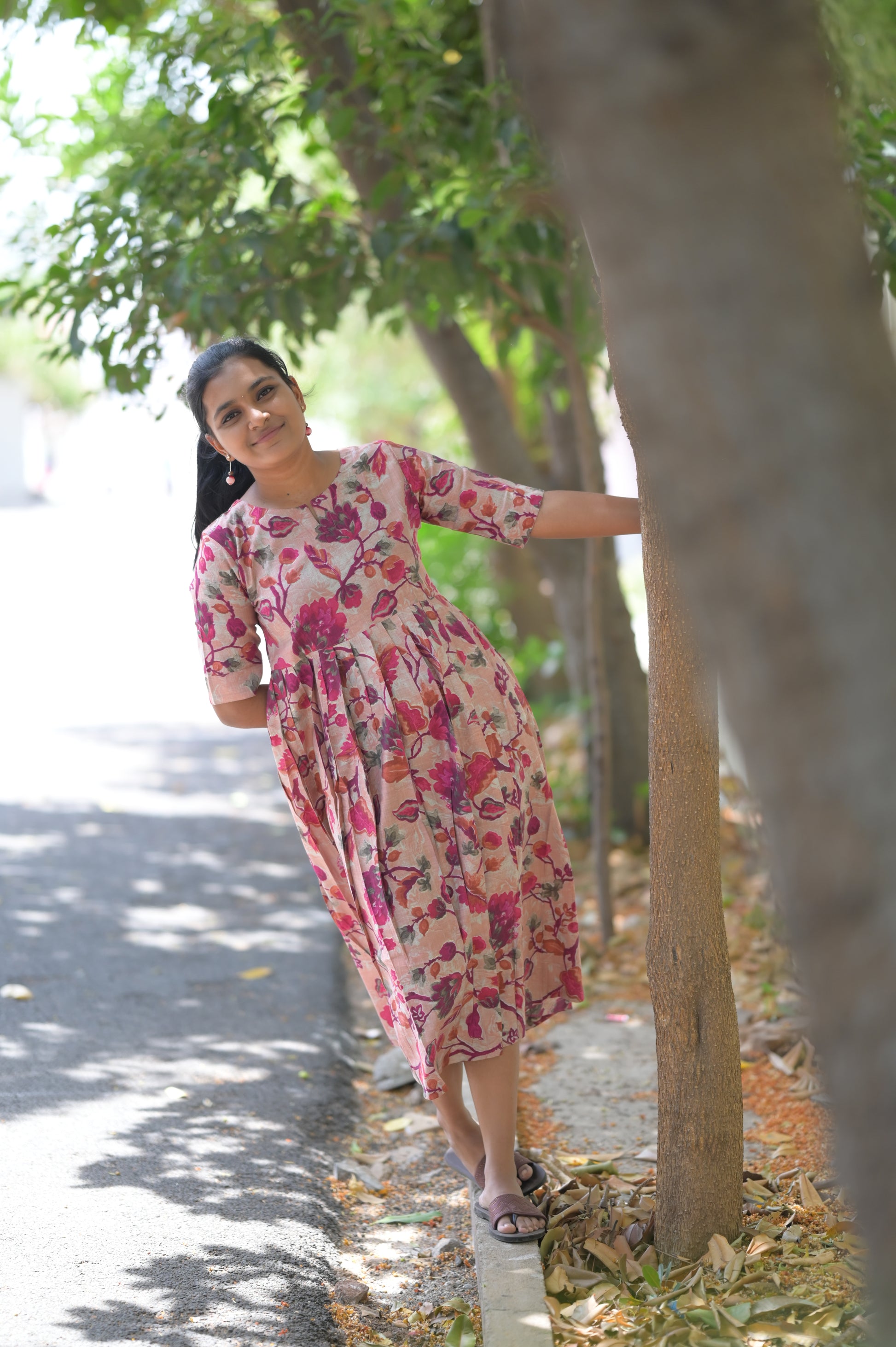 The kurti is adorned with a bold floral print in vibrant shades of rose pink, maroon, and muted green over a pastel peach base, giving it a rich and romantic aesthetic. The sweetheart neckline and half sleeves add a delicate feminine charm, making it ideal for brunches, daytime events, or casual festive occasions. Crafted from lightweight fabric, the kurti ensures all-day comfort while exuding timeless elegance.