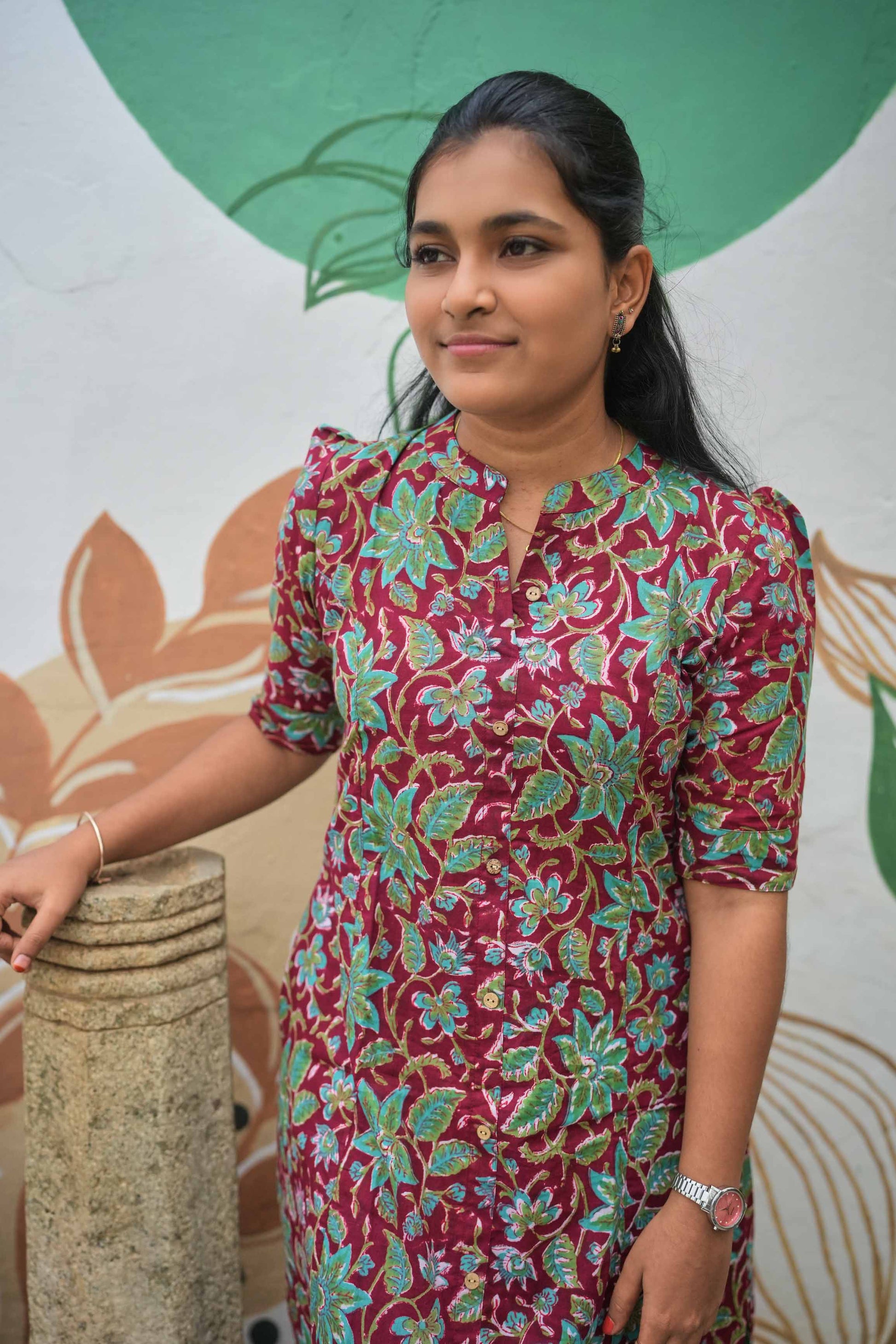 🎨 Colour Palette: Rich maroon base with green, blue, and mustard floral prints for a lively contrast.