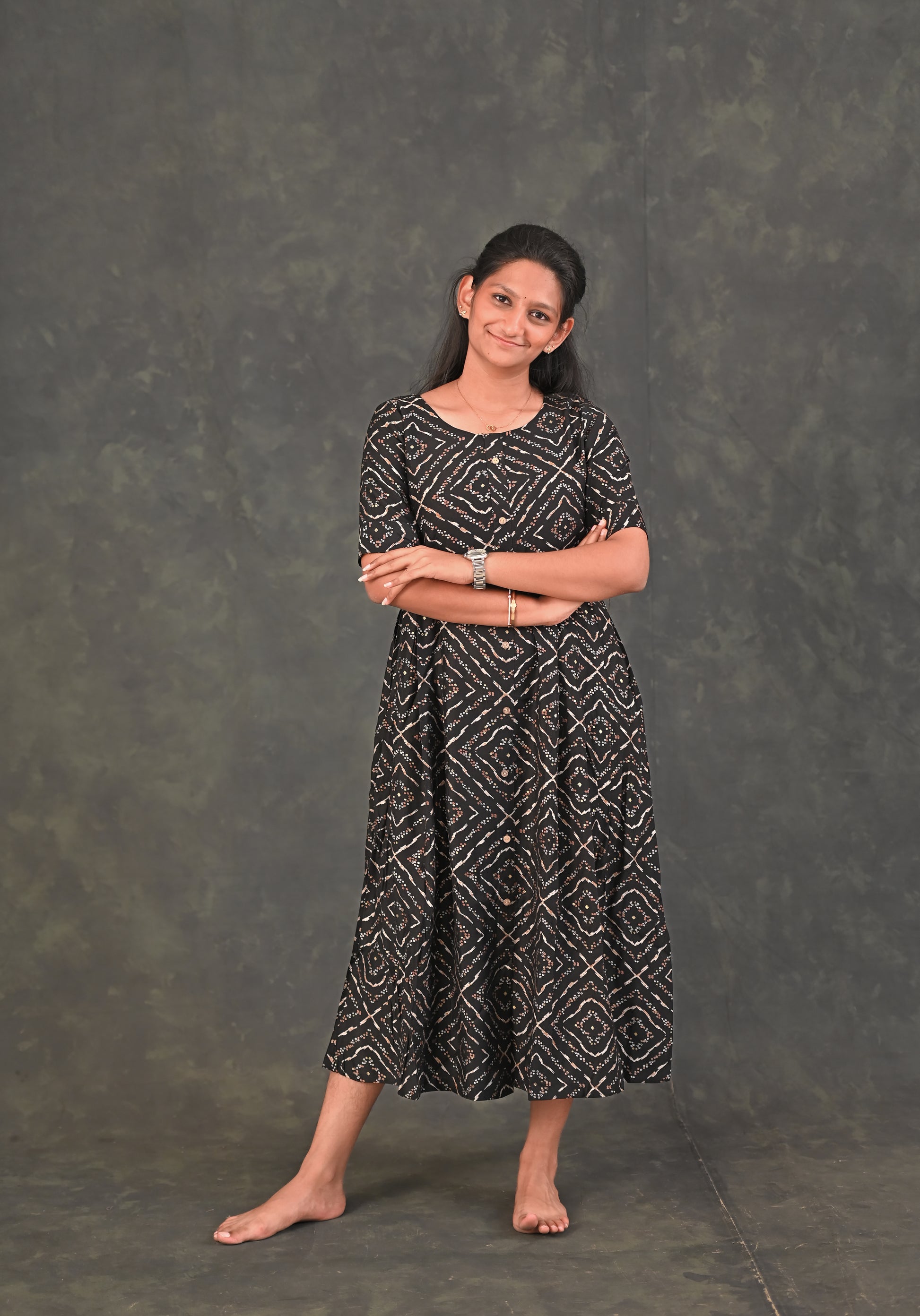 A classic maxi designed with a clean, structured fall and subtle flare. It features an elegant all-over geometric block-inspired print, a round neckline, and short sleeves. The minimalist design makes it versatile for daily wear, office use, or casual gatherings.