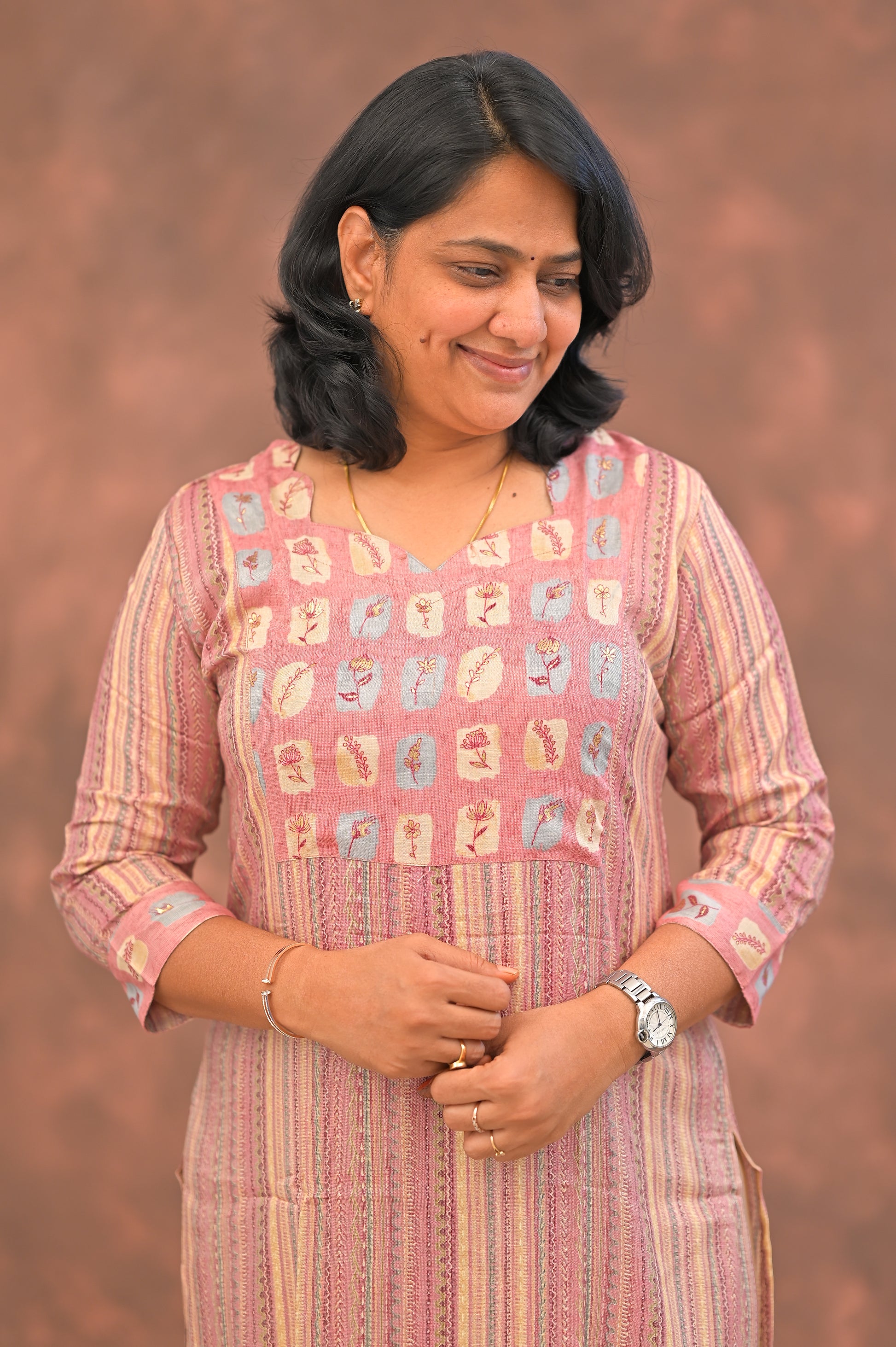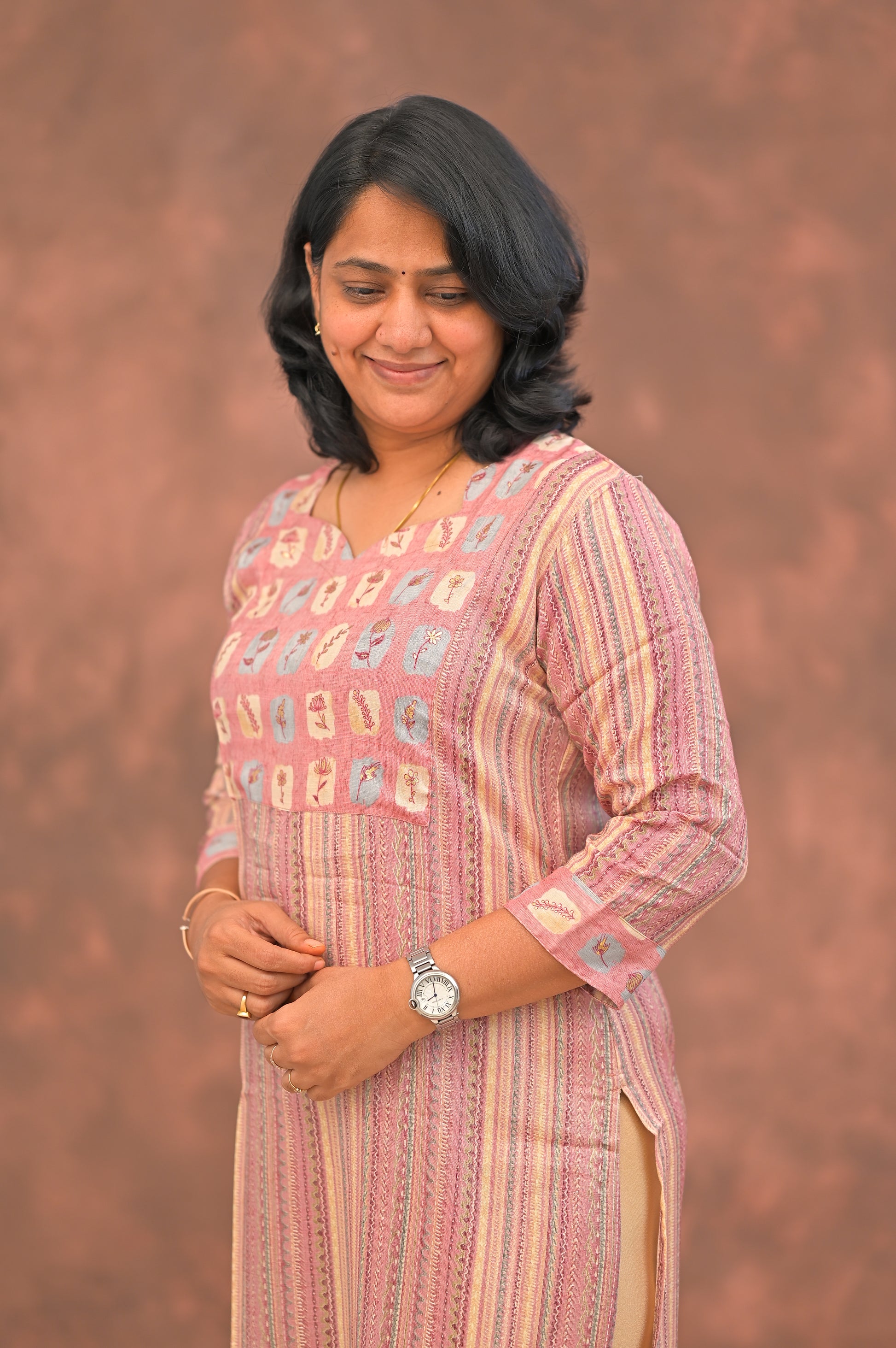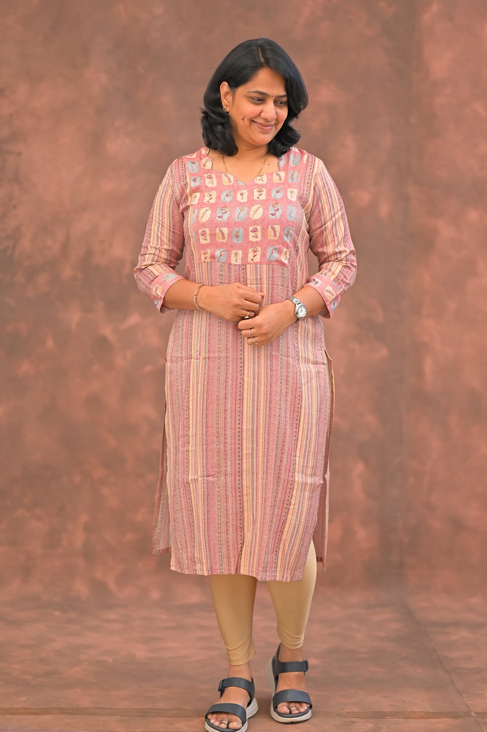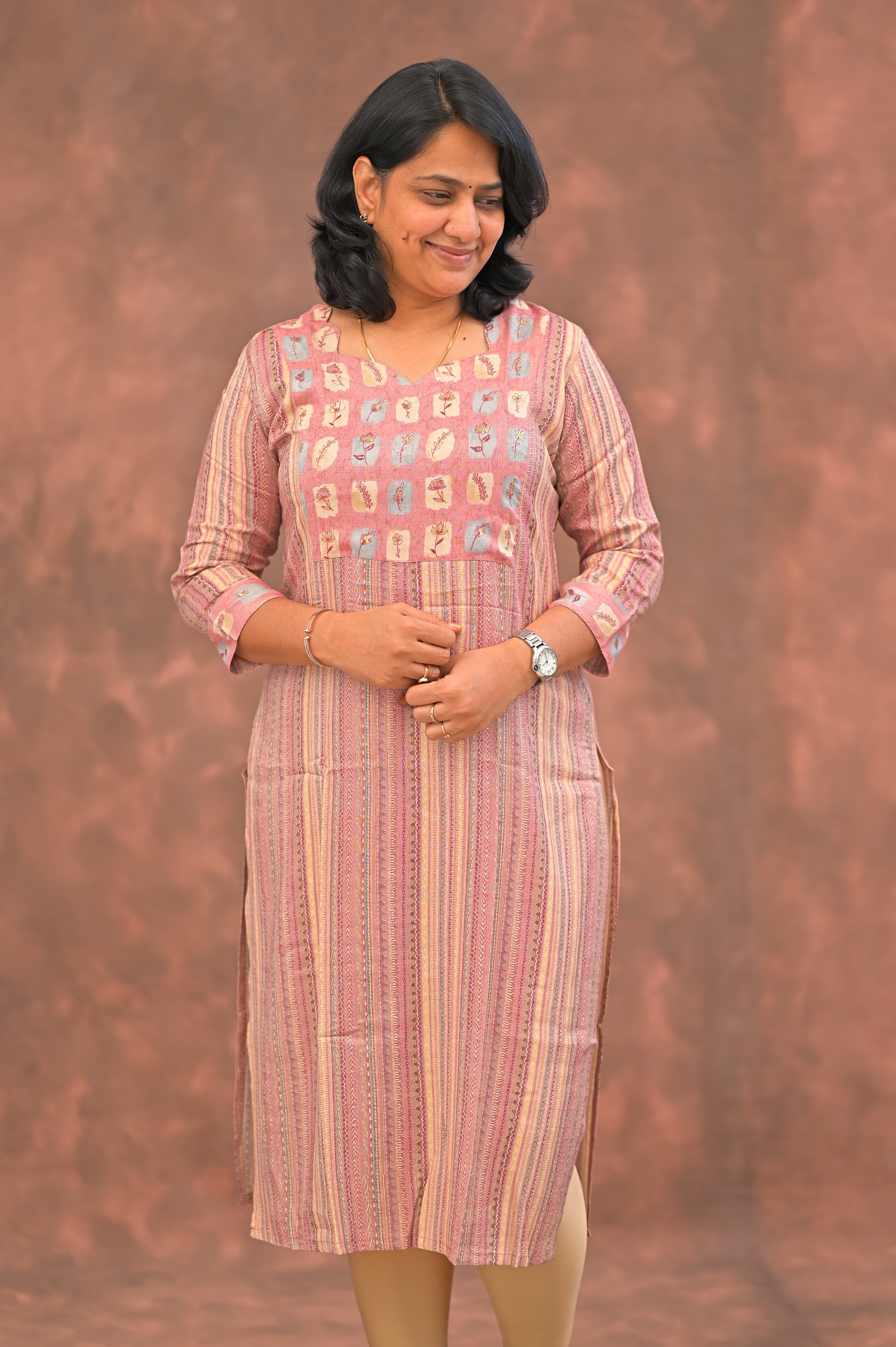 Step into effortless elegance with this soft pink kurti adorned in earthy vertical stripes and a charming square-printed yoke. The subtle combination of pastel peach, muted mauve, and beige hues evokes a rustic, artisanal feel, all-day comfort.